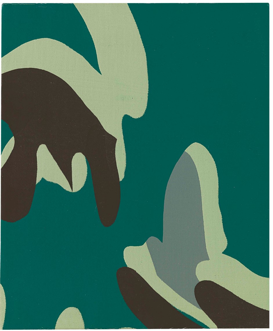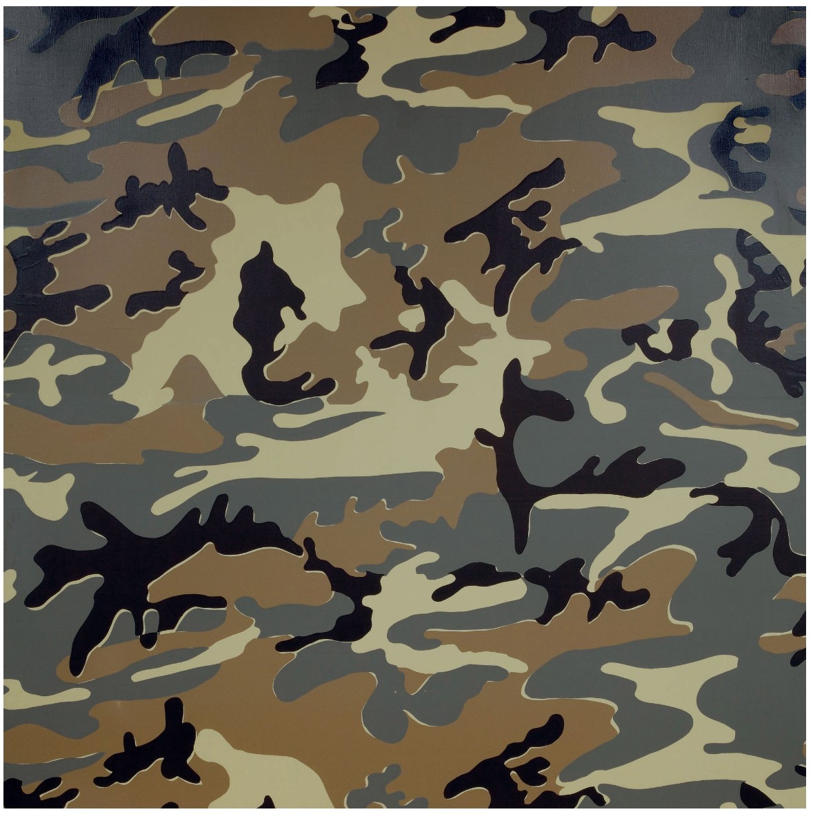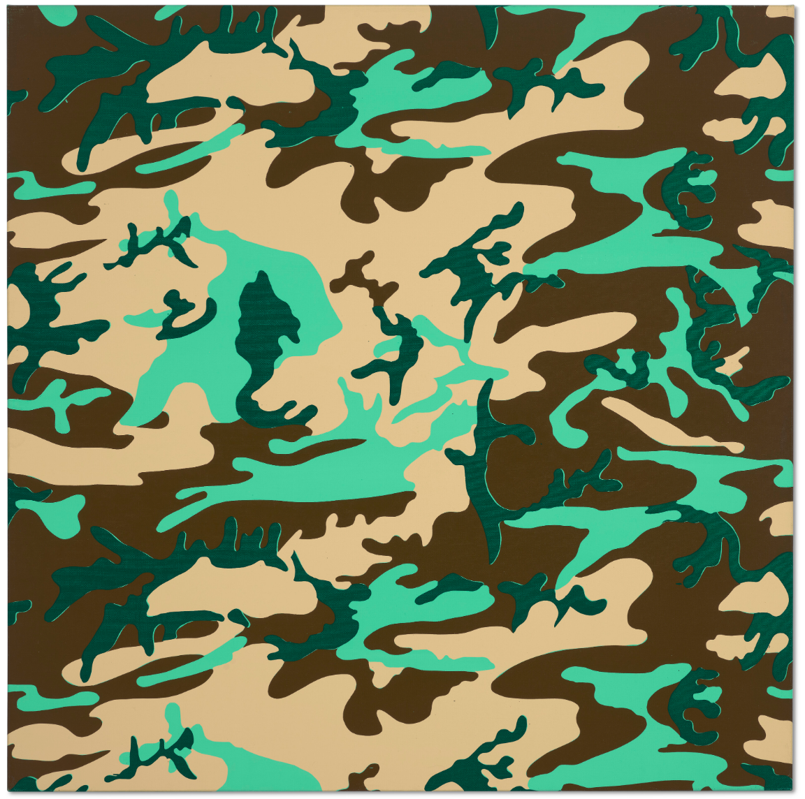 Andy Warhol modeled his four-color pattern upon a swatch of camouflage netting purchased at an army and navy store on Fifth Avenue. Warhol cropped and selected areas of the sample, so that whilst many of the works in this series have the same underlying pattern, the repetition of the pattern has certainly been manipulated in the silk-screening process. Together with the unique color and paint application and differing canvas sizes, each work is quite different from the other.