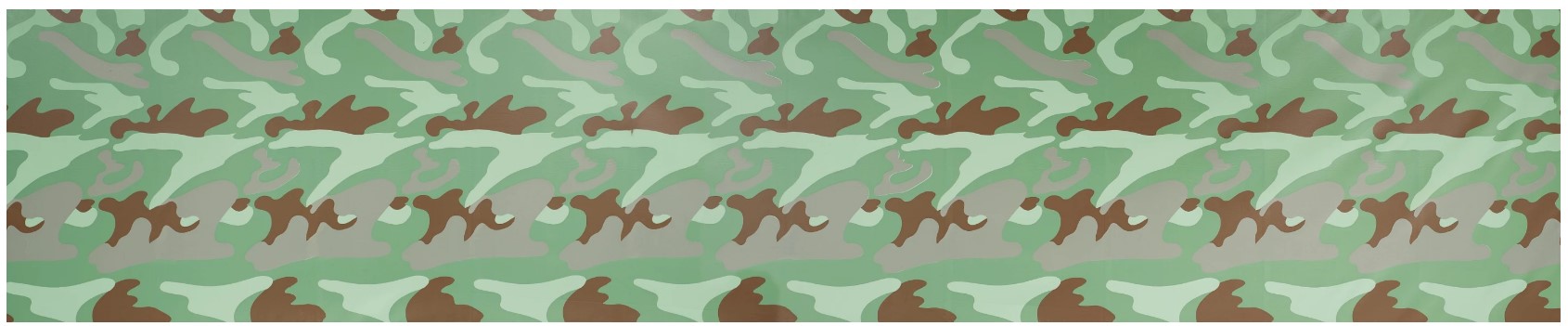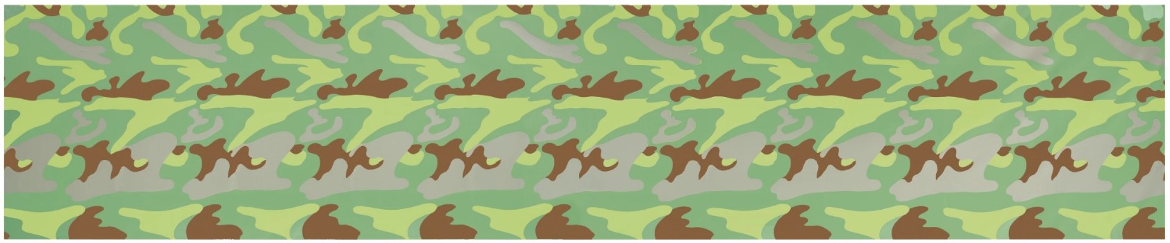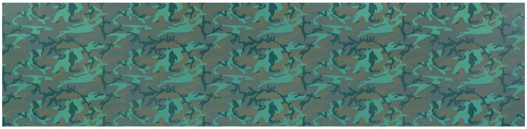 Spanning over thirty-three feet and reaching more than six feet high, Camouflage is engrossing in scale and mesmerizing in its seemingly limitless repetition. Warhol’s signature serialization aesthetic is flawlessly on display here in the seamless continuation of the camouflage pattern across the vast canvas. Inherently abstract, yet immediately recognizable and laden with distinct social and cultural significance, the camouflage design is transformed in the present work into an even more powerfully elegiac painting.  Eerily prophetic of the artist’s death in 1987, it may be the final puzzle in what was a gloriously enigmatic life and body of work. The large scale Camouflage murals have a seductive and suggestive star quality that Warhol always desired, and thus it is fitting that these canvases convey one of his final bursts of creativity.  Using a sample of fabric purchased from an Army surplus store as his subject, Warhol manipulates the inherent properties of the camouflage pattern to entirely obfuscate any artistic impulse towards figuration or narrative. In the present work Warhol wholly denies our attempts to glean any meaning from beneath the repeated pattern. Warhol’s genius for irony is seemingly most dramatic in the employment of disguise in the act of revelation. Here, the abstract images refuse revelation and through this denial, the artist appears to be, in the final analysis, unknowable to the viewer.