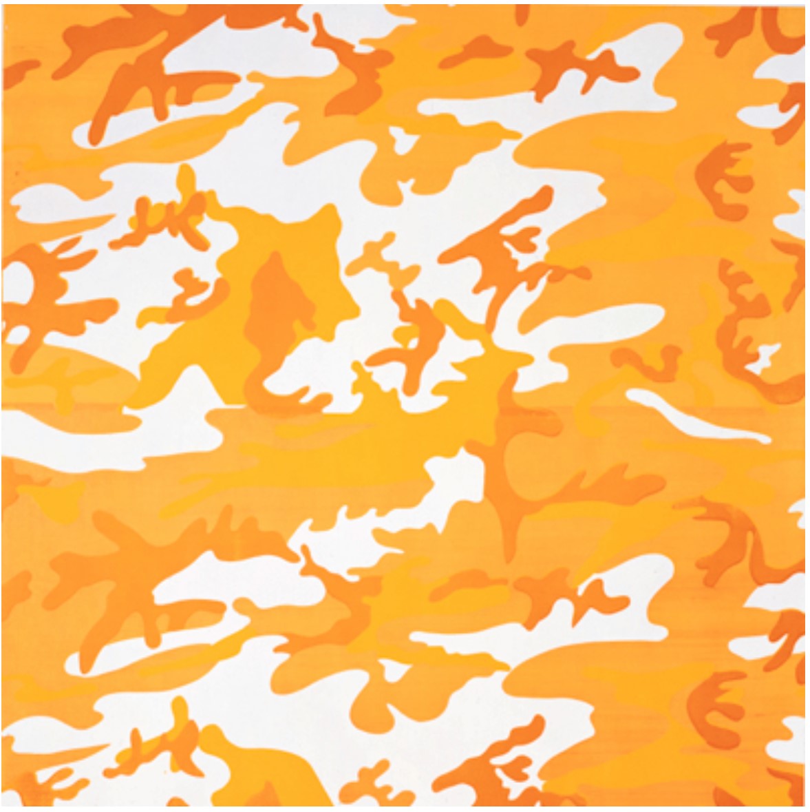 Camouflage from 1987 stands as a seminal example of Andy Warhol’s final forays into abstraction. Executed in the twilight of his career, shortly before his untimely death – and after a decade dominated by celebrity portraiture (1978–1987) – the present work embodies a series of audacious experiments in reconfiguring the utilitarian motif of military camouflage into an exuberant declaration of aesthetic ingenuity. Employing a four-color pattern derived from a swatch of camouflage netting procured at an Army and Navy store on Fifth Avenue, Warhol elevates a design originally intended for concealment and survival into a bold emblem of contemporary culture. Presenting an ostensibly endless expanse of yellow and orange, the composition evokes both the brilliance of military insignia and the playful optimism that characterizes Warhol’s later oeuvre. Meticulous layering of paint and ink, combined with deliberate variances in the repetition of the pattern, produces a dynamic surface in which uniformity is subverted by the interplay of chance and process, thereby underscoring the intrinsic tension between control and spontaneity inherent in Warhol’s signature silkscreen medium. Acting as an enigmatic and unifying ground, Warhol’s Camouflage appears in other significant paintings including the iconic self-portraits from the same year, versions of which reside in the Metropolitan Museum of Art New York and the Philadelphia Museum of Art.