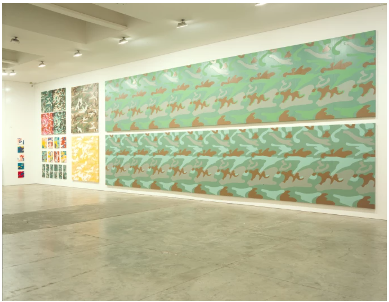 Warhol’s initial inspiration for using the ubiquitous print came from his studio assistant Jay Shriver who had been experimenting with painting through this mesh.  Of all his series of silkscreen paintings Warhol embraced perhaps the most variety in his use of screens and colors, working originally on a number of tracings from a single swatch of military fabric. At Rupert Smith’s silkscreen studio, Warhol would take great direction over the placement and composition of the screens. Whilst the overall effect is perhaps the most clean-cut amongst his oeuvre, the camouflage pattern allowed Warhol to experiment and exploit the potential for variation within the screen-printing process as well as the ambiguity of signs.