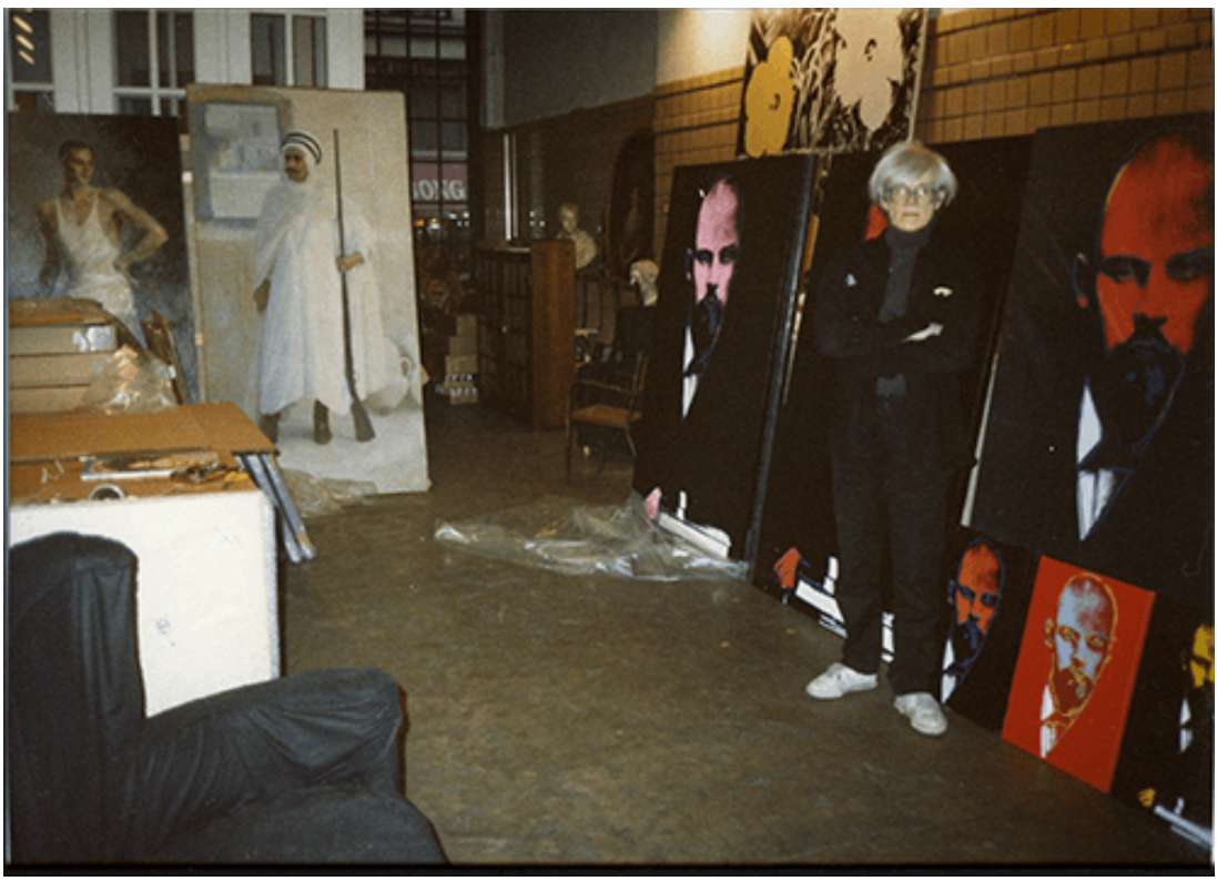 Andy Warhol in front of the Lenin works at his Factory, February 1987. Photo: Bernd Klüser, Courtesy Galerie Klüser © 2021 The Andy Warhol Foundation for the Visual Arts, Inc. / Licensed by DACS, London.
