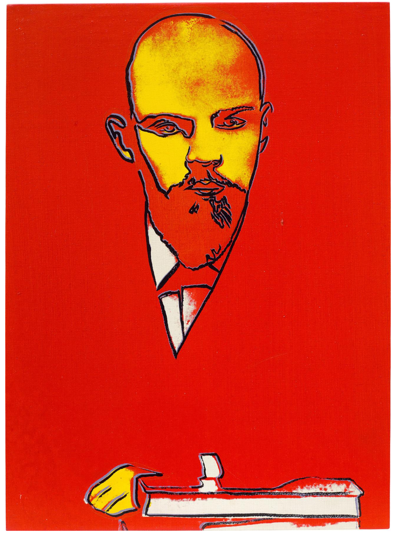 Conceptually connected to Warhol’s earlier Hammer and Sickle and Mao series of the 1970s, the Lenin works belong to the last series completed by the artist at the end of 1986, just months before his death the following year. Based on an unusual photograph of Lenin acquired by a friend of Warhol’s publisher and gallerist Bernd Klüser, Lenin shows the Russian revolutionary as a young man with a sharply focused stare, his arm resting authoritatively on a pile of books, emphasizing the intellectual roots of his political philosophy. Instantly recognizable as one of the most important political and cultural figures of the 20th century, Warhol has reduced the figure to the most basic elements of line and color. Consisting of just five colors – luminous yellow patches highlighting the face and hands, the sharp white triangles of his shirt collar and cuffs, and the heavy black outline edged in electric blue drawing out key details of the figure against the overwhelming wash of deeply saturated red.