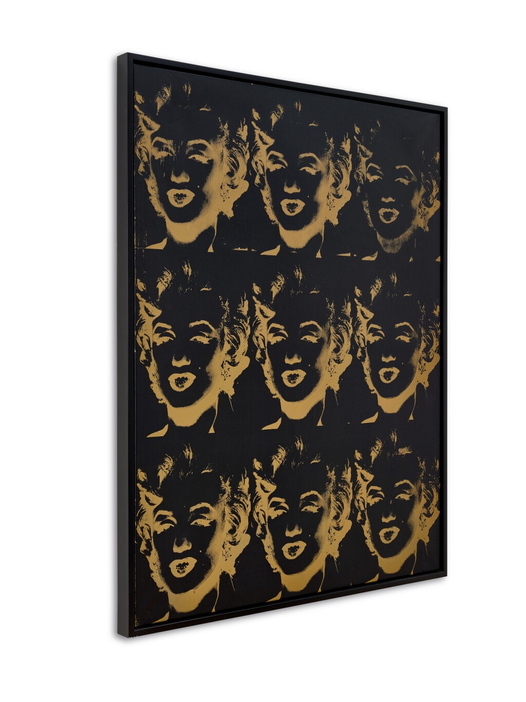 At the beginning of the 1980s, after a decade devoted mostly to portrait commissions, Warhol re-invigorated his practice. In line with appropriationist strategies of burgeoning artists such as Richard Prince and Cindy Sherman, Warhol began to quote from and interrogate his own 1960s iconography. Appropriating Warhol the ‘brand’, Nine Gold Marilyns presents an ornamental x-ray recapitulation of one of the most captivating and celebrated inquiries of his career. Akin to the unique quality of Warhol’s large Gold Marilyn Monroe and the two Gold Marilyn Tondos, the present work is unique across the series of Reversals. Where the rest of the series is cast in swirling marks of lurid and fluorescent pigment, the unique gold ground of the present work recalls these early reliquary-like gold canvases. Akin to the ghostly screen of Warhol’s Marilyn tondos, Monroe’s repeated likeness appears as a floodlit negative. By plunging shadows and midtones into darkness, a ghostly dematerialisation of his subject comes to the fore; these shadowy faces appear reduced to their index, invoking a spectral imprint. Though maintaining recognition and legibility thanks to the iconicity of Monroe’s face, Warhol’s manipulations neutralise the power of the original image. The emphasis here is less on the celebrity of the sitter and more on that of the artist himself; less a depiction of the film star and more a reflection on Warhol’s own artistic past.