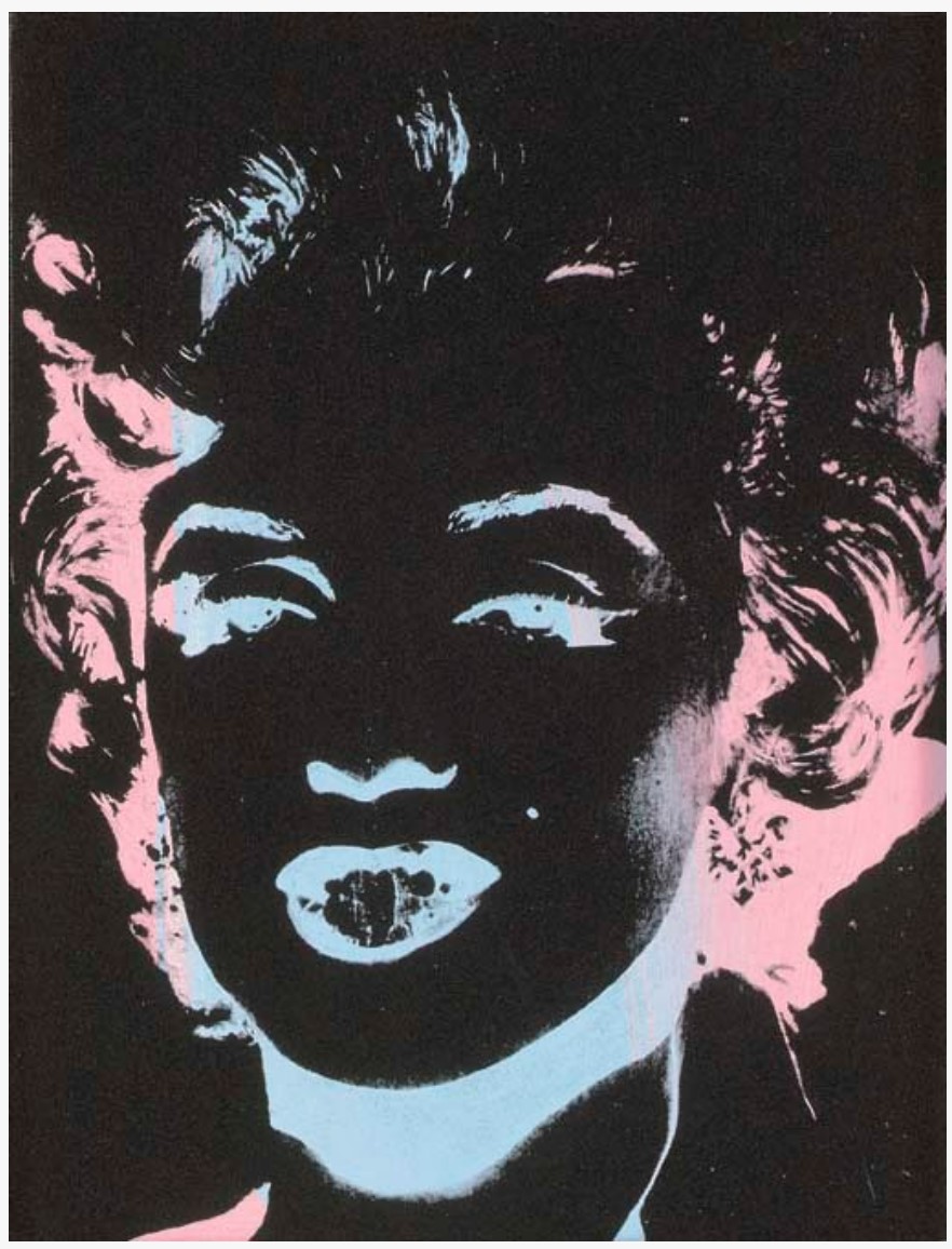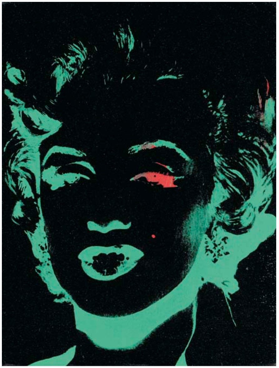 Warhol instinctively understood the Marilyn brand as an industrialized construct, designed for mass consumption like a Coca-Cola bottle or Campbell’s Soup Can, and radically revealed it as a precisely composed non-reality. Of course, Marilyn offered Warhol the biggest brand of all, and he accentuated this by choosing a manifestly contrived version of Marilyn as the definitive sex -symbol. Although this image of Marilyn has come to stand as the instantly recognizable emblem of her global fame, encapsulating as it does so perfectly every aspect of her enduring allure, it is an entirely dehumanized portrait, devoid of any of the psychosomatic realities that proved ultimately fatal for Norma Jeane Mortenson on the night of 5 August 1962. Moreover, the negative reversal of her image magnifies the ghostliness of her visage, resulting in a compellingly haunting memorial to the screen siren. Even after the brutal reality and terminal tragedy of her suicide, the artificial veneer of a projected image remains the enduring legacy of a human life.