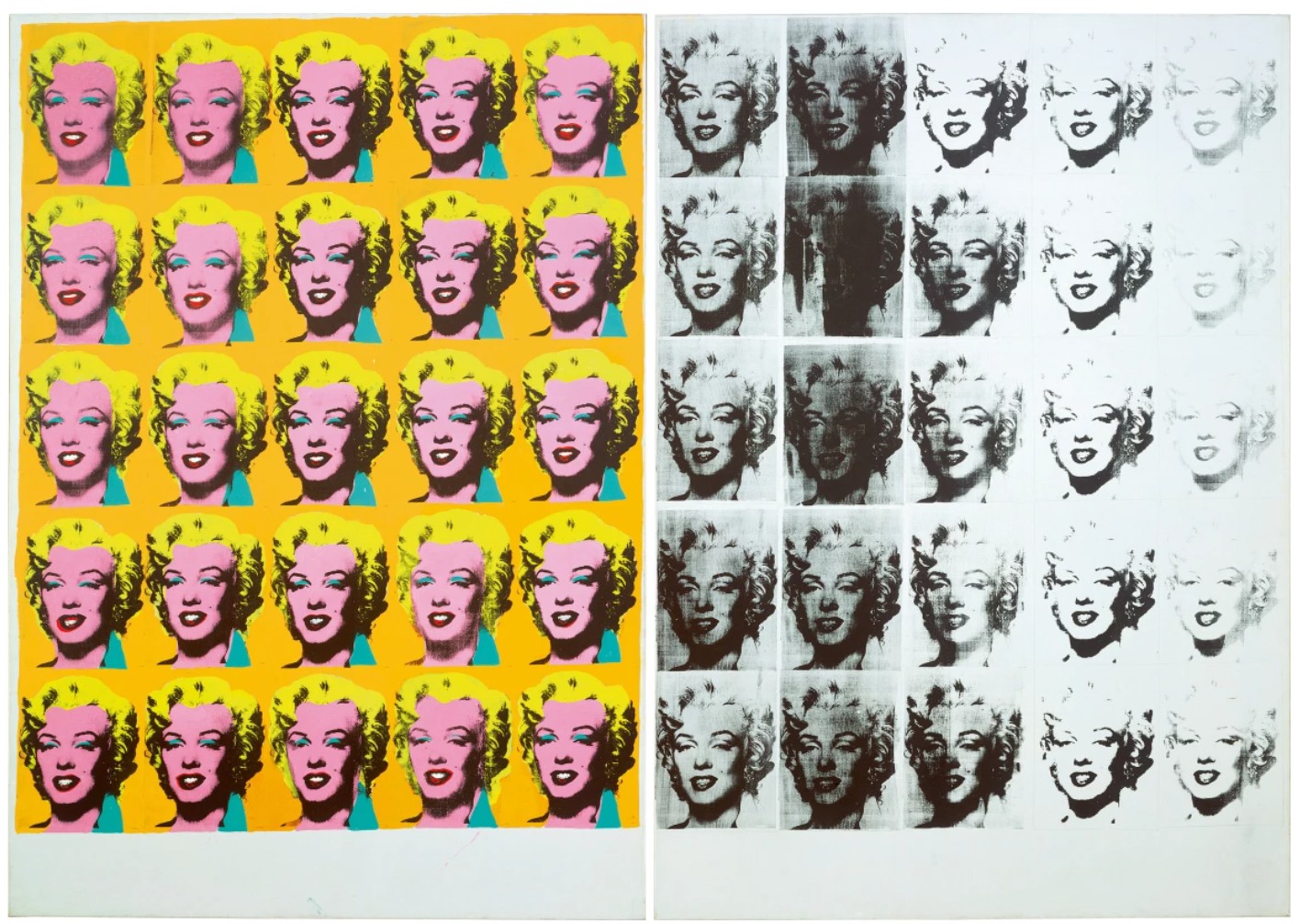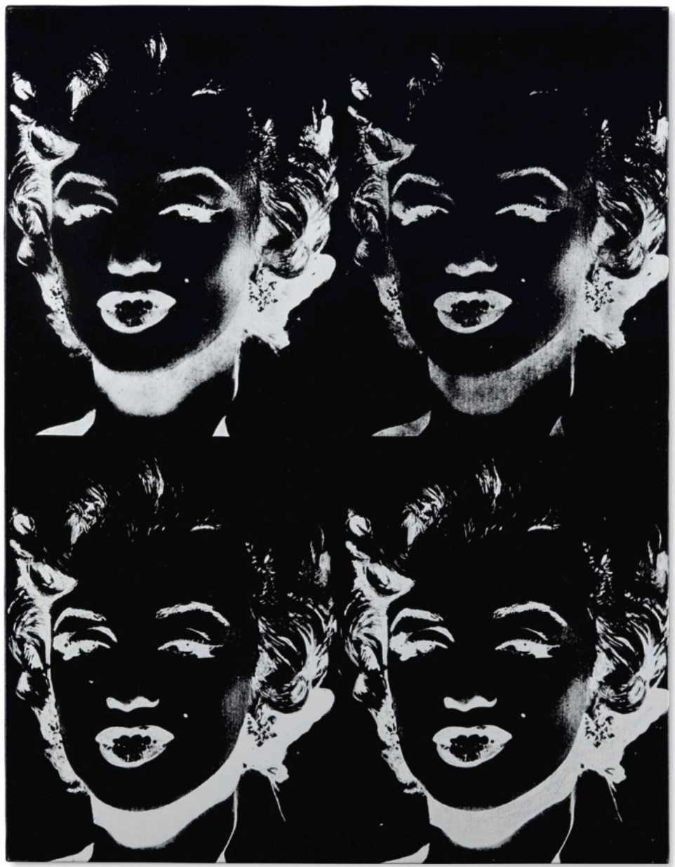 A singular force behind his next thirty years of artistic production, Warhol’s muse came in the form of a femme fatale — both beautiful and tragic. Though Monroe and Warhol never exchanged a single word or glance, their souls seemed fated to connect. Sharing a number of character traits — namely their inherently paradoxical identities, steeped in dichotomies of public life versus shyness, celebrity versus tragedy — it only appeared natural that Warhol would choose Marylin — a mirror of sorts — as his muse. ‘The irony of Andy Warhol’s “Marilyn” is that it is an icon of an icon created by an icon’. It is perhaps this similarity, and the immortalization of this similarity in Marylin’s portrait, that unites them most strikingly. As the negative is usually the ‘original’ from which a photograph is printed, there was a certain paradox in the idea of making ‘copies’ of earlier paintings in this negative form. In addition to representing an evolution of Warhol’s famed silkscreen technique, the series reflected the artist’s increasing fascination with shadow, as the darkest areas in the original images were transformed into the brightest highlights.