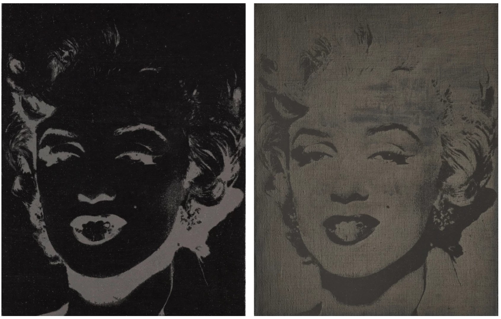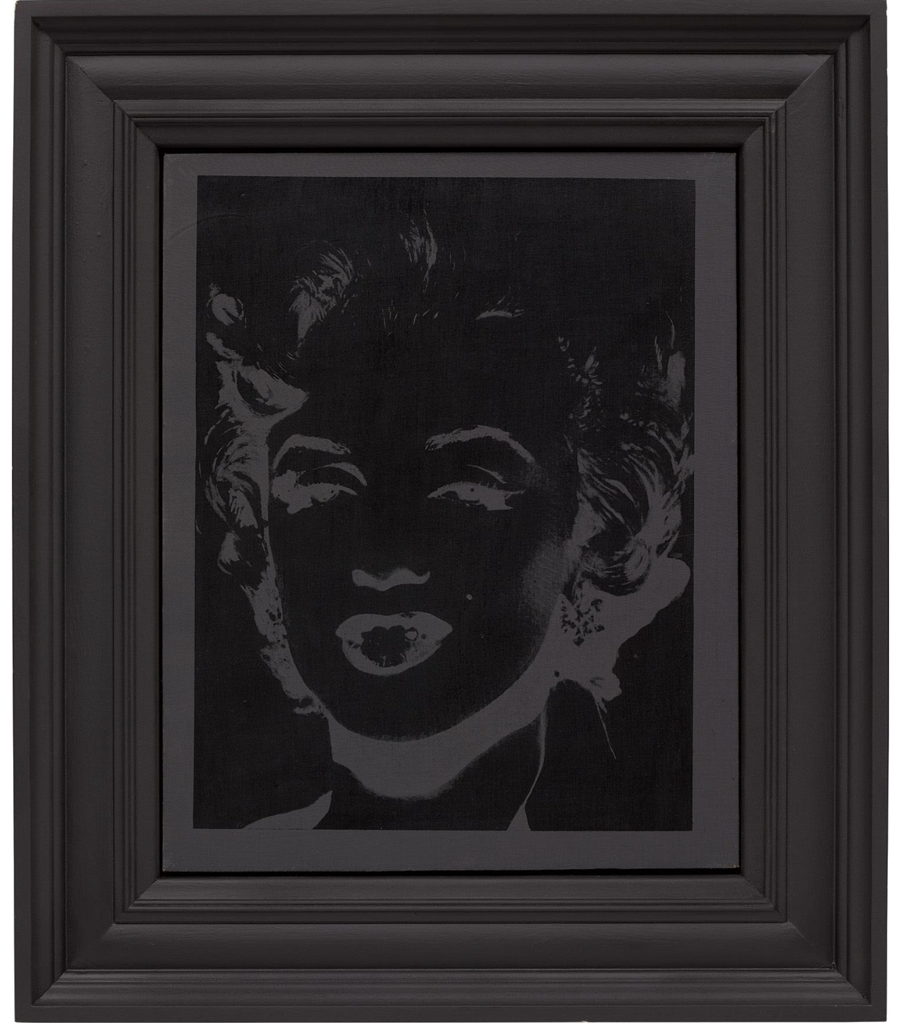 In the present work Marilyn’s visage emerges through shadow, recalling her presence on the silver screen that propelled her to global stardom. Yet here, the glamour appears diminished; the silver and black tones possess a delicate fragility, mirroring the transience of both life and fame. Her image was endlessly reproducible and perpetually desirable, yet shadowed by its own transience. Monroe represented the central logic of Pop Art: the conversion of ephemerality into iconography, and private suffering into public spectacle. In Marilyn (Reversal) we see the dematerialization of Munroe, as her image hovers in between absence and presence, suffused with darkness. Warhol identified Monroe as the ultimate artifact of mass culture and as a figure who epitomized this volatility between brand and personhood. Through Warhol’s silkscreen practice he replaced expressive artistic gesture with mechanical reproduction, mirroring the processes by which mass media transforms singular identities into reproducible, exchangeable images. His 1962 Marilyn series marked one of his earliest uses of the technique; thus in the present work we see Warhol call upon both the imagery and practice that defined the 1960s.