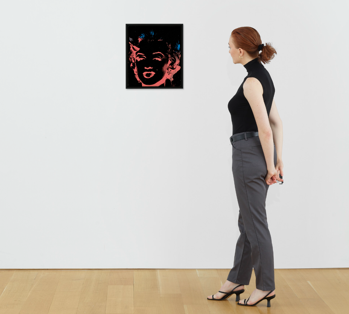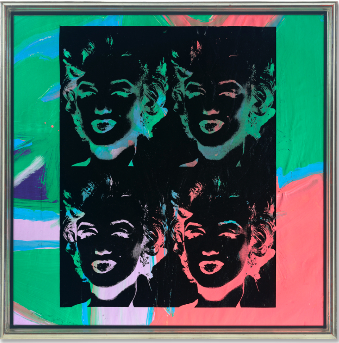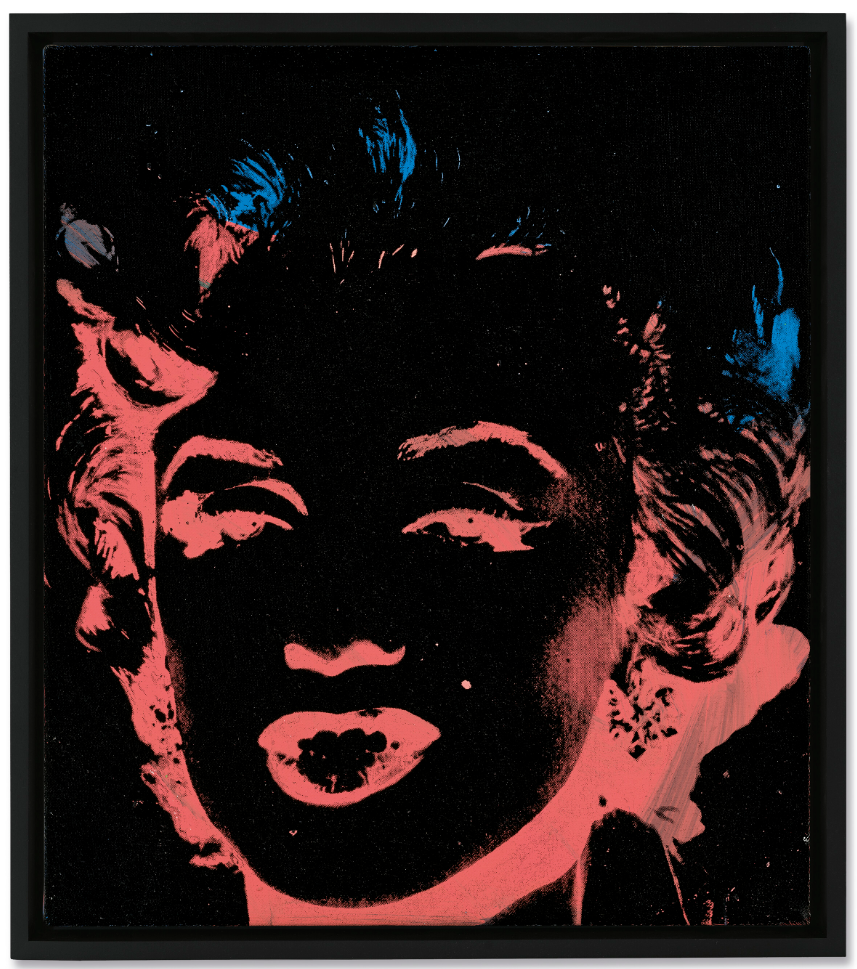 Pulsating off the surface of the canvas, Monroe’s distinctive features pierce the darkness in electric blue and coral pink. Her pouting lips, distinctive coiffure and beauty spot are immediately recognizable as belonging to one of the twentieth century’s greatest cultural icons. Warhol builds on his foundational use of a pre-existing 1950s publicity photo as his source, depicting Monroe here in a reverse or ‘negative’ version with the tonal values switched. This simple device infuses his familiar image with a new sense of freshness and relevancy. While revisiting his earlier oeuvre, the work’s vibrant transformation also looks forward and speaks directly to a new generation of Warhol’s peers. Warhol’s remarkable likeness of Marilyn Monroe was the perfect vehicle for his own project of reinvention. She had become one of the most iconic faces of the last half-century, and by the time Pop Art emerged was instantly recognisable around the world. Warhol regarded her as a kindred spirit; a fellow artist who was underappreciated by her peers and whose creative talents were often misunderstood and rarely appreciated for their nuances. The general public was quick to gauge Monroe’s physical attributes but few bothered to praise her talents as an actress and comedienne. Immediately after her tragic death on 5 August 1962, Warhol became so preoccupied by the idea of Marilyn as a media construct that he translated her photograph into an image that would go on not only define his career, but also the actress’s legacy too.