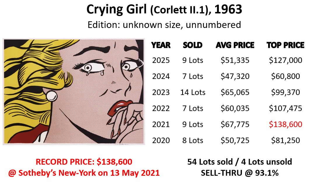 The auction record for Crying Girl is USD 138,600, price achieved at Sotheby’s in New-York on 13 May 2021.