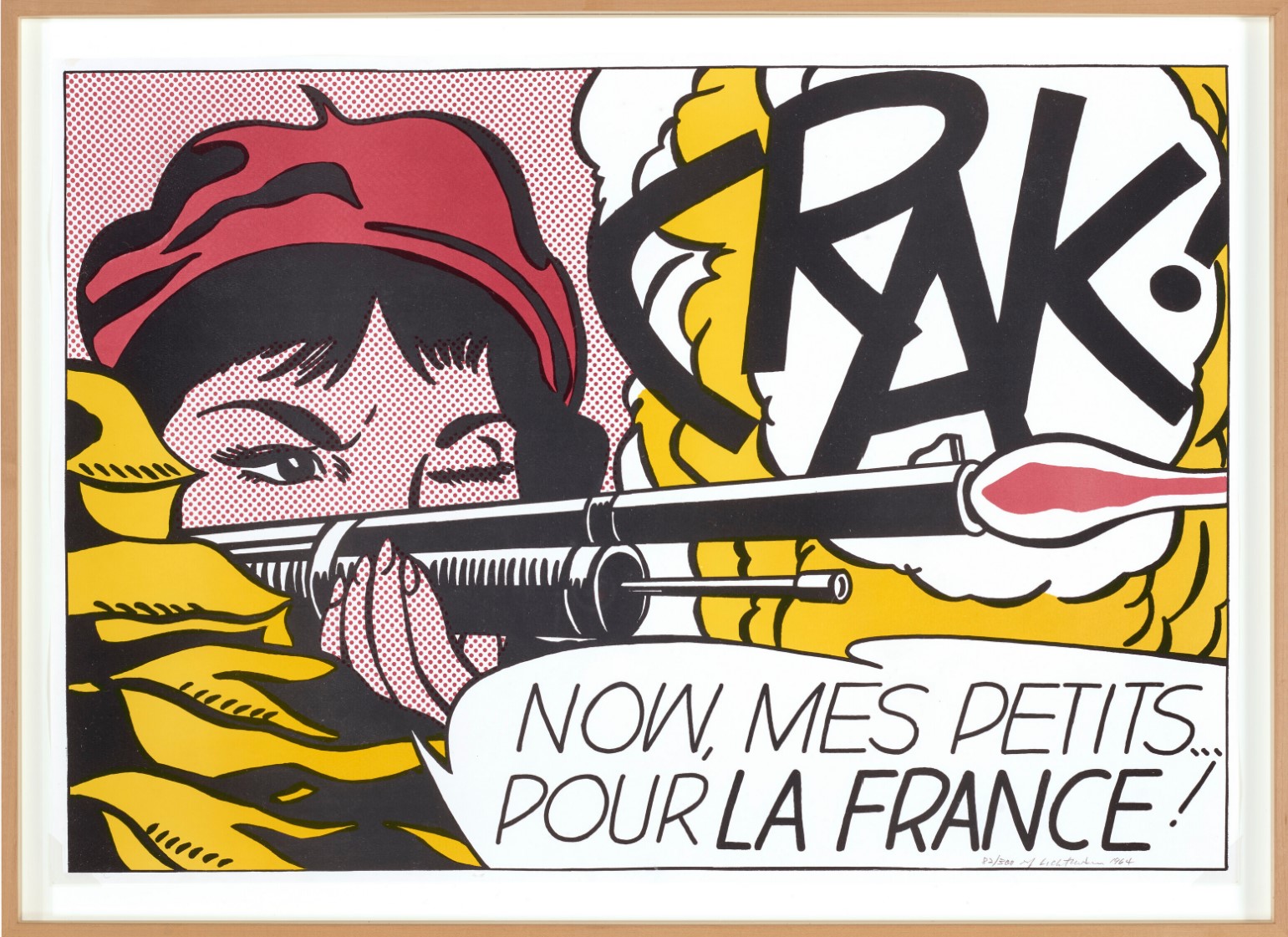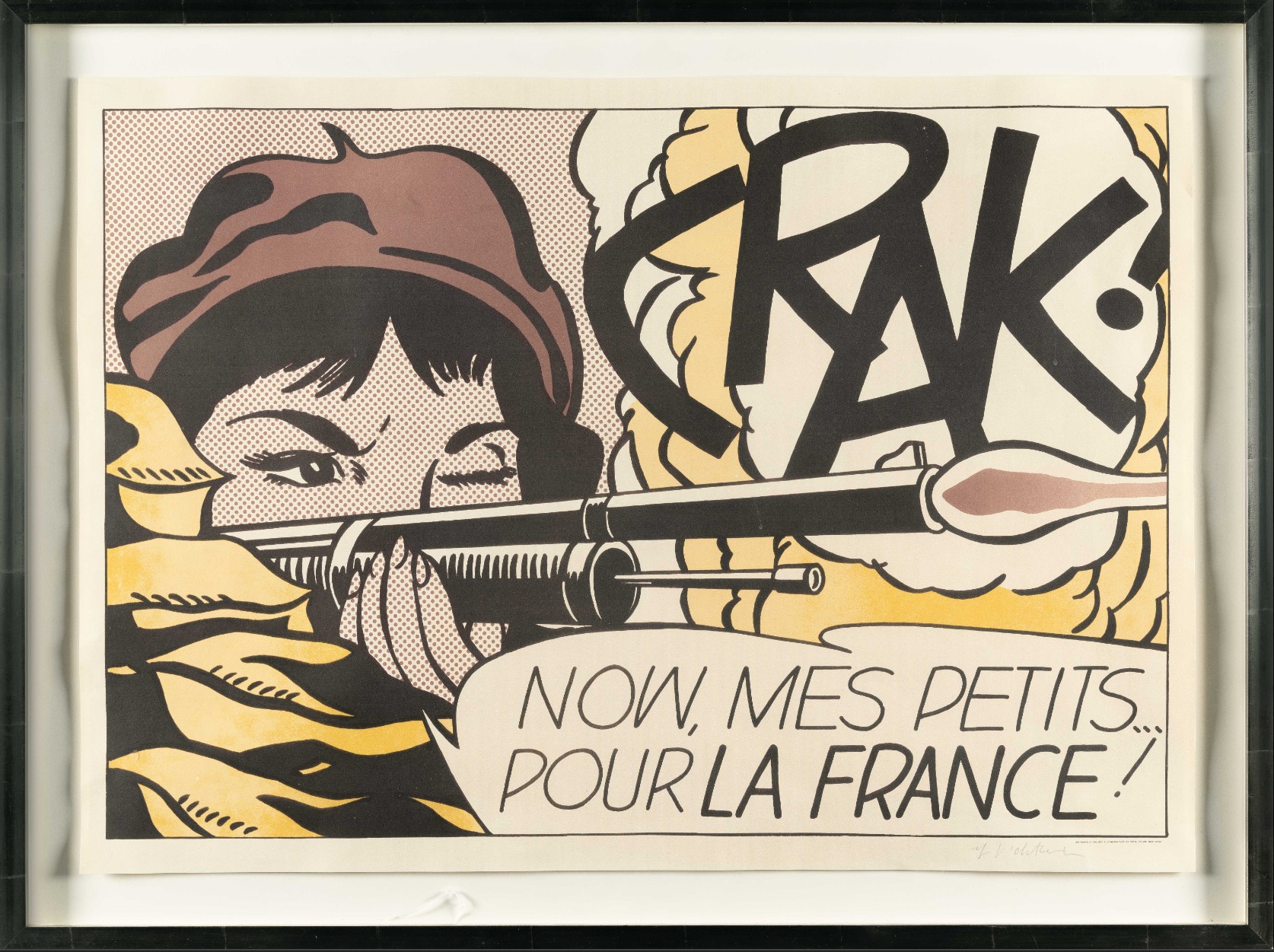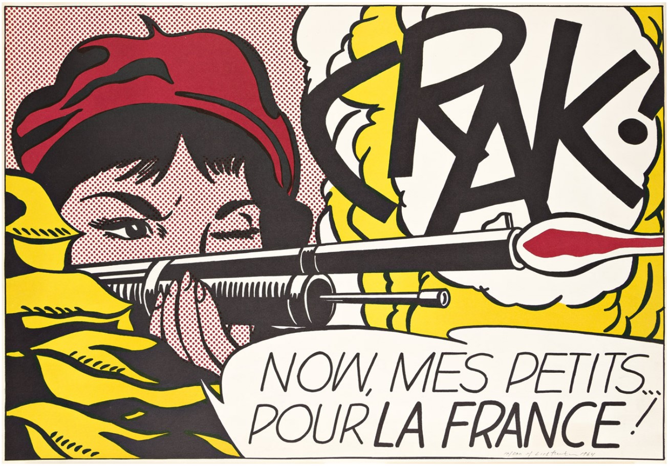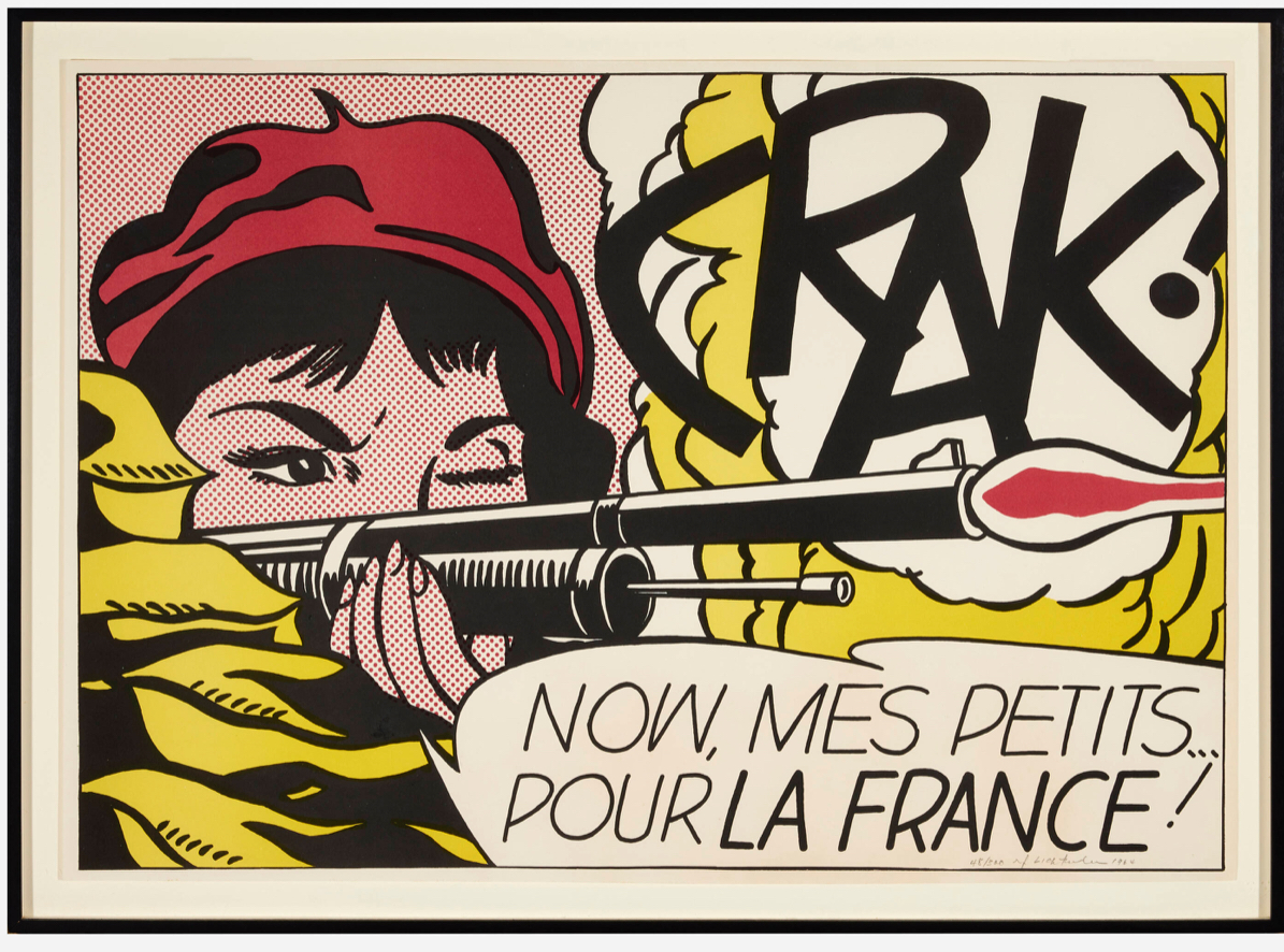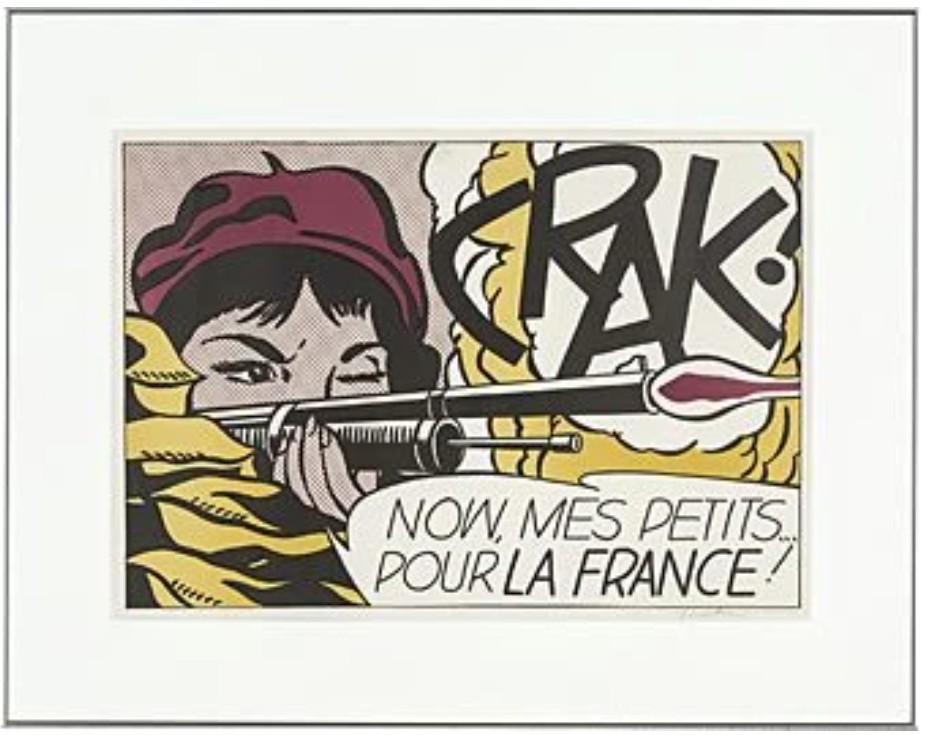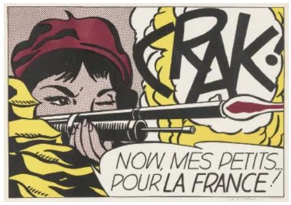 The French text introduces a layer of ambiguity that is both deliberate and destabilizing. “Pour la France!” evokes nationalist rhetoric, yet its placement within a stylized comic framework renders it ambiguous, almost performative. The phrase reads less as a sincere declaration than as a constructed slogan: something learned, repeated, and disseminated. Lichtenstein is not depicting war as lived experience. He is presenting war as image: flattened, aestheticized, and detached from consequence. The act of firing becomes graphic; the sound becomes typography; emotion becomes surface. The result is a quiet but incisive critique. Violence, patriotism, and identity are shown not as realities, but as visual codes: assembled, reproduced, and consumed.