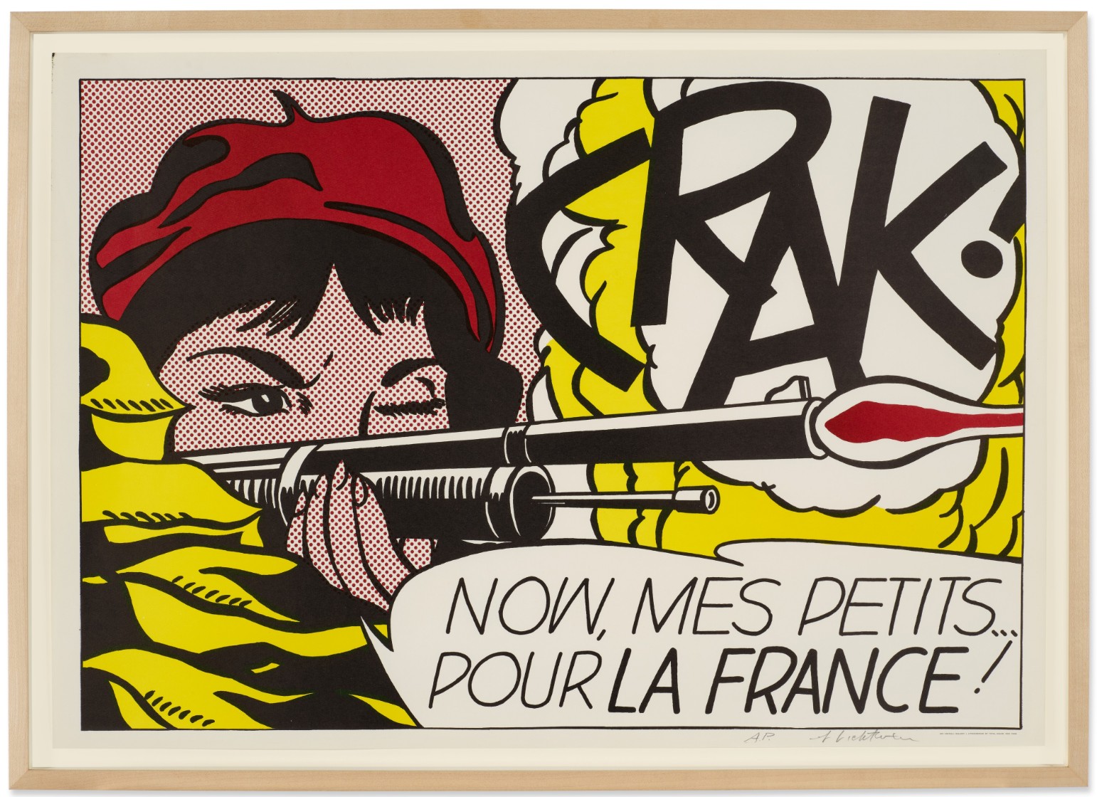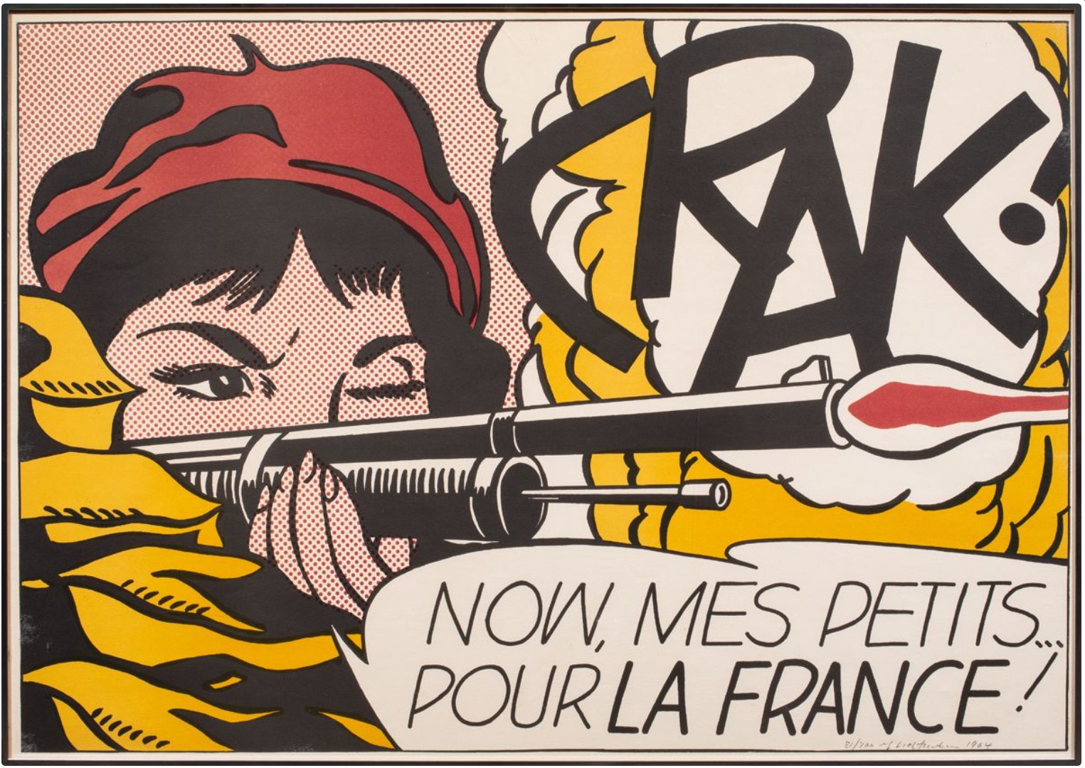 Executed as a screenprint, Crak! extends Lichtenstein’s investigation into the aesthetics of mechanical reproduction. The visual language is deliberately industrial: flat primary colors, bold black contours, and the disciplined application of Benday dots. The dots are not incidental, they function as both shading and structure, particularly in the rendering of the face and background. Their mechanical regularity contrasts with the apparent immediacy of the subject matter, reinforcing the central paradox of Lichtenstein’s work: an image of action produced through a system of restraint and repetition. The composition is tightly balanced. The red of the beret echoes the dot field, the yellow zones frame the figure, and the rifle acts as a stabilizing axis. Everything is controlled, even the moment of firing.