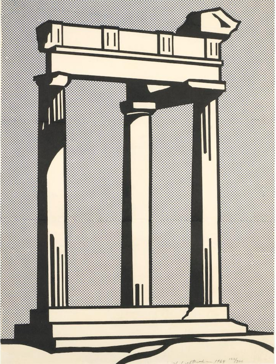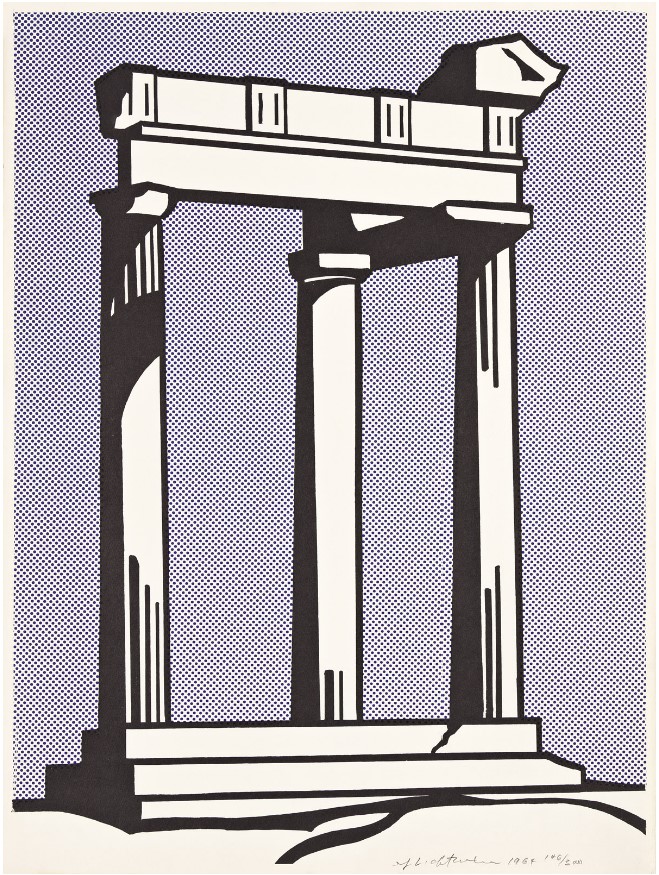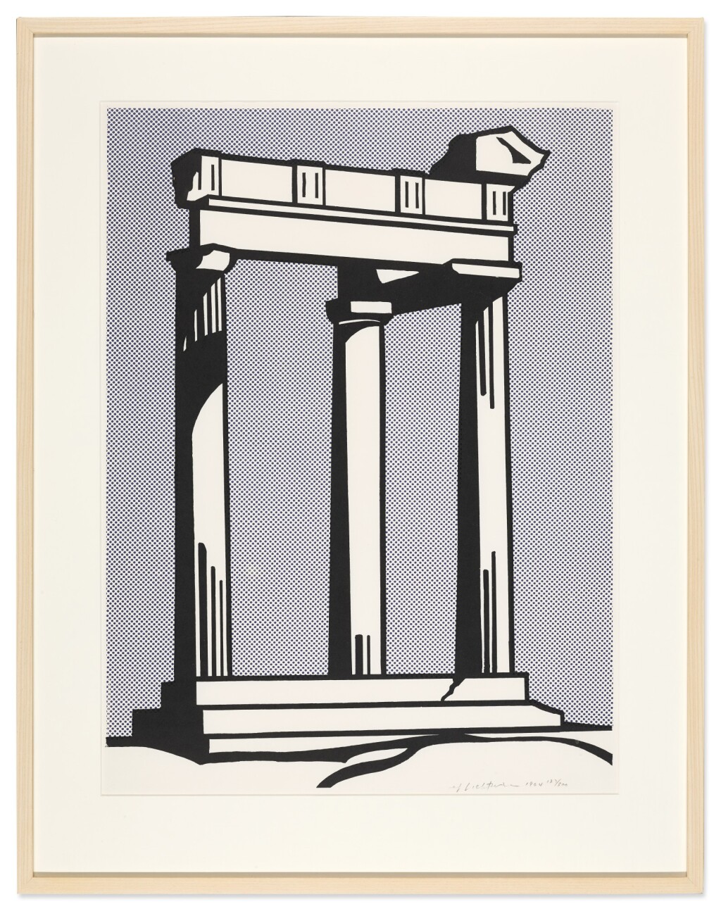 Rising up from a shimmering expanse of black and white Ben Day dots, the classical ruins of Temple stand isolated in monumental grandeur against an empty horizon. Devoid of environment and detail, Lichtenstein enhances the graphic clarity of the temple whilst highlighting the incongruity between artistic depiction and reality. Temple epitomizes Lichtenstein’s natural awareness of line and form becoming an exquisite and seemingly effortless essay in the art of illusion. The drama of Lichtenstein’s distinctive signature technique is fully realized. Temple is one of Lichtenstein’s most iconic images; a motif that is synonymous with American Pop Art as well as Lichtenstein’s remarkable contribution to visual culture and awareness in the 20th century.
