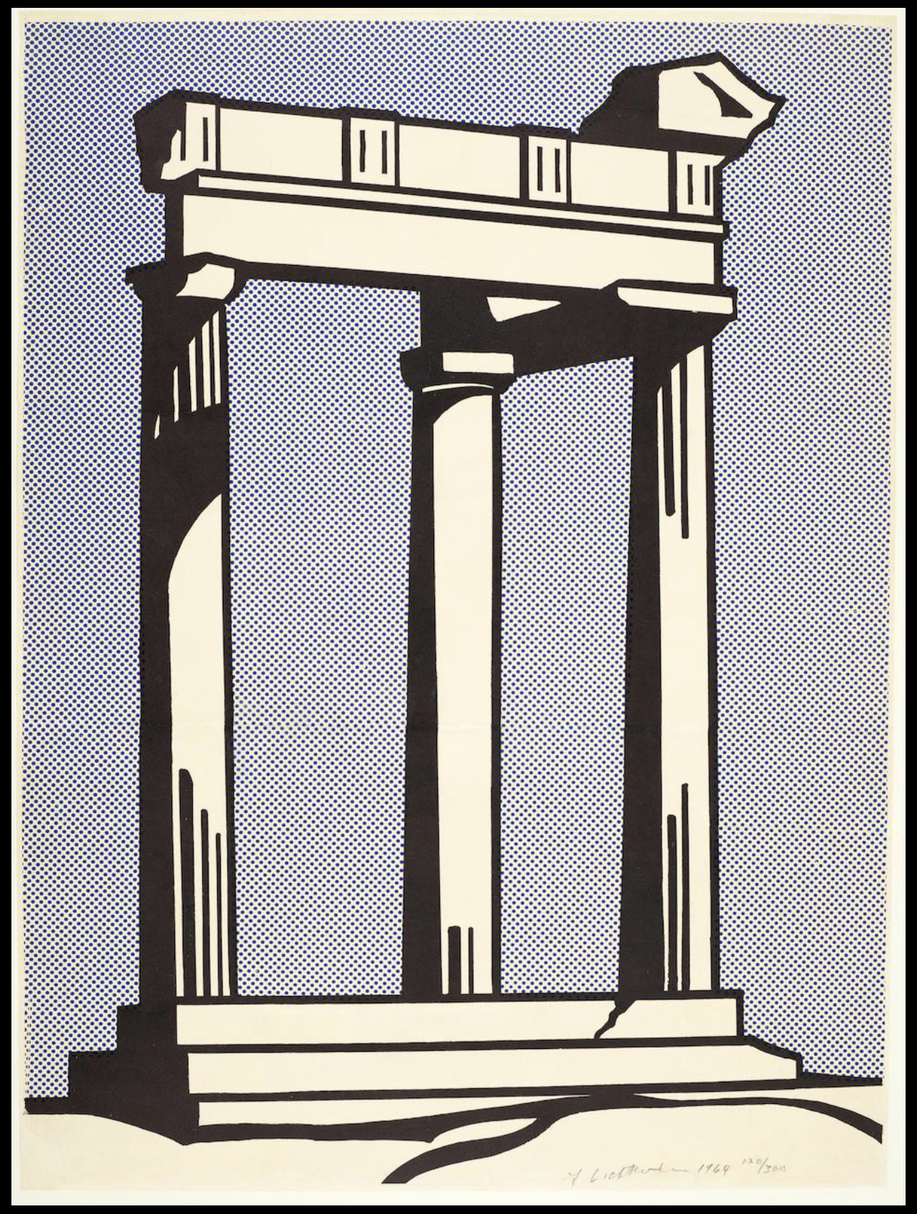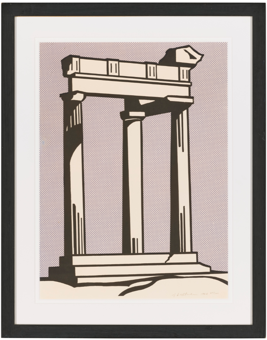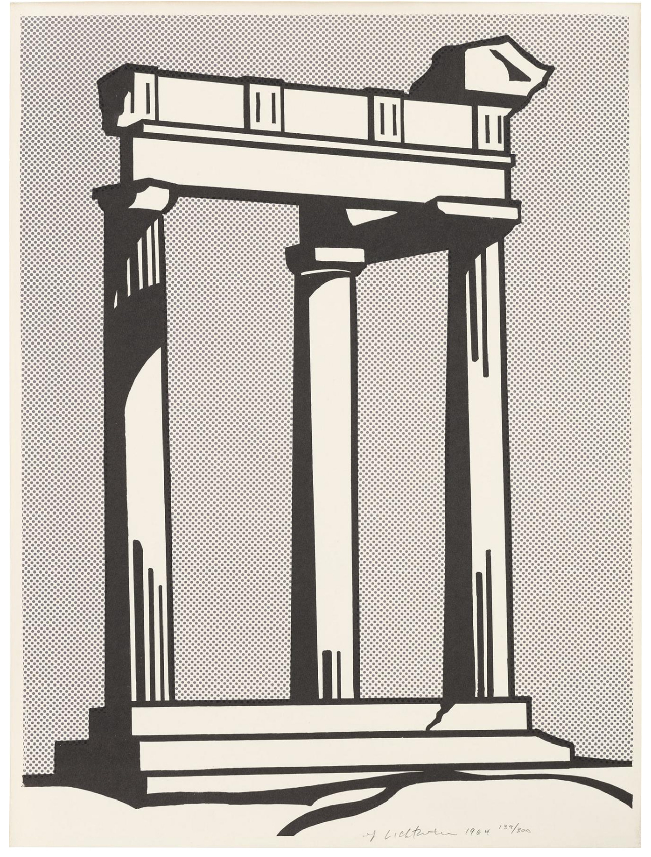Rising up from a shimmering expanse of black and white Ben Day dots, the classical ruins of Temple stand isolated in monumental grandeur against an empty horizon. Devoid of environment and detail, Lichtenstein enhances the graphic clarity of the temple whilst highlighting the incongruity between artistic depiction and reality. Temple epitomizes Lichtenstein’s natural awareness of line and form becoming an exquisite and seemingly effortless essay in the art of illusion. The drama of Lichtenstein’s distinctive signature technique is fully realized. Temple is one of Lichtenstein’s most iconic images; a motif that is synonymous with American Pop Art as well as Lichtenstein’s remarkable contribution to visual culture and awareness in the 20th century.