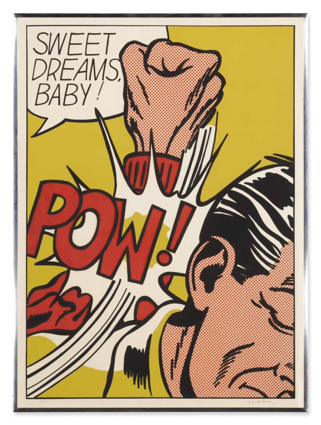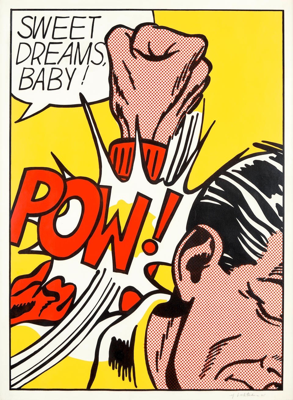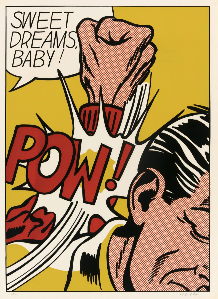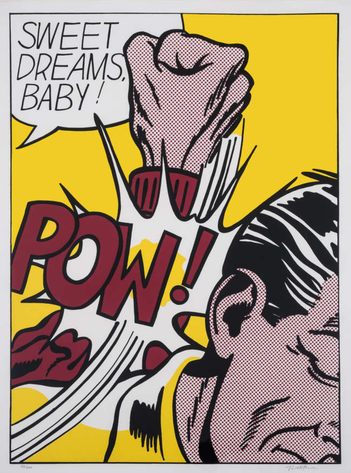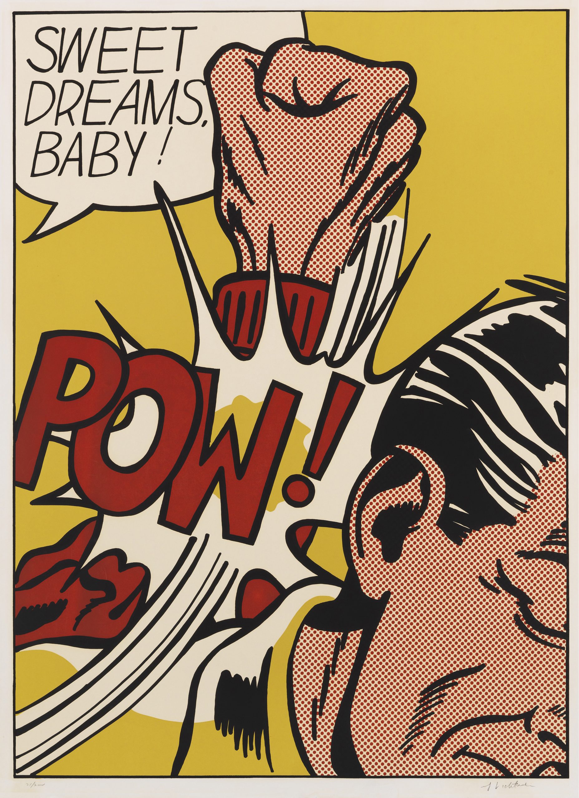 Sweet Dreams Baby! is probably one of Lichtenstein’s most iconic and powerful prints. It is a quintessential example of his Pop Art style, transforming a fleeting moment of comic-book violence into a monumental, ironic fine art statement. The image captures an explosive moment of violence in a highly graphic, cropped format. A large, muscular fist, rendered with heavy black outlines and yellow Ben-Day dots for shading, is shown hitting an unseen figure or object (the edge of a face is just visible). The point of impact is signified by a burst of graphic energy lines and the bold, onomatopoeic word “POW!” rendered in vivid yellow and black. The phrase “SWEET DREAMS, BABY!” floats in a speech bubble above the action. The text is ironically affectionate, providing a jarring and humorous contrast to the aggressive visual act below.