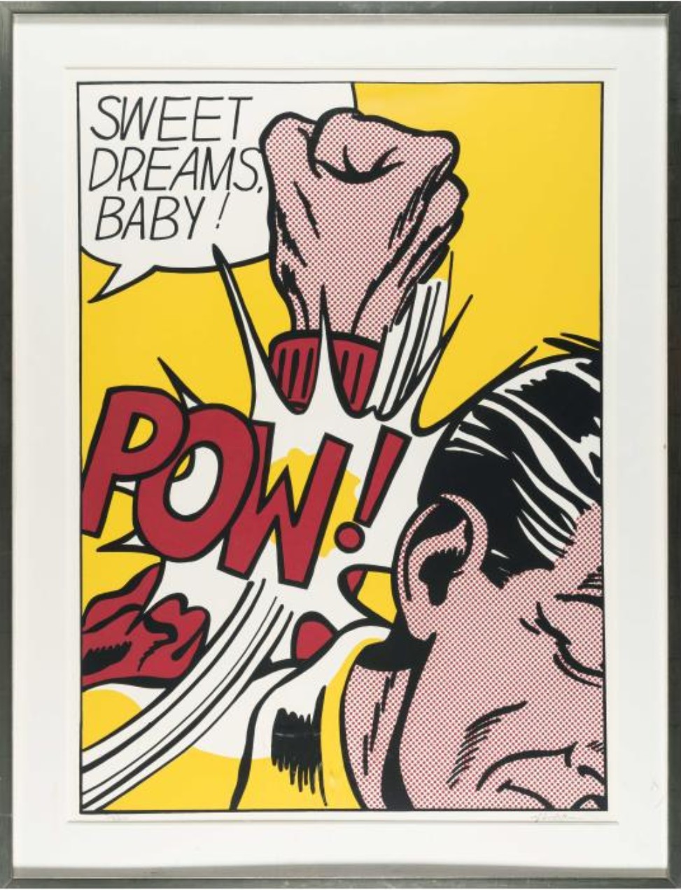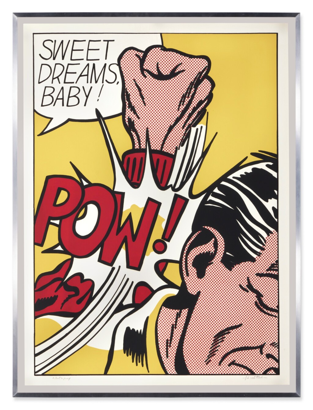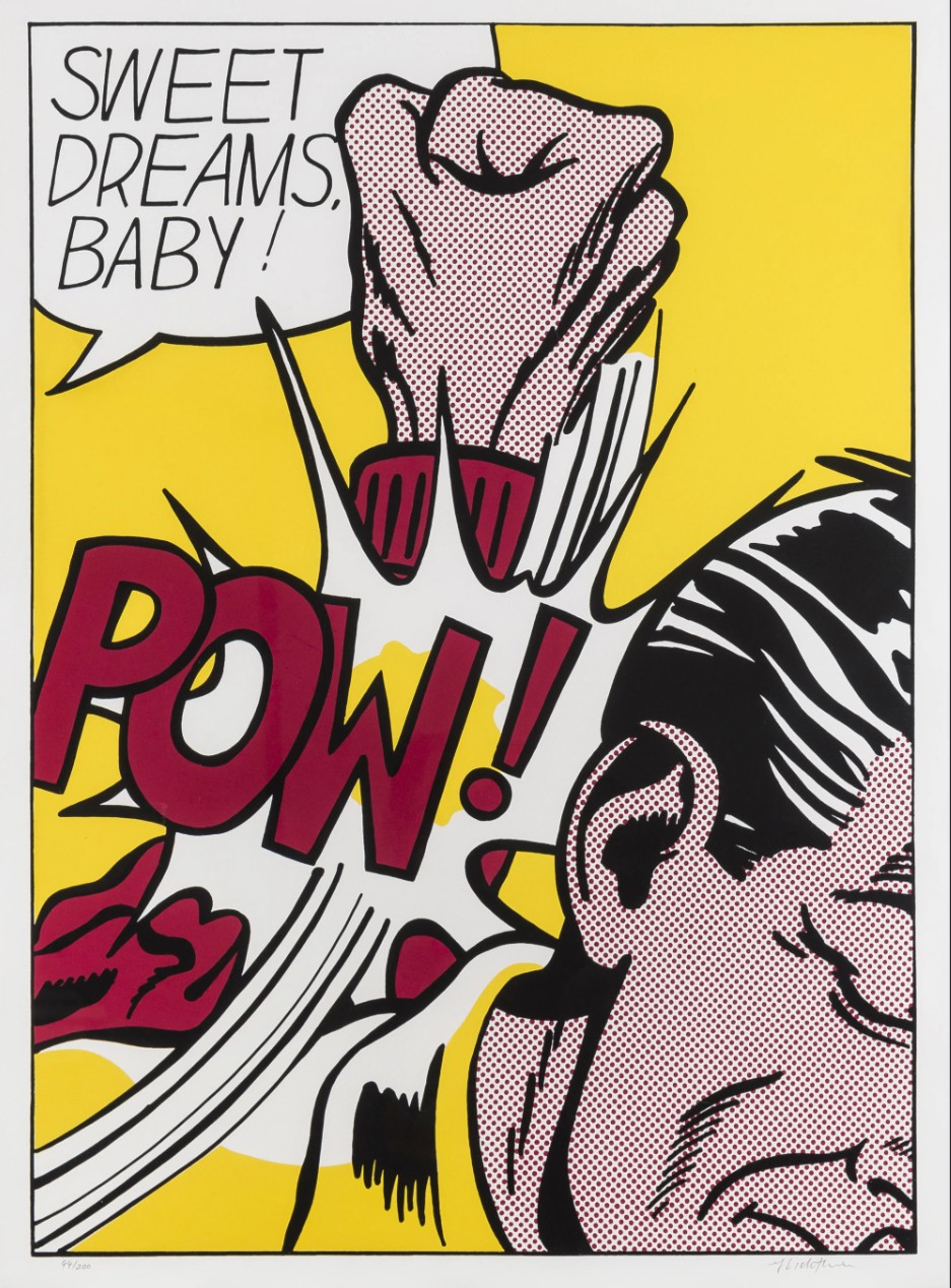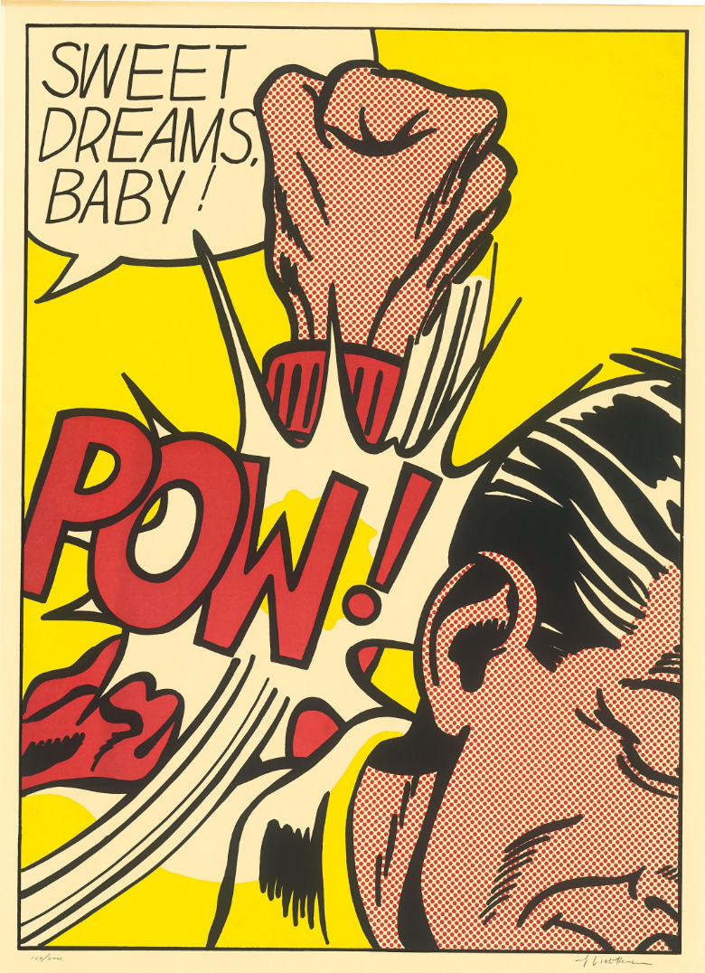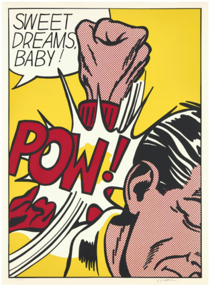 Sweet Dreams Baby! is probably one of Lichtenstein’s most iconic and powerful prints. It is a quintessential example of his Pop Art style, transforming a fleeting moment of comic-book violence into a monumental, ironic fine art statement. The image captures an explosive moment of violence in a highly graphic, cropped format. A large, muscular fist, rendered with heavy black outlines and yellow Ben-Day dots for shading, is shown hitting an unseen figure or object (the edge of a face is just visible). The point of impact is signified by a burst of graphic energy lines and the bold, onomatopoeic word “POW!” rendered in vivid yellow and black. The phrase “SWEET DREAMS, BABY!” floats in a speech bubble above the action. The text is ironically affectionate, providing a jarring and humorous contrast to the aggressive visual act below.