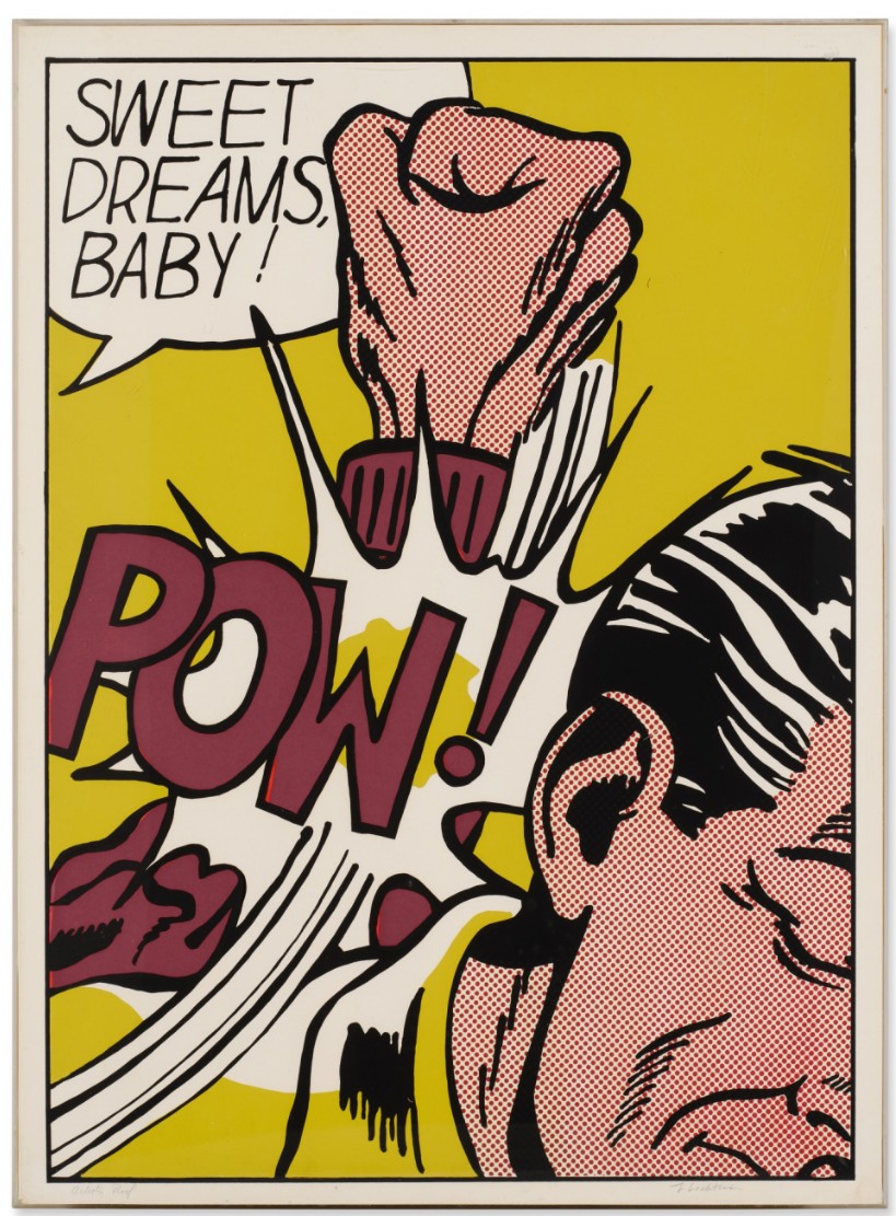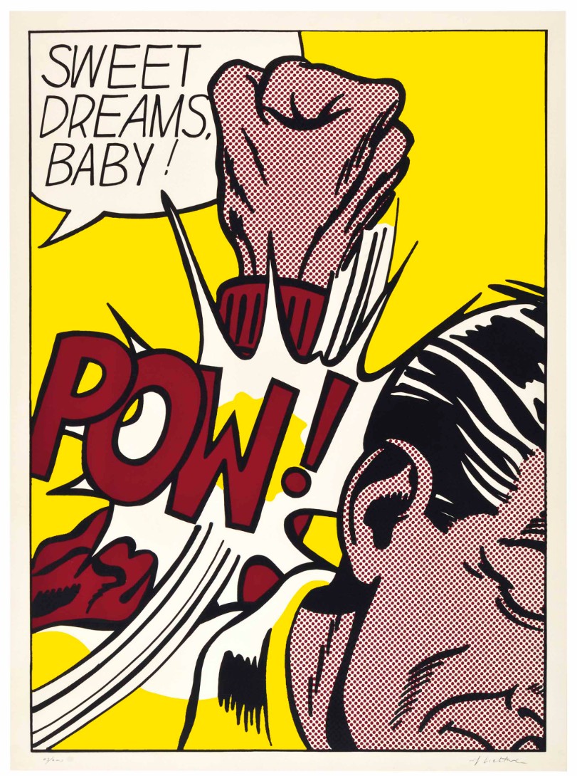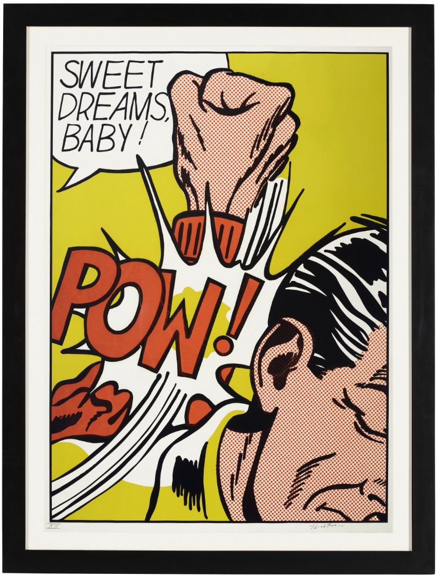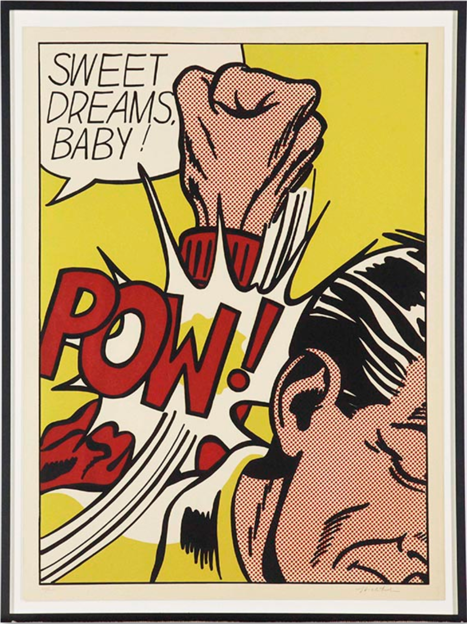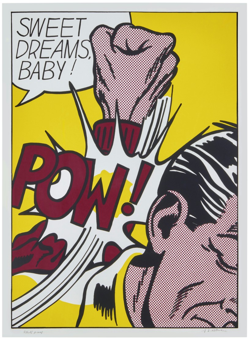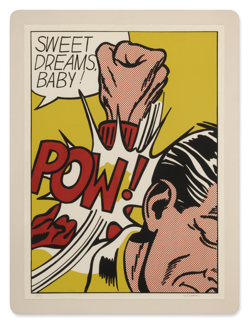 Sweet Dreams Baby! is probably one of Lichtenstein’s most iconic and powerful prints. It is a quintessential example of his Pop Art style, transforming a fleeting moment of comic-book violence into a monumental, ironic fine art statement. The image captures an explosive moment of violence in a highly graphic, cropped format. A large, muscular fist, rendered with heavy black outlines and yellow Ben-Day dots for shading, is shown hitting an unseen figure or object (the edge of a face is just visible). The point of impact is signified by a burst of graphic energy lines and the bold, onomatopoeic word “POW!” rendered in vivid yellow and black. The phrase “SWEET DREAMS, BABY!” floats in a speech bubble above the action. The text is ironically affectionate, providing a jarring and humorous contrast to the aggressive visual act below.