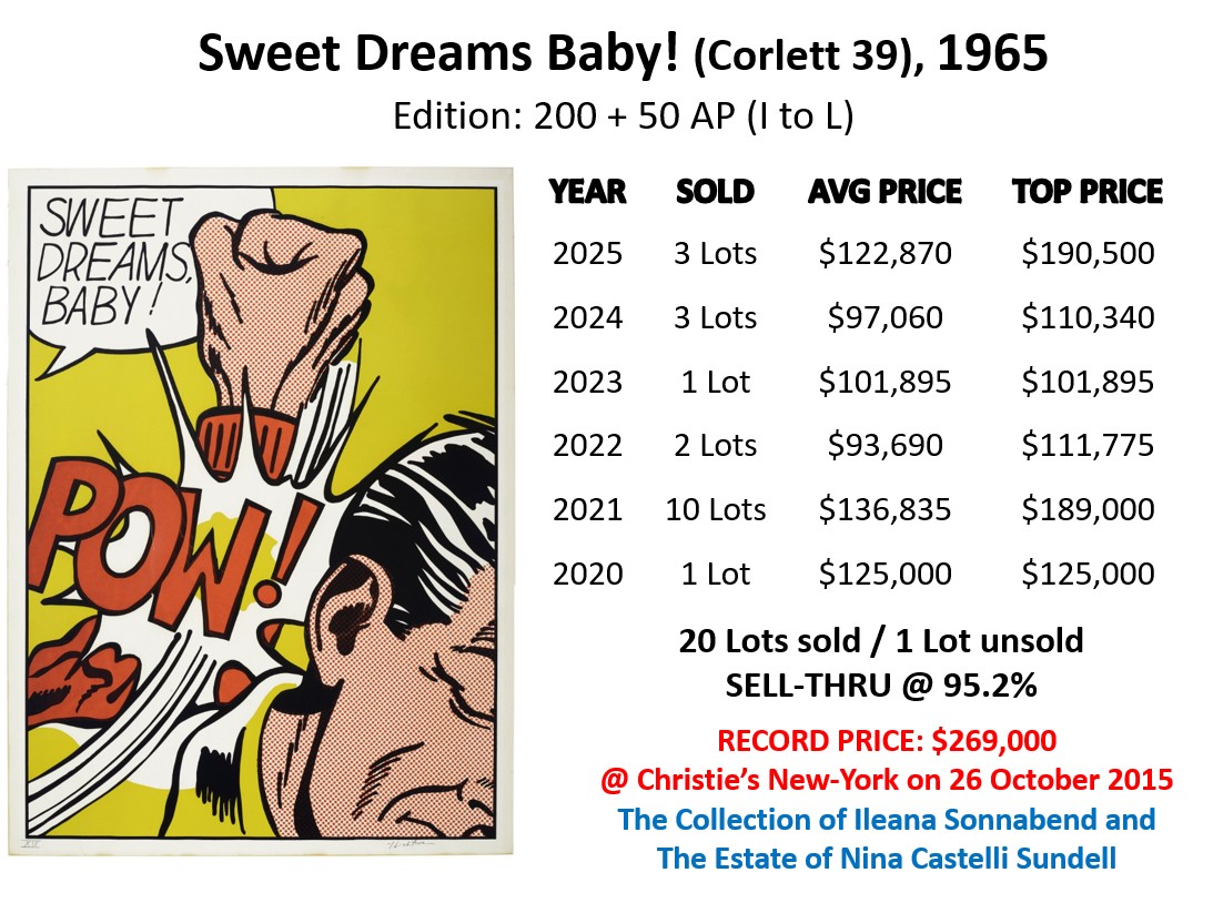 Sweet Dreams Baby! sold 3 times at auction in 2025 at an average price of USD 122,868. A print from The Collection of Dorothy and Roy Lichtenstein sold at Sotheby’s in New-York on 26 September 2025 for USD 190,500, its highest price in 2025.