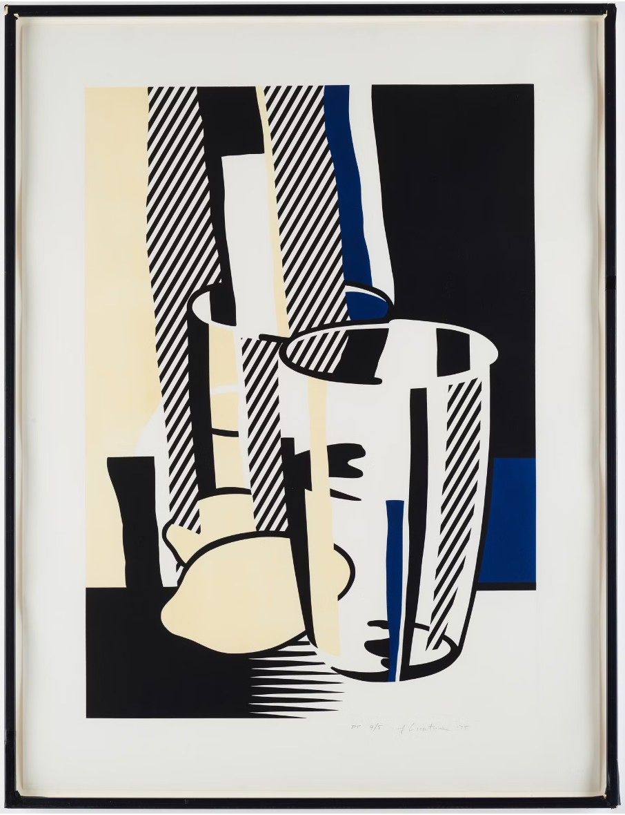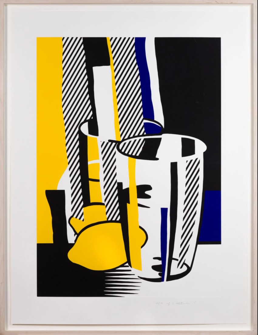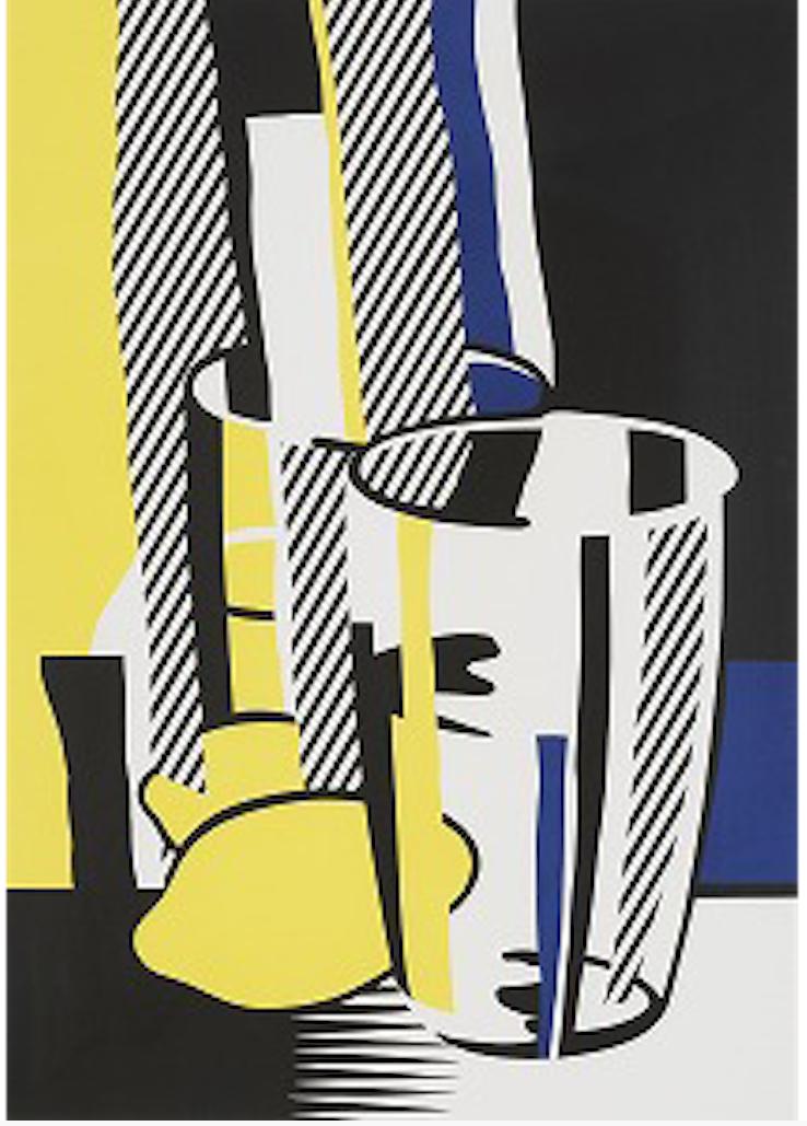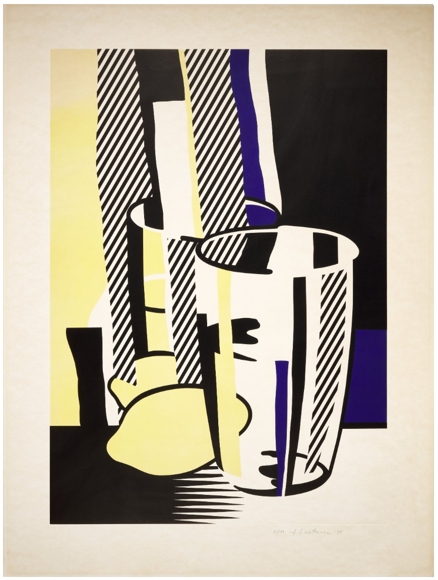 With Before the Mirror, Roy Lichtenstein brilliantly fuses Cubist still life and Pop minimalism, translating a traditional subject, a still life, into his unmistakable graphic vocabulary. Here, a drinking glass, lemon, and reflective surface are broken down into clean geometric planes, bold contours, and flat zones of color, including Lichtenstein’s signature black, white, lemon yellow, and deep ultramarine.