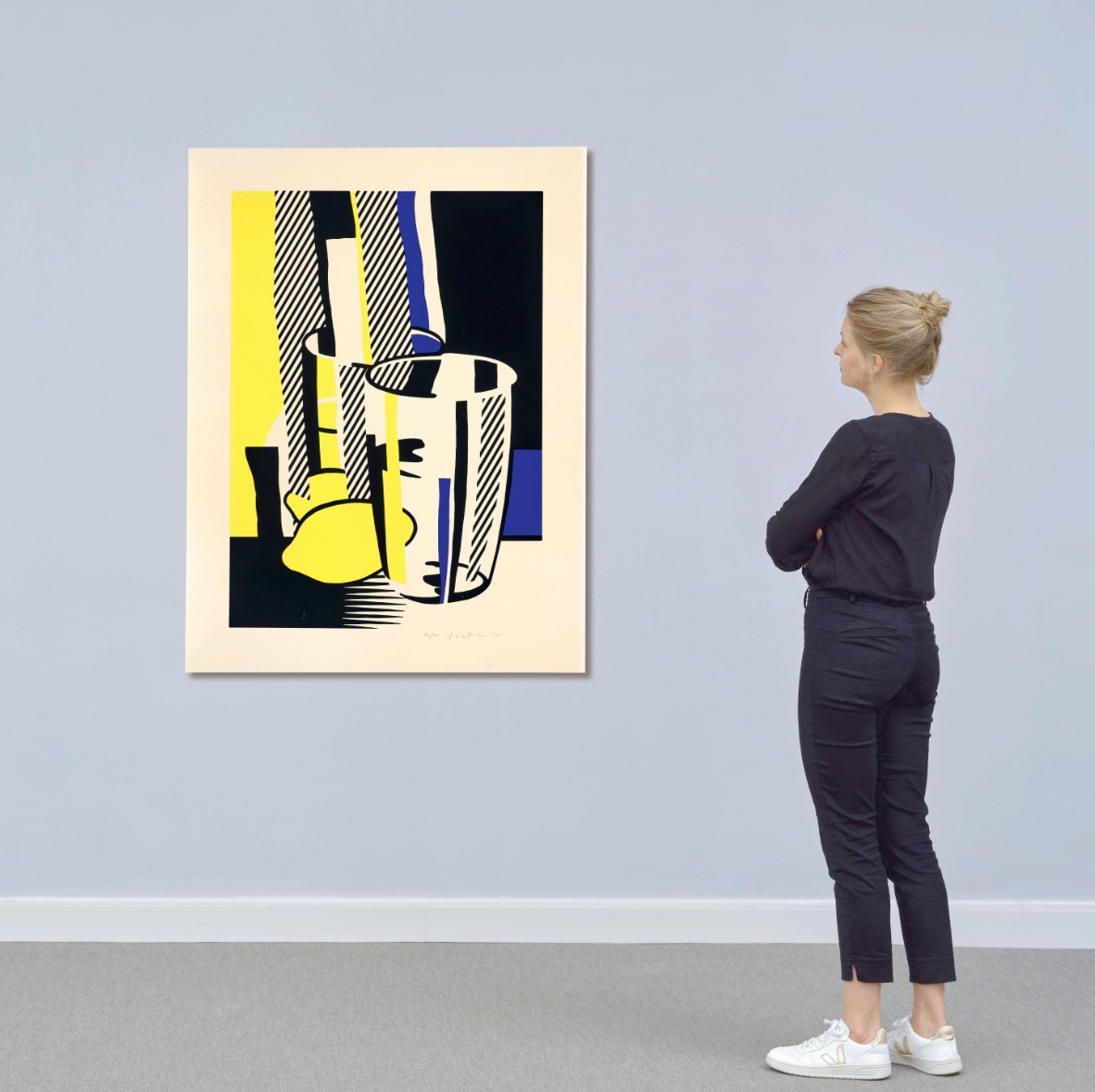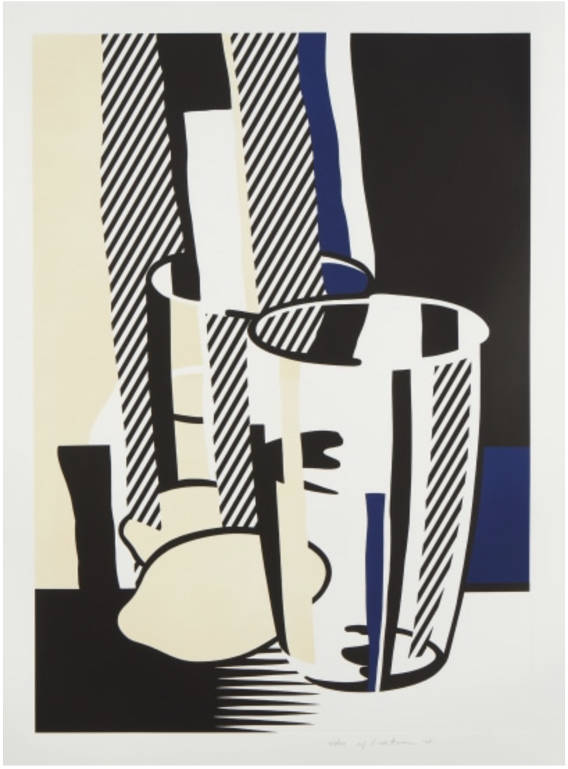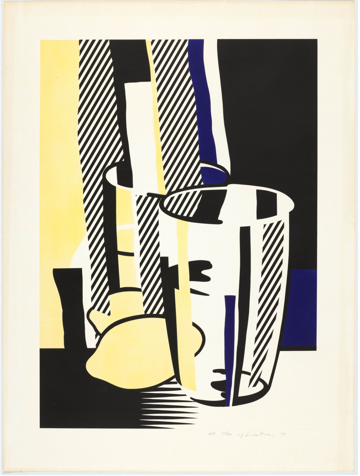 With Before the Mirror, Roy Lichtenstein brilliantly fuses Cubist still life and Pop minimalism, translating a traditional subject, a still life, into his unmistakable graphic vocabulary. Here, a drinking glass, lemon, and reflective surface are broken down into clean geometric planes, bold contours, and flat zones of color, including Lichtenstein’s signature black, white, lemon yellow, and deep ultramarine.