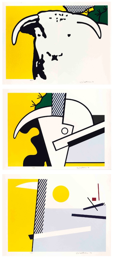 Lichtenstein explored the “progression” of an image from “representation” to “abstraction” in both paintings and prints of the early 1970s. In 1972 he executed the painting Pitcher Triptych. The following year, at Gemini G.E.L. from February to September, he completed the six multimedia prints of the Bull Profile series and the three of the Bull Head series. The painting Cow Triptych (Cow Going Abstract) followed them in 1974, and Lichtenstein periodically returns to the compositional device as in Tel Aviv Museum of Art Mural (1989). Lichtenstein’s bulls relate to Theo van Doesburg’s Composition (The Cow) (1916–17) and to Picasso’s eleven Bull lithographs (1945–46)