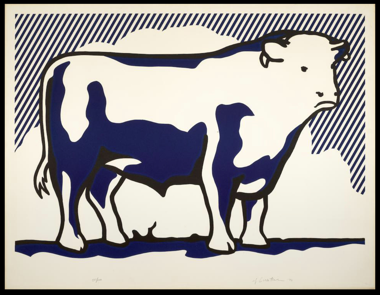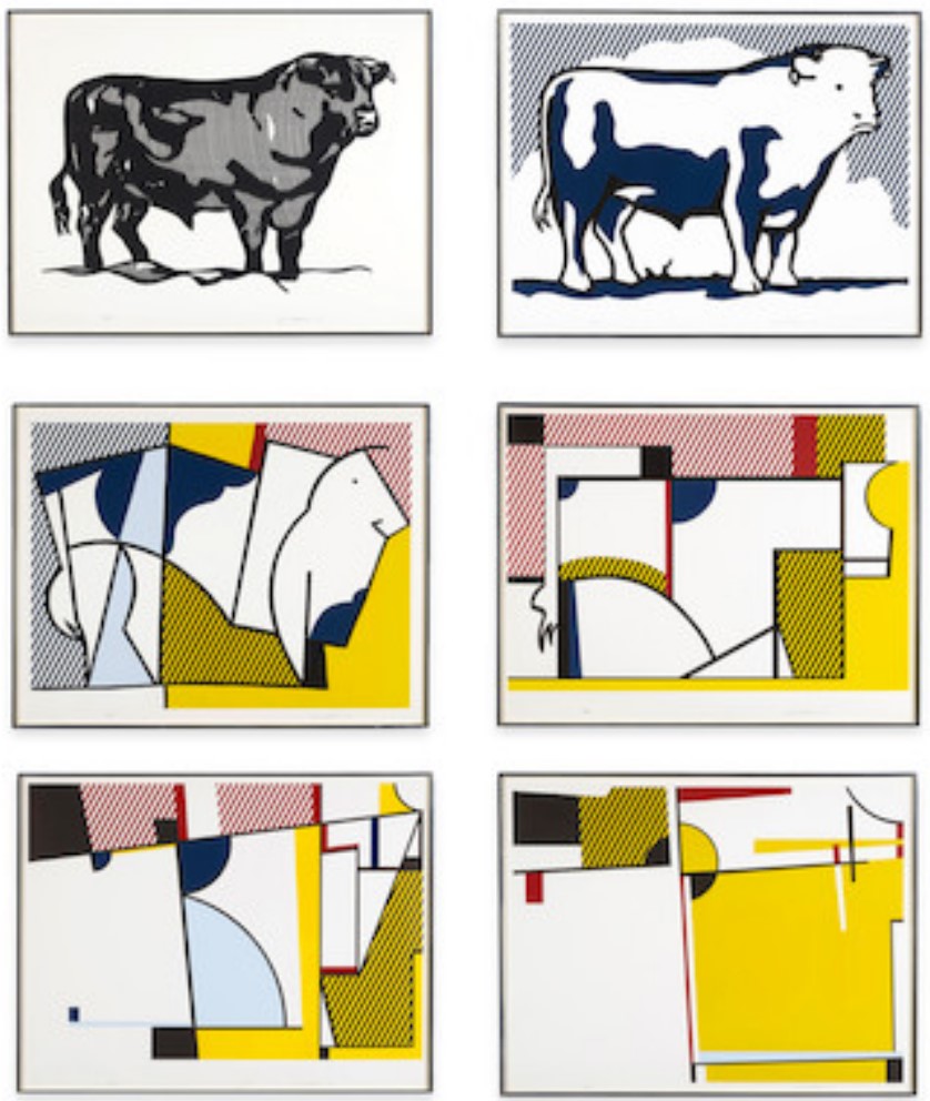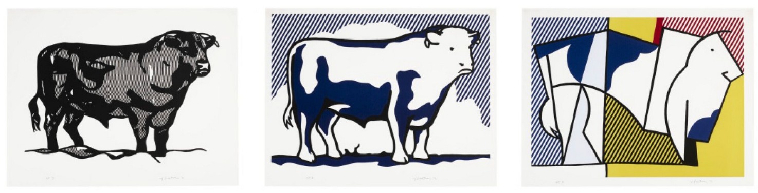 Lichtenstein explored the “progression” of an image from “representation” to “abstraction” in both paintings and prints of the early 1970s. In 1972 he executed the painting Pitcher Triptych. The following year, at Gemini G.E.L. from February to September, he completed the six multimedia prints of the Bull Profile series and the three of the Bull Head series. The painting Cow Triptych (Cow Going Abstract) followed them in 1974, and Lichtenstein periodically returns to the compositional device as in Tel Aviv Museum of Art Mural (1989). Lichtenstein’s bulls relate to Theo van Doesburg’s Composition (The Cow) (1916–17) and to Picasso’s eleven Bull lithographs (1945–46).