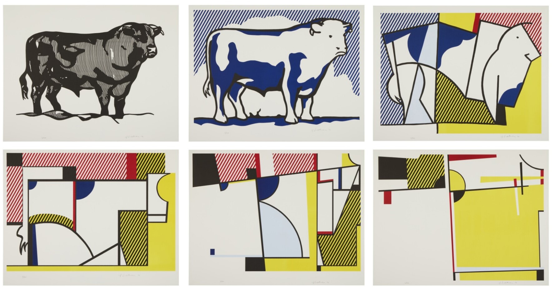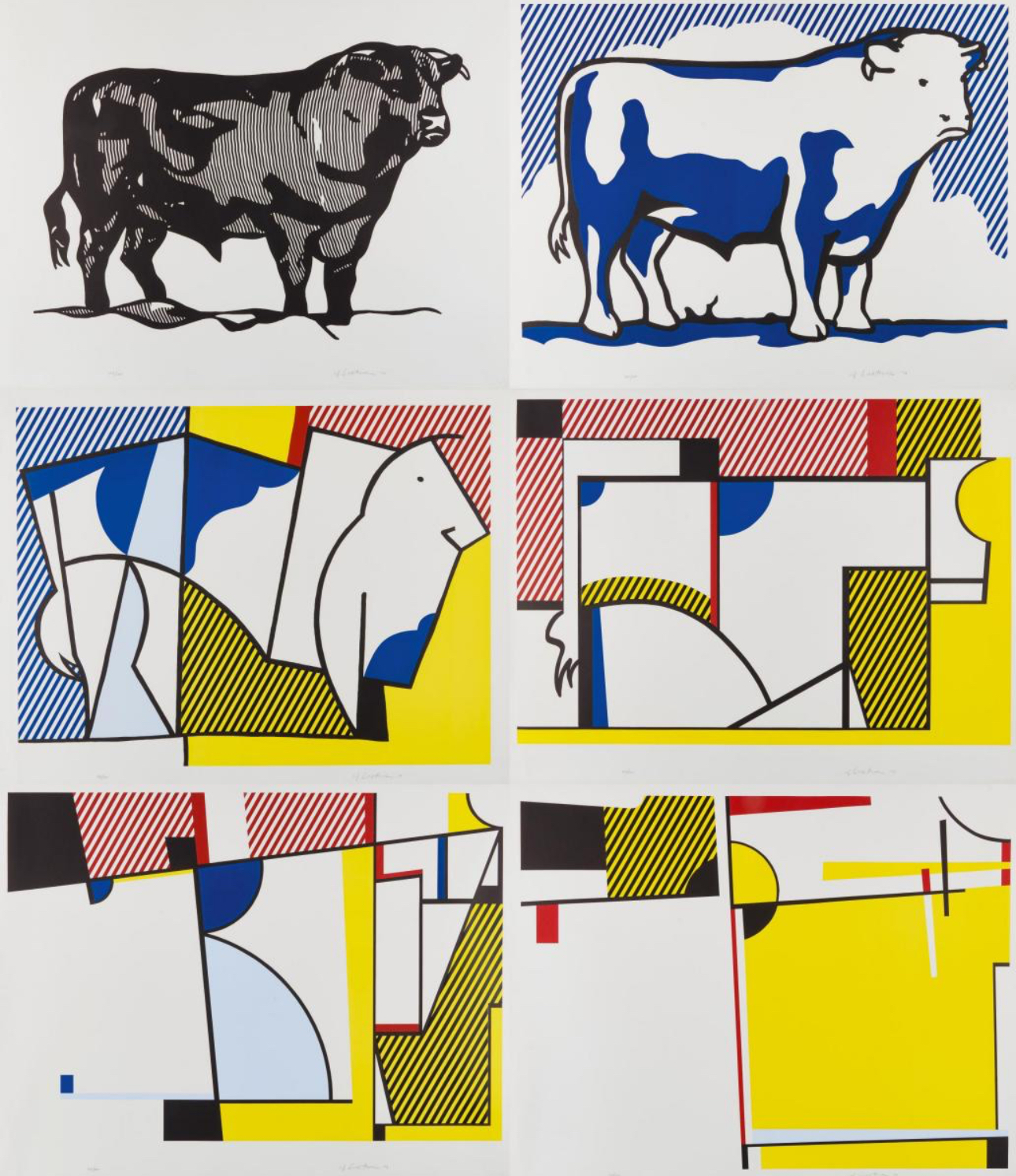 Bull Profile Series is a set of six prints that systematically deconstruct and abstract the image of a bull. As a commentary on art history, the series parodies Pablo Picasso’s 1945 lithograph series Le Taureau, which also explored the process of simplifying a bull’s form. Rather than being a visual search for a deeper meaning, Lichtenstein’s work playfully questions the line between figurative and abstract art.