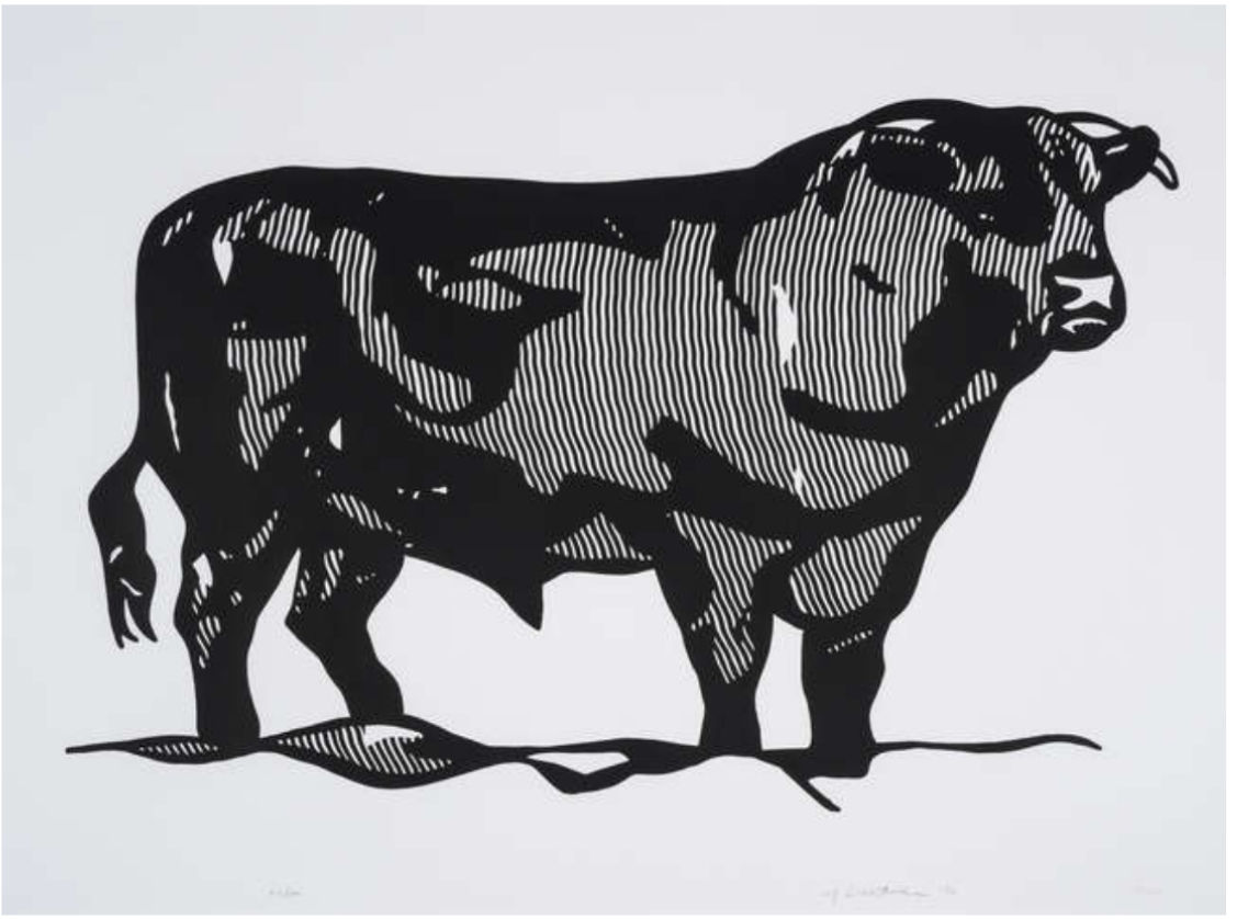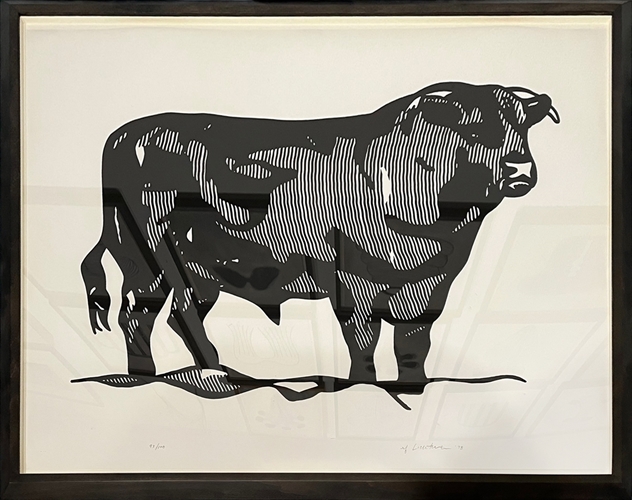 Lichtenstein directly references Pablo Picasso’s historic 1946 series on the same subject, The Bull (Le taureau), comprising eleven successive re-workings of a lithographic stone. Picasso began with a naturalistic depiction of the bovine in profile, then gradually contorts and pares down the animal into its most basic elements. The final impression is reduced to a near-hieroglyphic rendering of the original form.