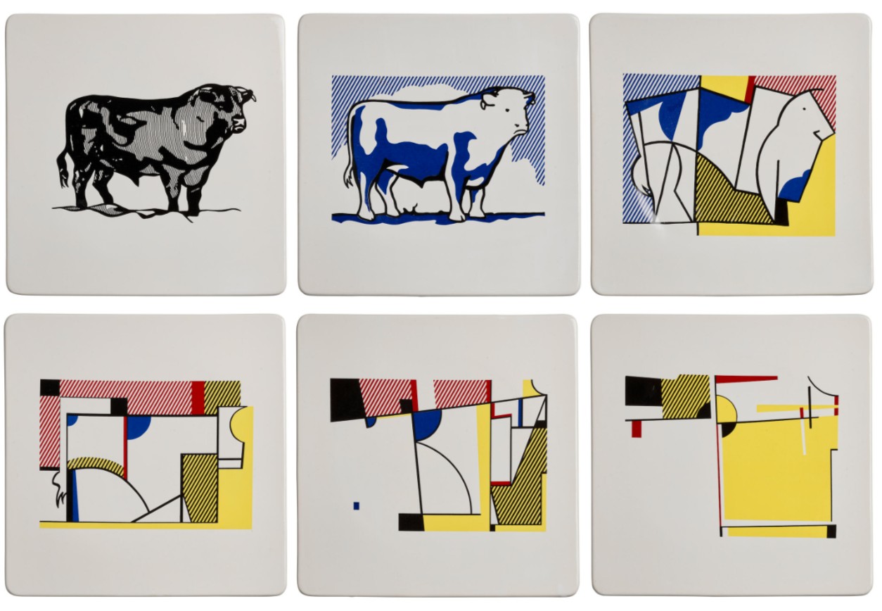 In 1989 Lichtenstein gave permission to Artists to End Hunger, Inc., to reproduce the Bull Profile series on a set of six 13-by-13-inch porcelain plates in an edition of fifty, plus six artist’s proofs. The publication was for the benefit of the International Art Show for the End of World Hunger, in which Lichtenstein’s print series was exhibited.