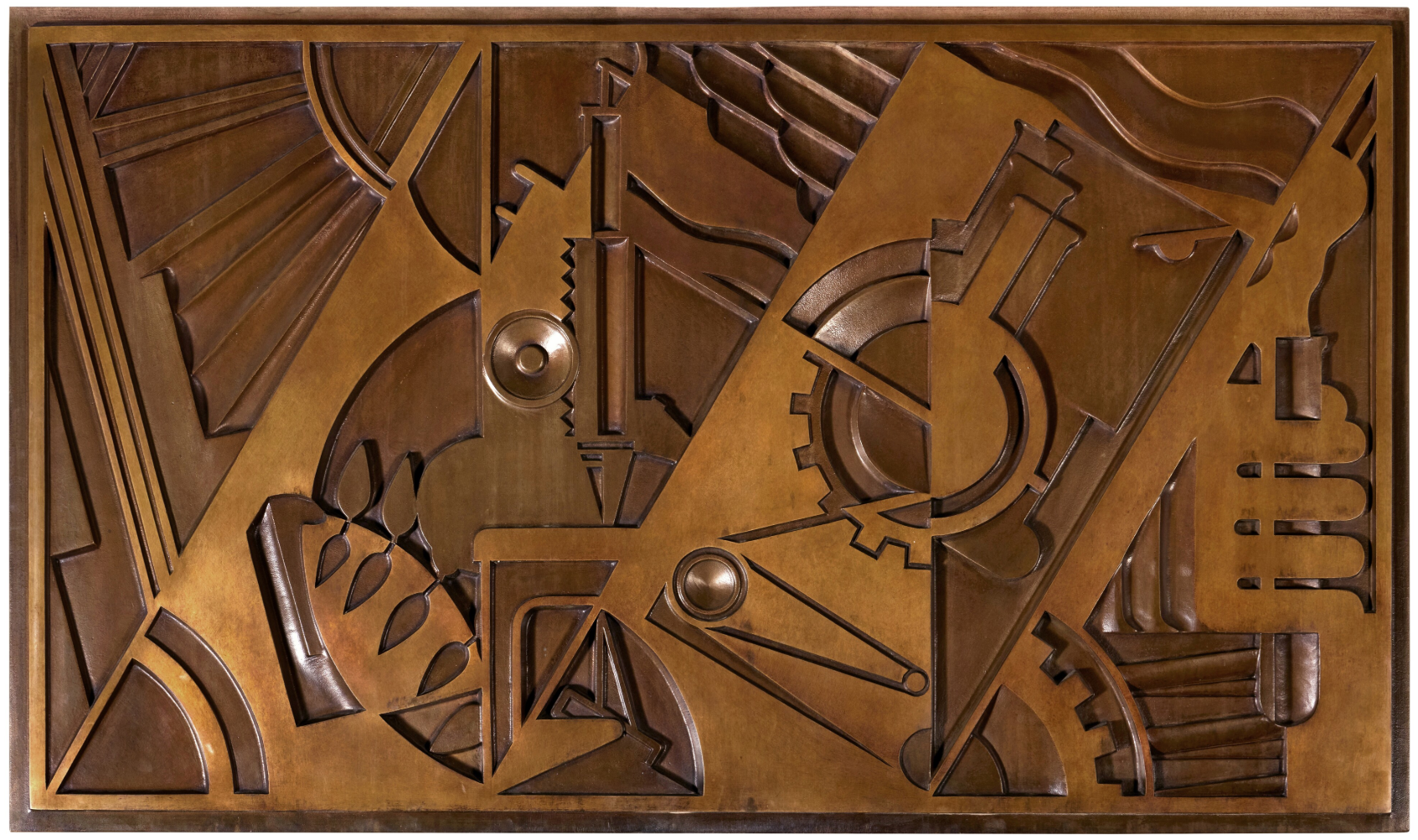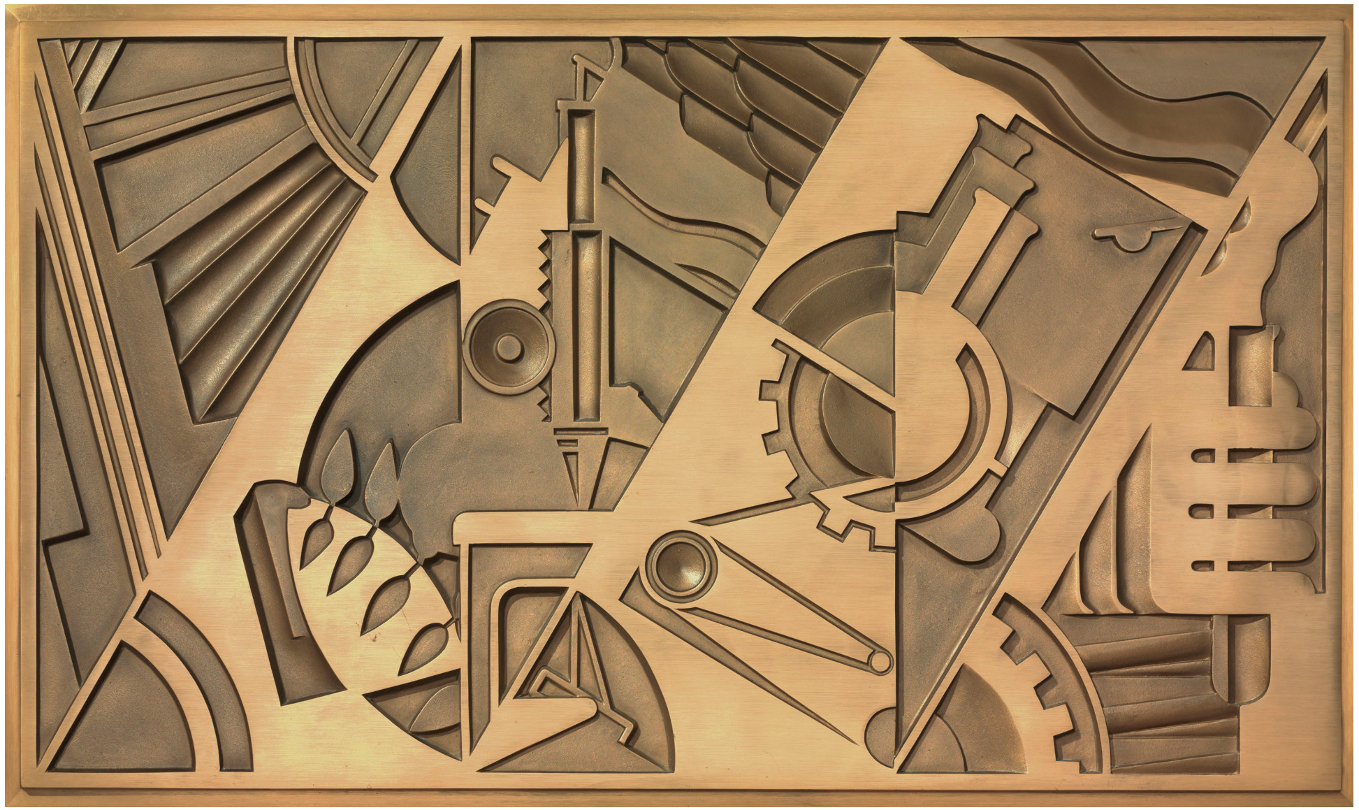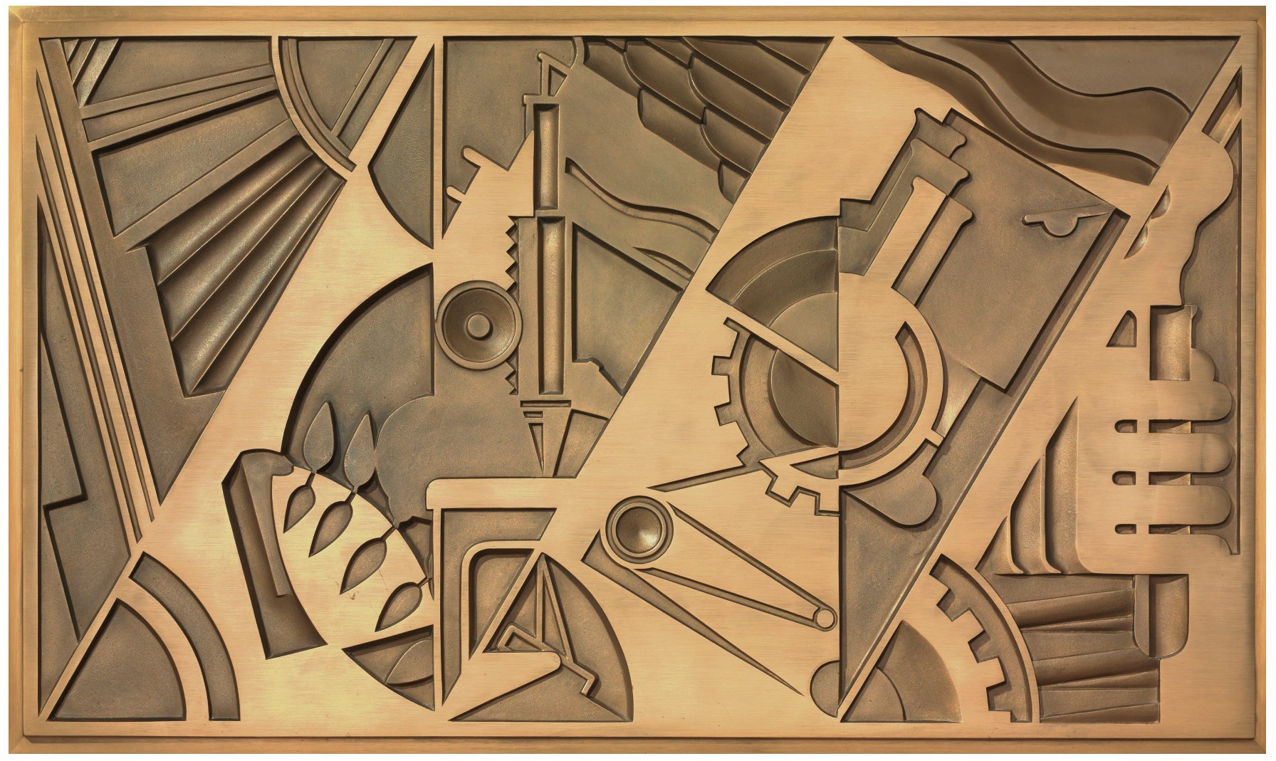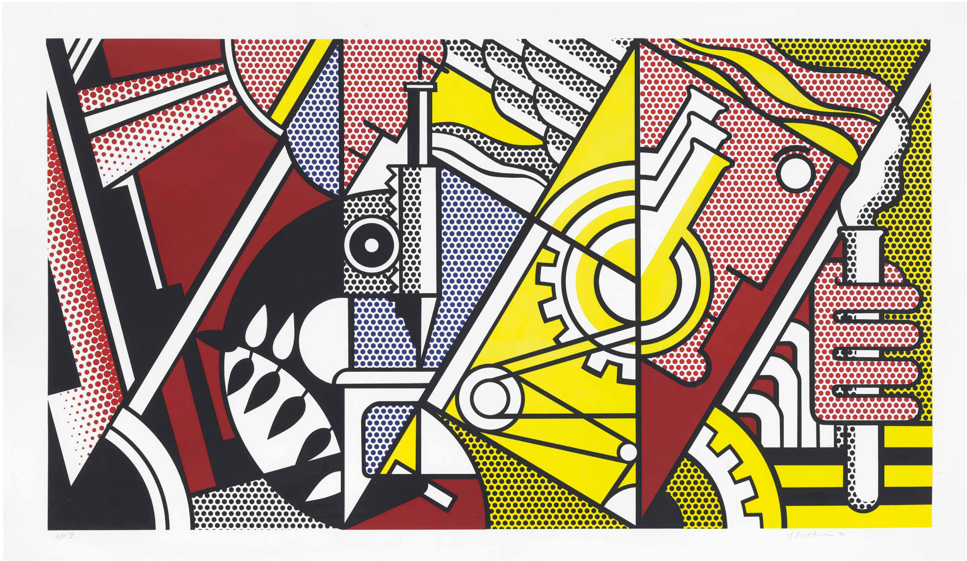 Working with Gemini, Lichtenstein had the chance to use their technology to create these large-scale prints, over five feet wide each. Lichtenstein began exploring the idea of man and the advancement of technology by creating a collage, upon which all four prints, as well as the bronze, are based. In the series, we see the same basic image, altered by variations in line and in color. These changes give each work a different effect, while the crisp lines and color of each reflect the precision of technology. Lichtenstein’s use of line recalls the features of art deco architecture, and this aesthetic is emphasized in the bronze piece. It is perhaps no surprise with both the theme and scale of the works that Lichtenstein found similarities between Peace Through Chemistry and the W.P.A. murals of the 1920s and 1930s.