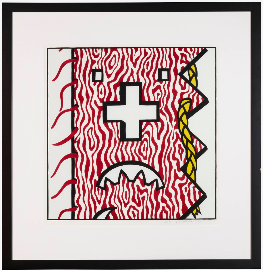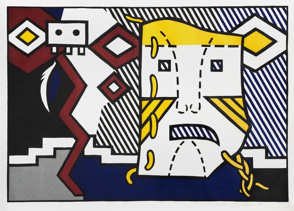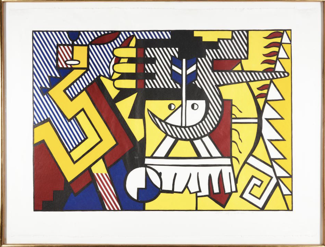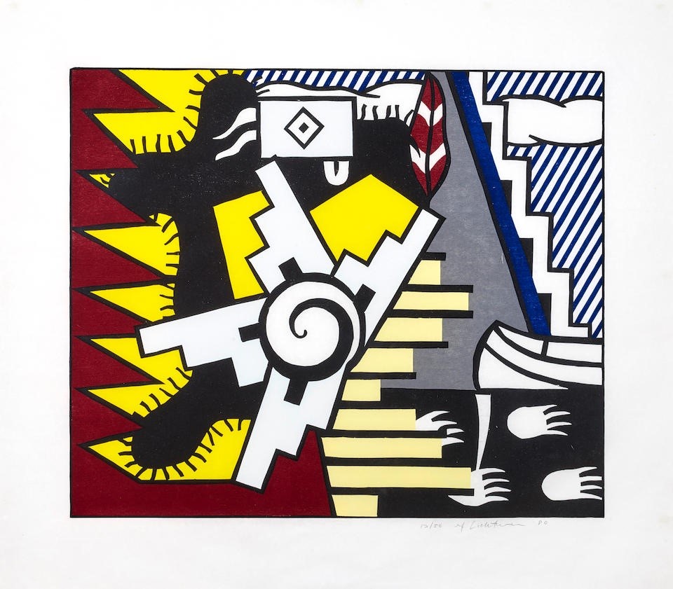 Roy Lichtenstein may have drawn additional inspiration from the collections of his artist friends, including Jasper Johns, Frank Stella, and Donald Judd, who were known to acquire Native American blankets for their own artistic endeavors. During the creation of this print, Lichtenstein was experimenting with novel combinations of motifs, departing from his previous artistic approaches.