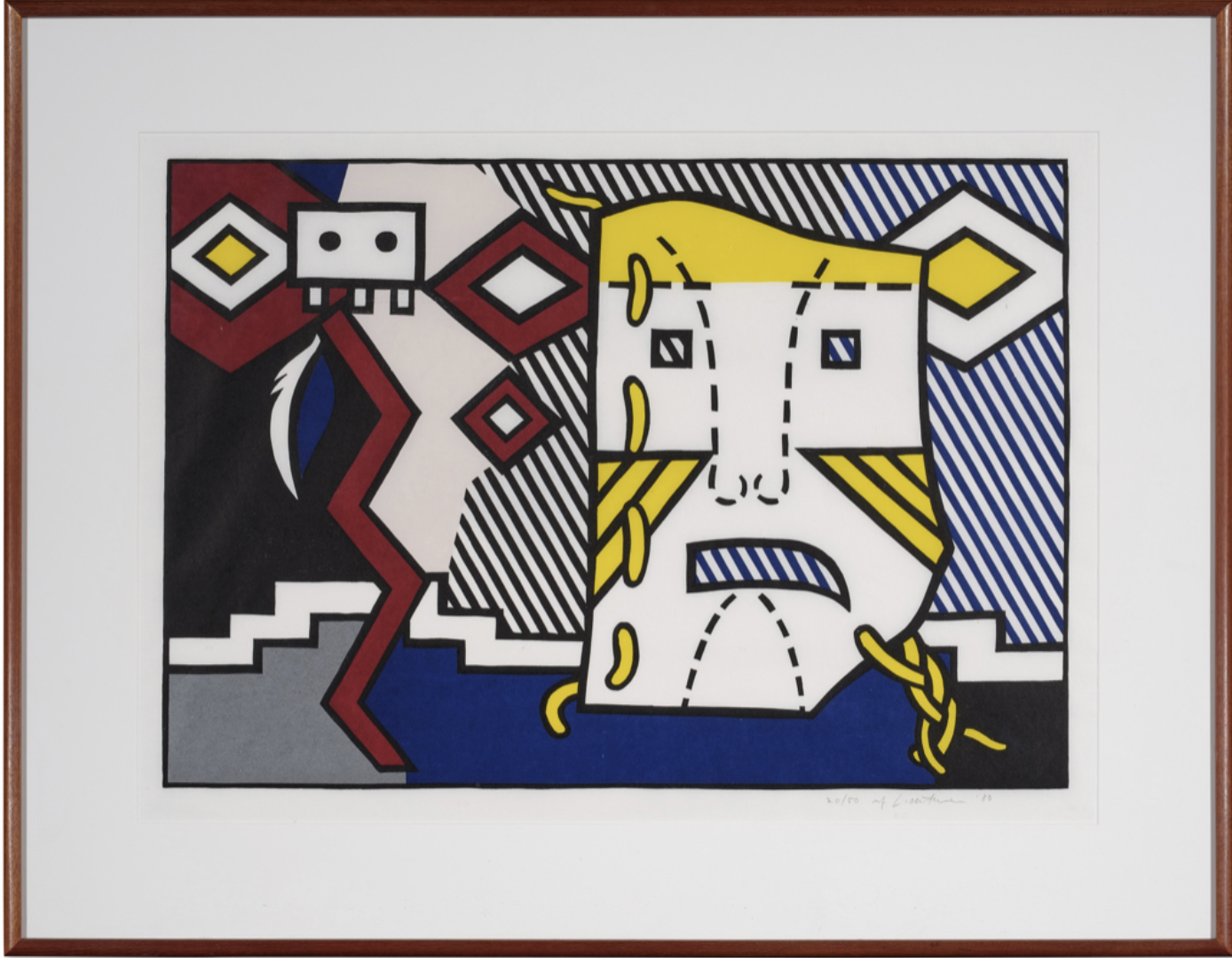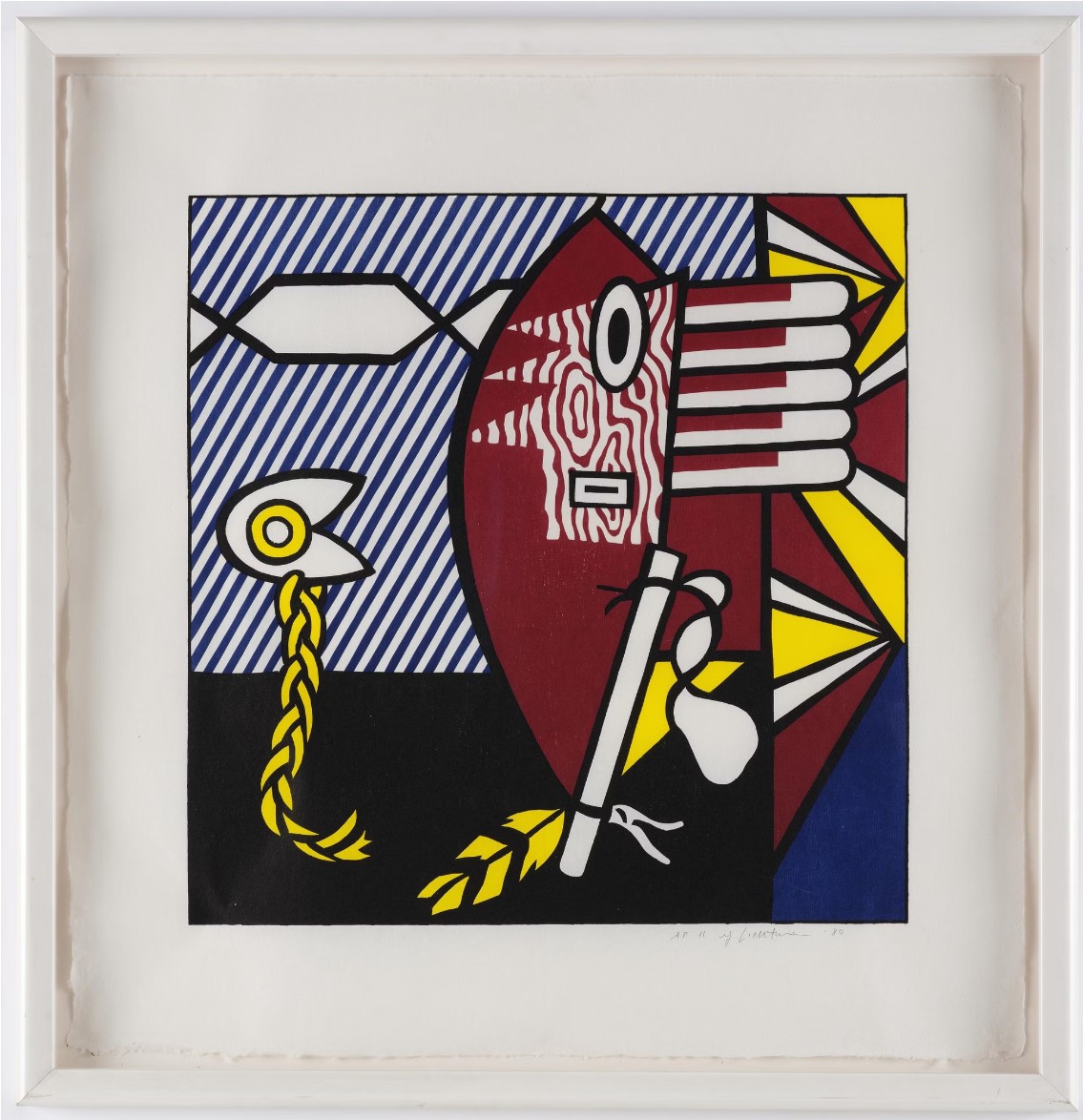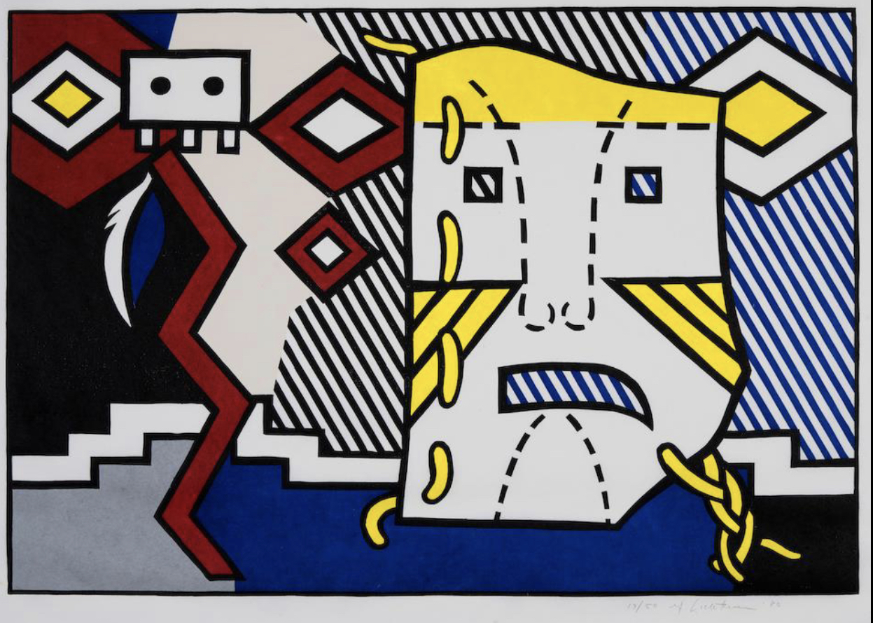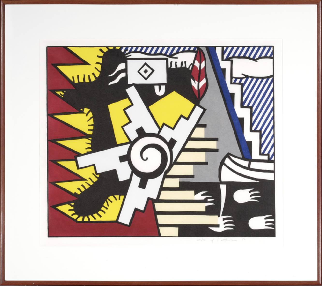 Roy Lichtenstein may have drawn additional inspiration from the collections of his artist friends, including Jasper Johns, Frank Stella, and Donald Judd, who were known to acquire Native American blankets for their own artistic endeavors. During the creation of this print, Lichtenstein was experimenting with novel combinations of motifs, departing from his previous artistic approaches.