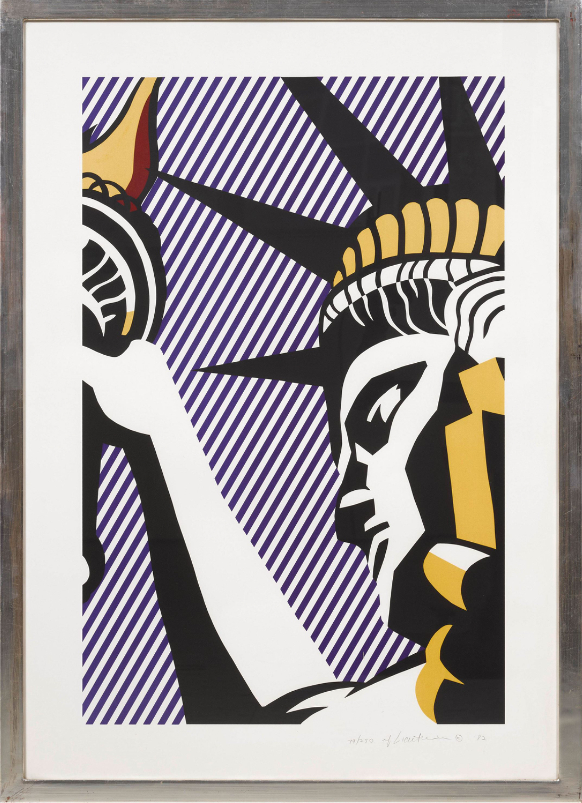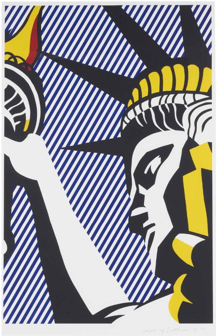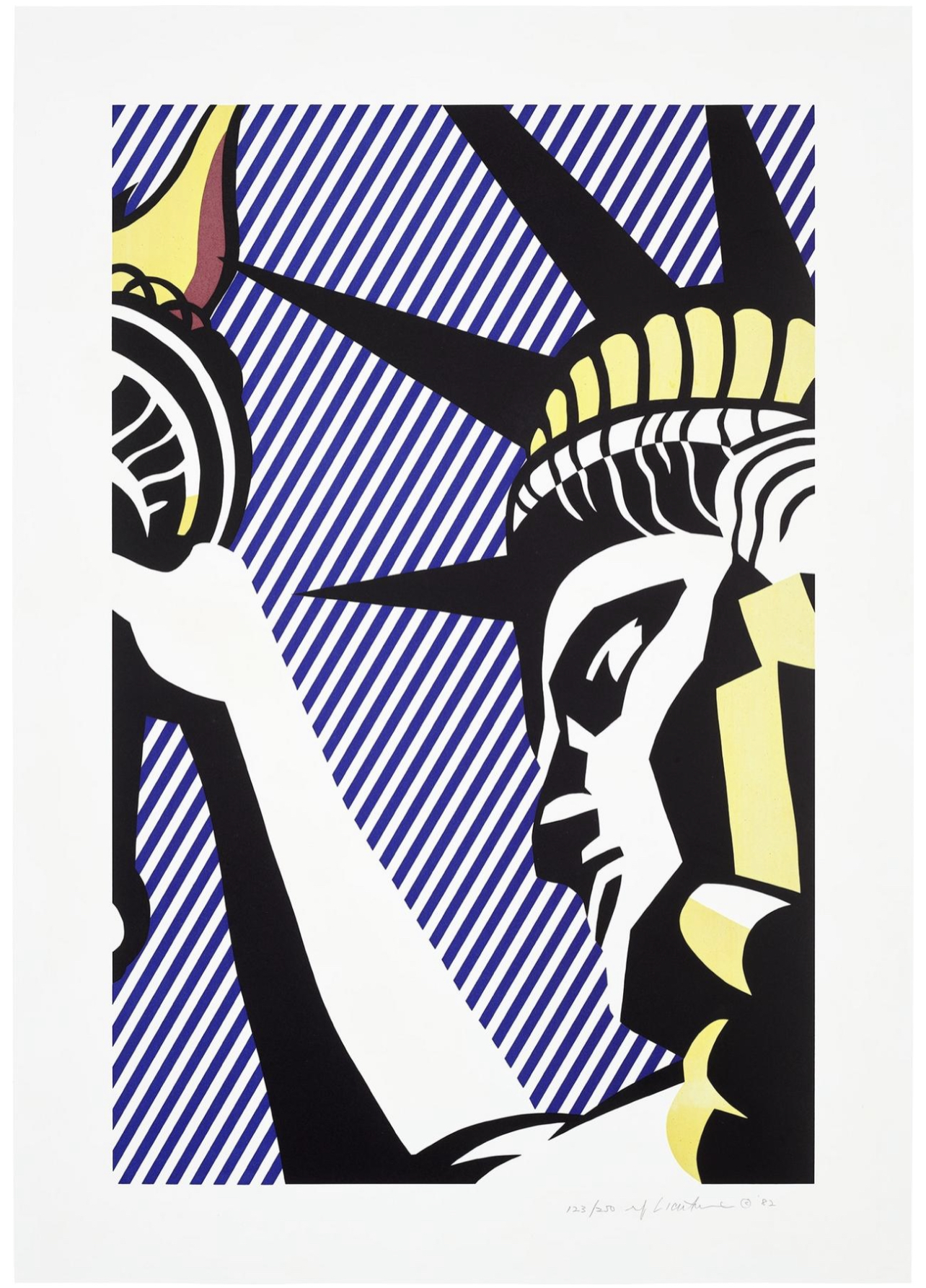 The print was created in 1982 as part of a broader engagement with American identity and national symbols. By this stage, Roy Lichtenstein had moved beyond direct comic imagery and was increasingly incorporating cultural and historical references into his work. The use of the Statue of Liberty situates the print within a lineage of American iconography, while the print medium reinforces his ongoing interest in reproduction and clarity.