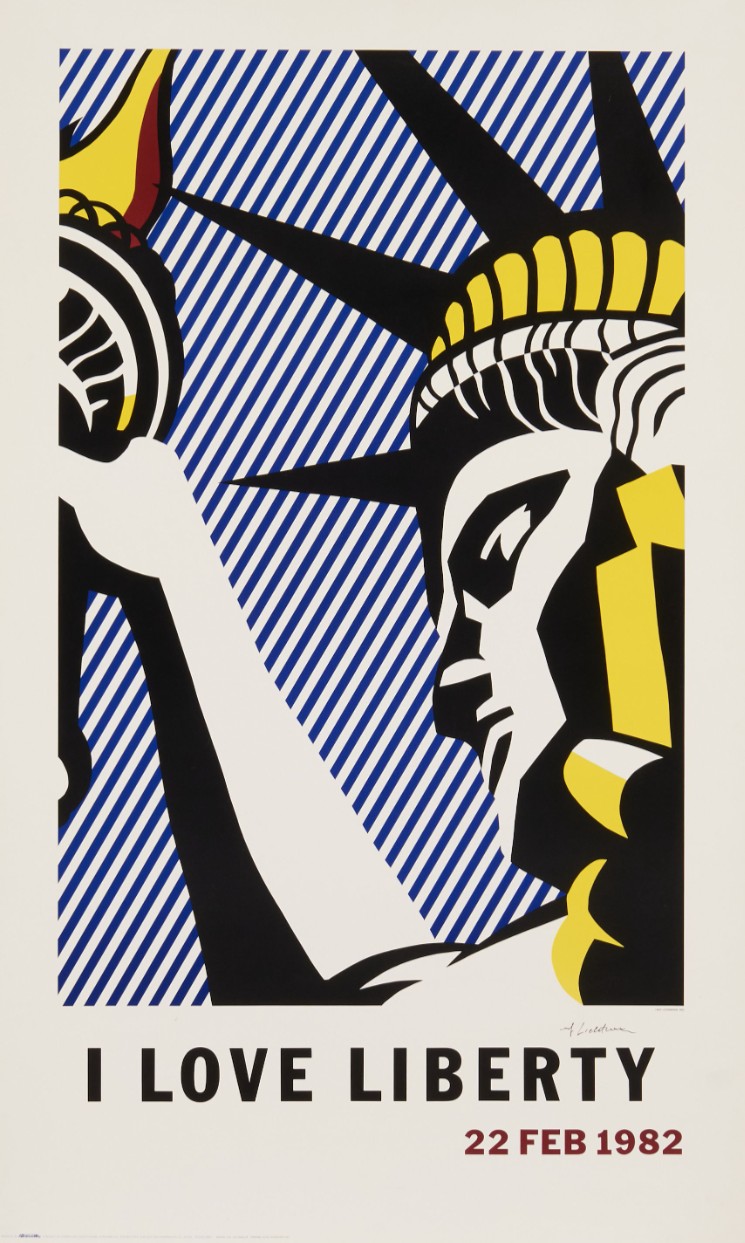Two distinct editions of I Love Liberty were produced in 1982, reflecting Lichtenstein’s dual approach to image-making at that stage of his career. On one hand, he created a formally editioned fine-art print, signed and strictly limited, intended for the traditional print market and aligned with the conventions of collectors, galleries, and auction houses. On the other, a larger-scale poster edition was produced for wider public distribution in connection with the national “I Love Liberty” celebration. This distinction is essential, as it illustrates the tension in Lichtenstein’s work between controlled artistic production and the broader circulation of images, a central theme in Pop Art itself.