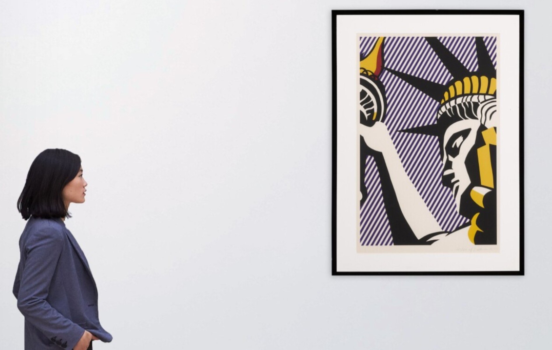 Executed by the artist for Norman Lear’s I Love Liberty TV special in 1982 (produced to mark George Washington’s 250th birthday) the sharpness and vivid presence of Lady Liberty is thanks to Lichtenstein’s painstaking preparatory work.