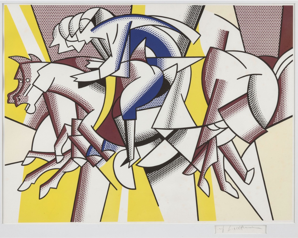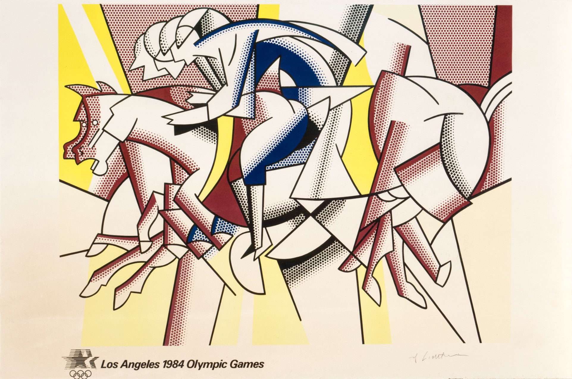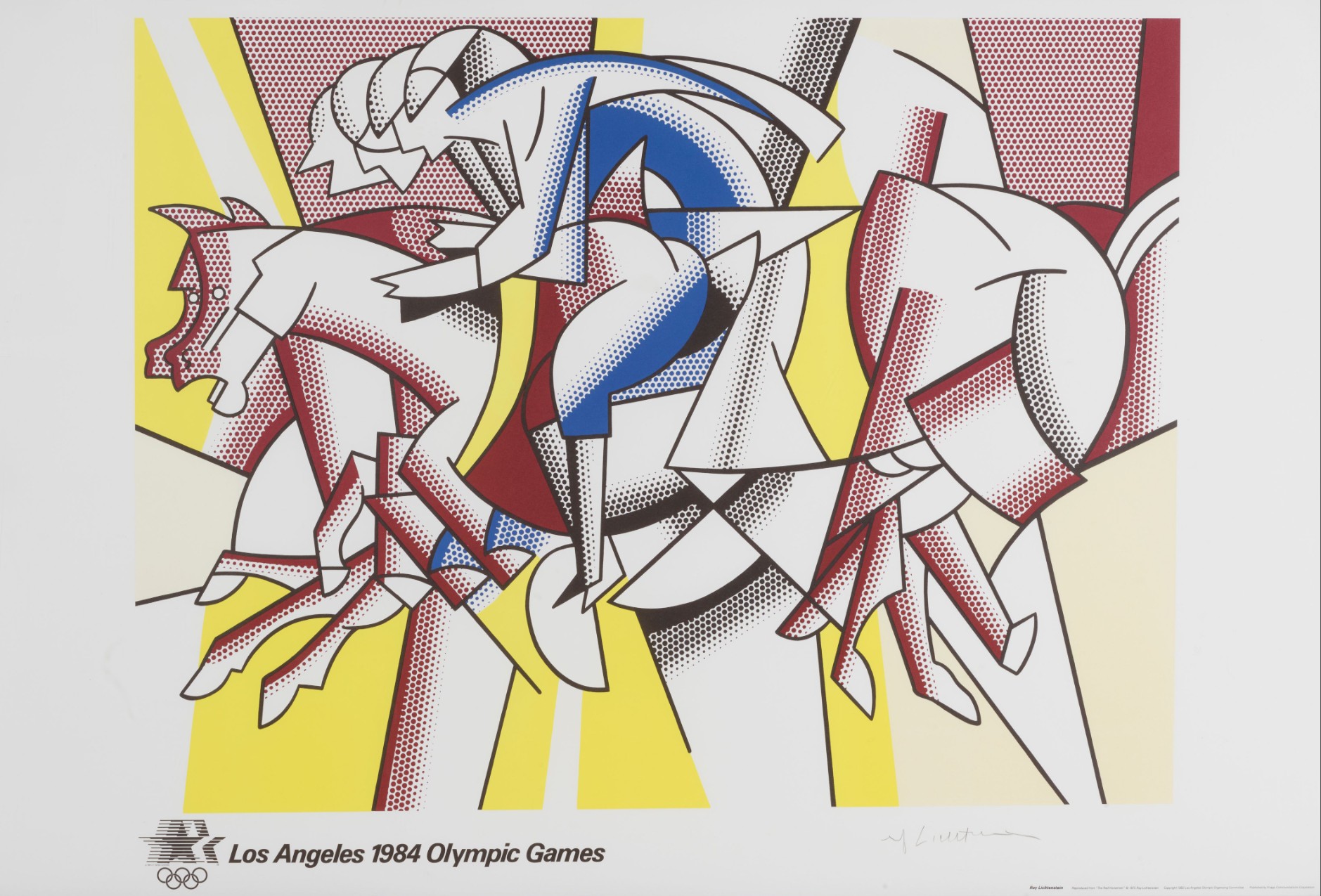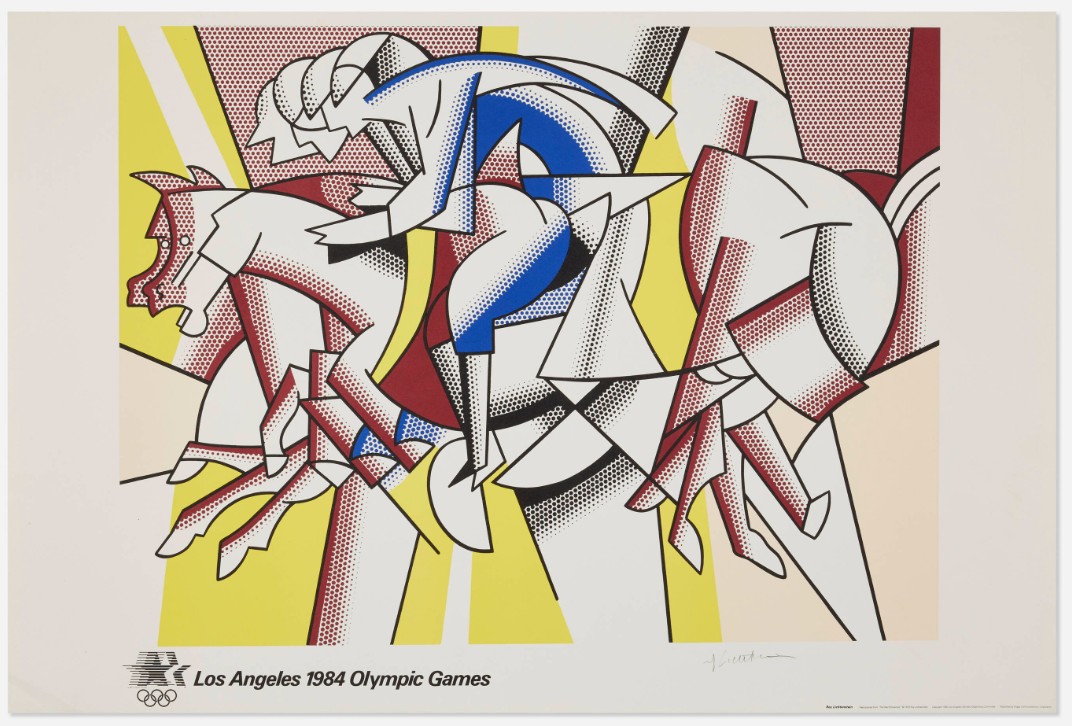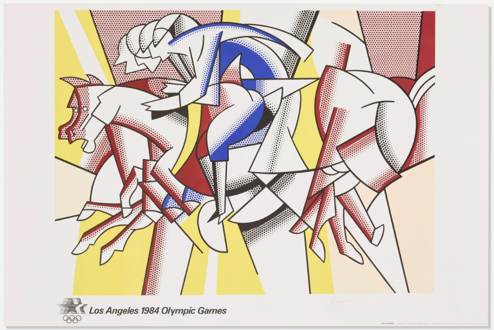 In 1982, the Los Angeles Olympic Organizing Committee commissioned a select group of internationally established artists to produce original images that would accompany the event and articulate its cultural ambitions. Lichtenstein was invited as one of the leading figures of postwar American art, alongside artists whose practices had already achieved broad institutional and public recognition. The Olympic edition based on The Red Horseman was conceived not as a reinterpretation but as a faithful translation of the earlier pictorial concept into print form. The image’s equestrian motif resonated naturally with Olympic symbolism: strength, motion, discipline, and controlled energy. Stripped of narrative specificity, the horseman becomes an emblem rather than a character, aligning with the Games’ desire for universally legible imagery detached from national or ideological markers.
