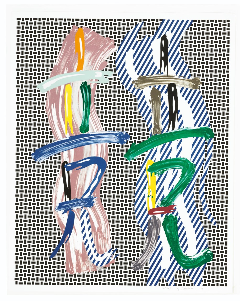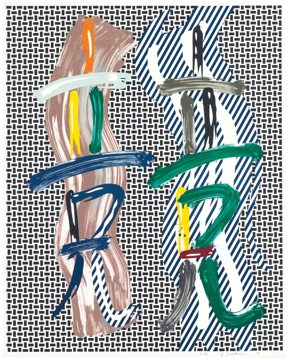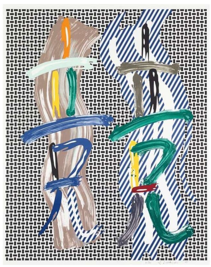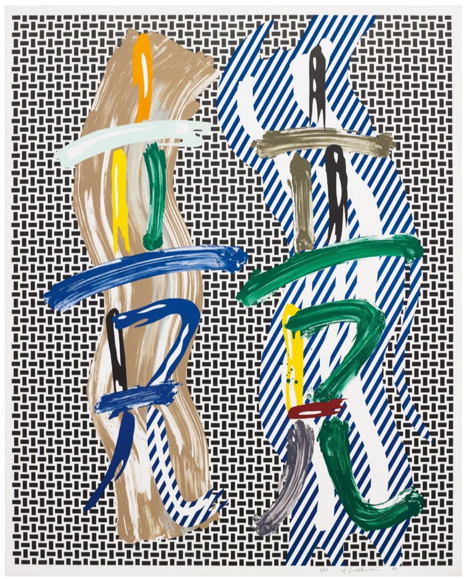 Created in 1989, Brushstroke Contest draws directly from the Brushstroke theme first developed in the mid-1960s, but here expanded into a more elaborate and layered visual field. Rather than isolating a single gesture, Lichtenstein orchestrates multiple brushstroke forms, set in dialogue and tension across the surface. The composition is structured around two vertical zones populated by gestural forms that appear to “compete” for visual dominance. These painted marks, thick, sweeping, and irregular, are deliberately artificial. They simulate spontaneity while remaining entirely controlled, crisply outlined, and mechanically reproduced. The background alternates between dense black-and-white patterning and diagonal striping, reinforcing the sense of rhythm and visual confrontation. Color is applied sparingly yet decisively, with greens, blues, yellows, and earthy tones punctuating the composition and activating the surface.