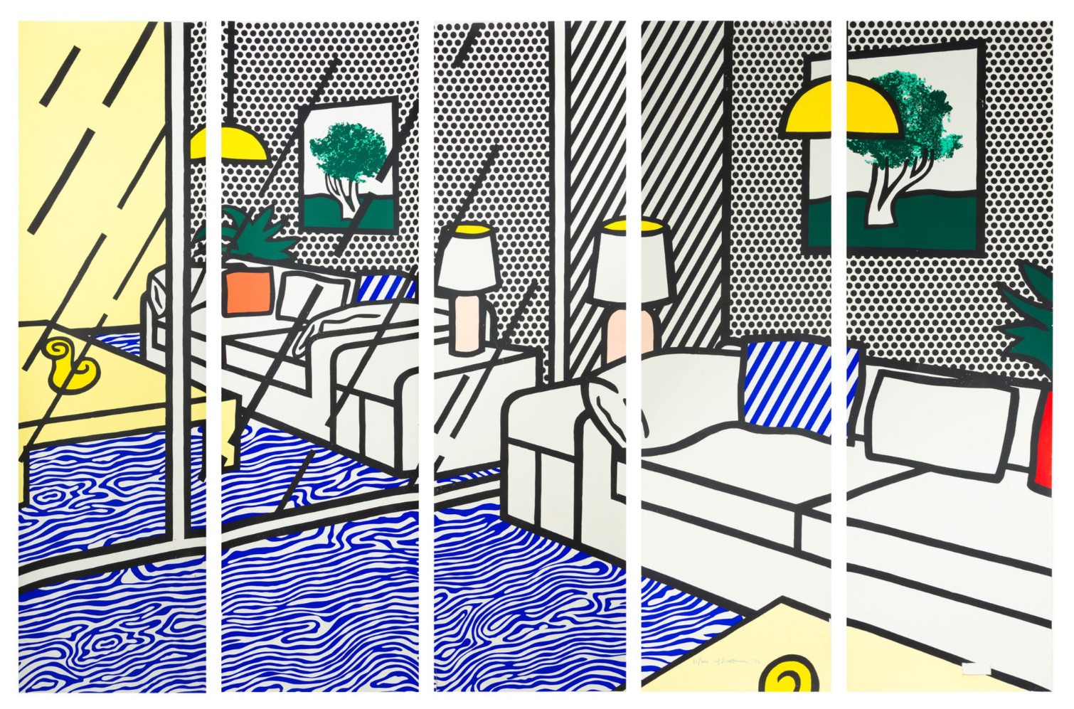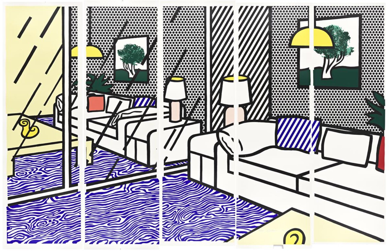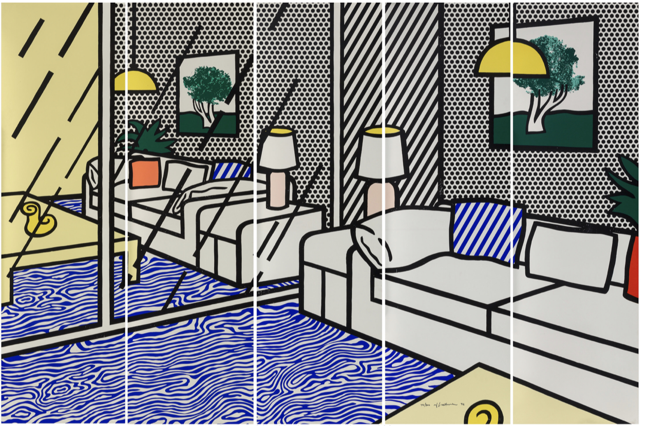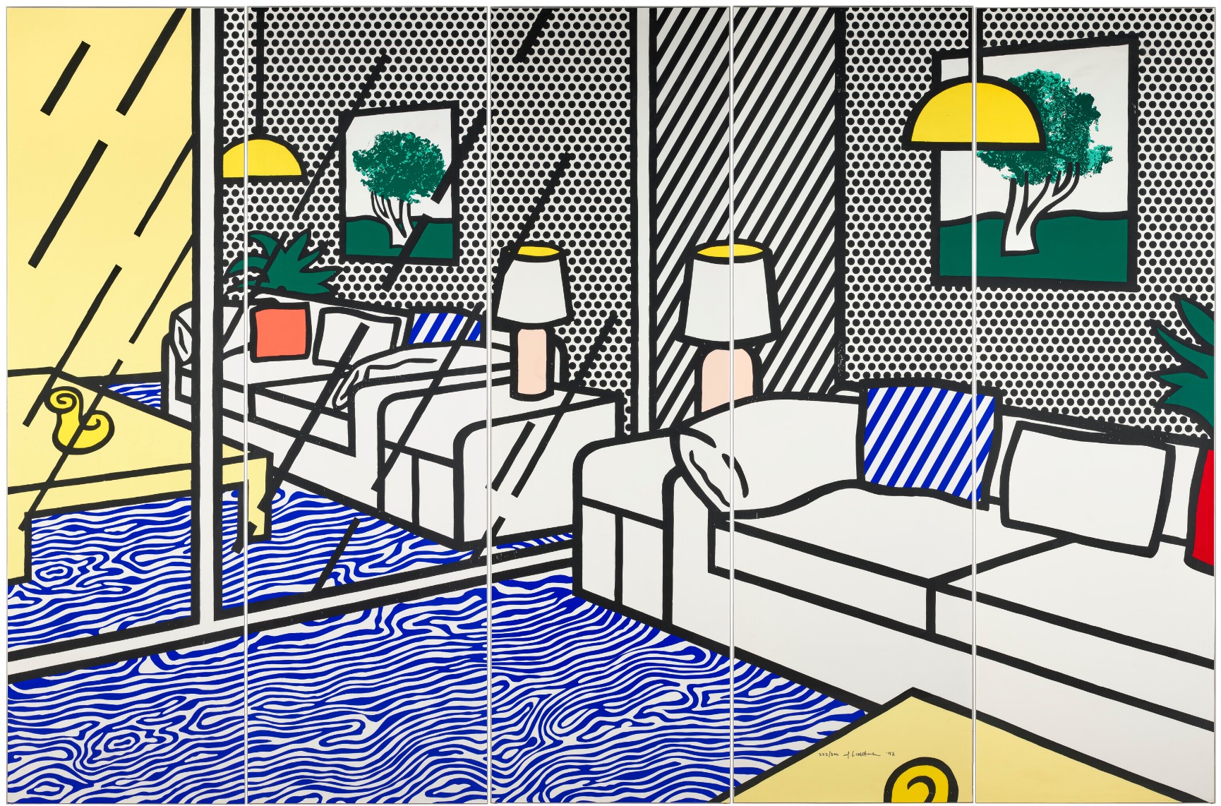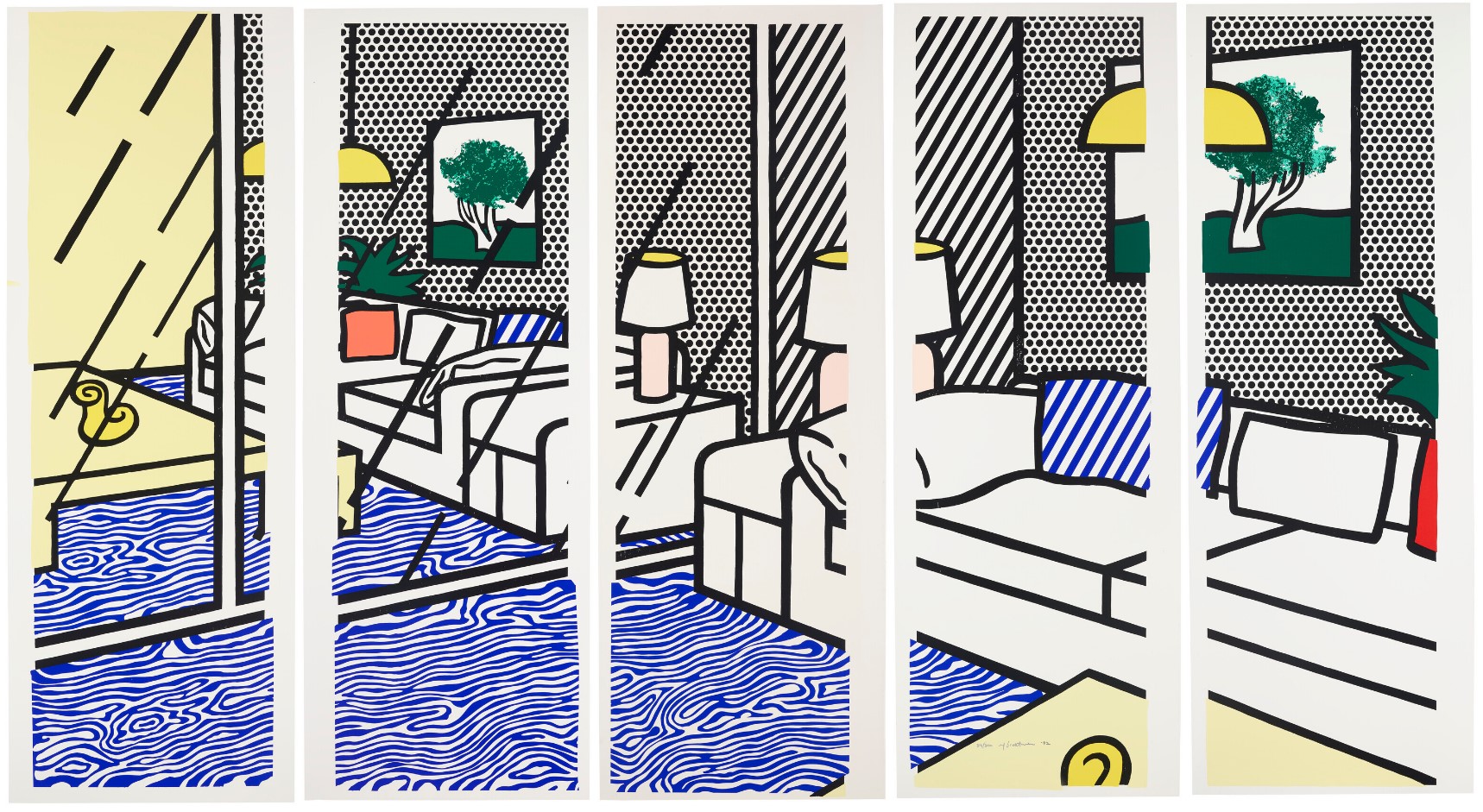 Wallpaper with Blue Floor Interior is the last in Lichtenstein’s Interiors series of the early 1990s, which presents modern, impersonal interior scenes reminiscent of motel rooms – anonymous and unlived in. The series was inspired by a billboard advertisement that Lichtenstein saw in Rome in 1989. Upon returning to New York, he began to experiment with similar motifs that he found in Yellow Pages catalogues. Alike the endless advertisements in the Yellow Pages, the style and furniture of Lichtenstein’s pictorial compositions are also varied throughout the series; something for everyone, as our consumer society mandates. The ease of access and choice of pick recalls the notion of the Yellow Pages slogan: “Let your fingers do the walking”, which Lichtenstein quite literally adopts. Appropriating advertisement clippings in the comic-strip spirit of Pop, Lichtenstein creates new composite forms served up as large-scale dreams, bringing to life the idyllic domestic fantasy sold in the Yellow Pages.