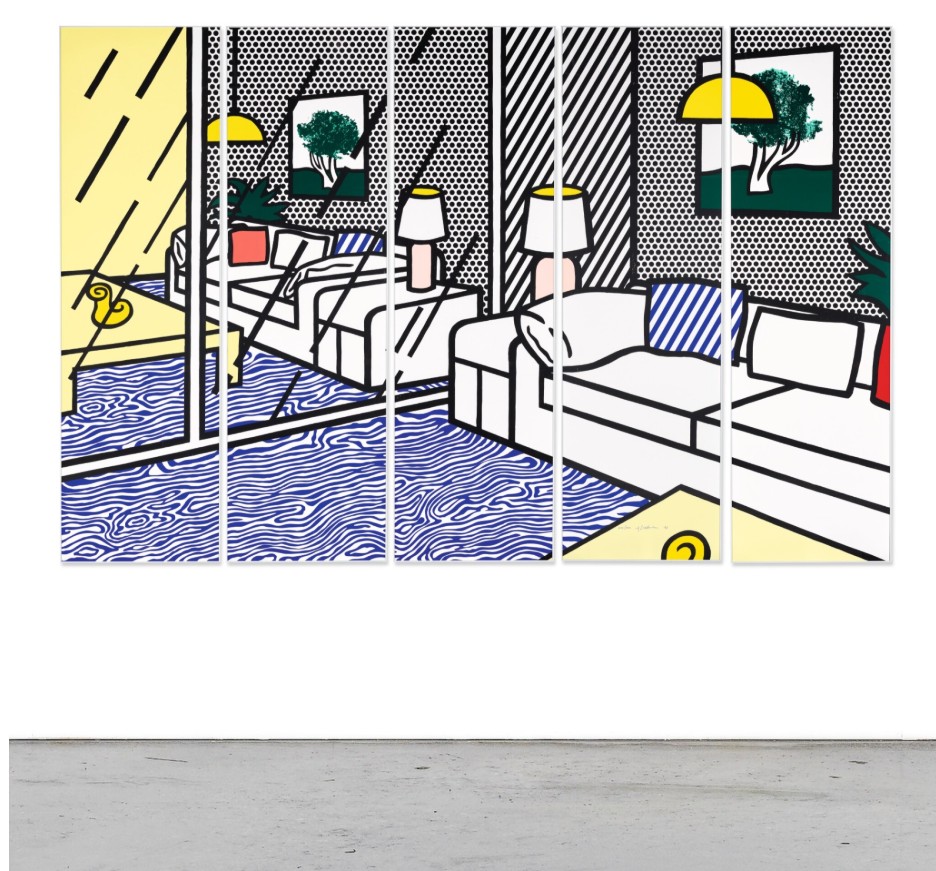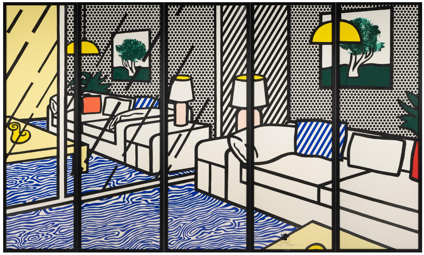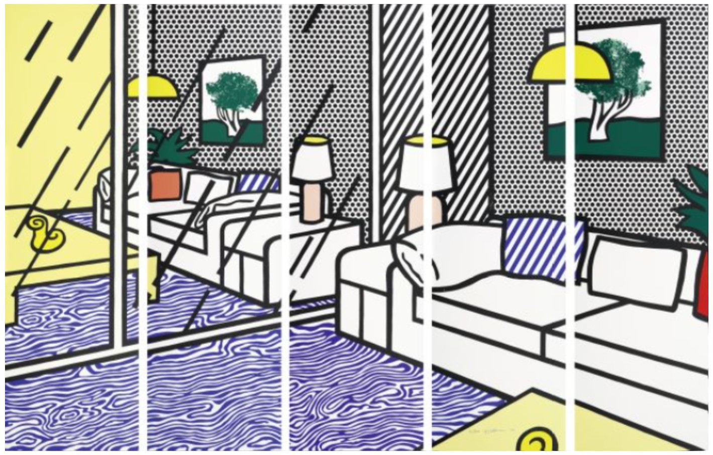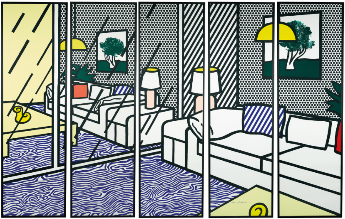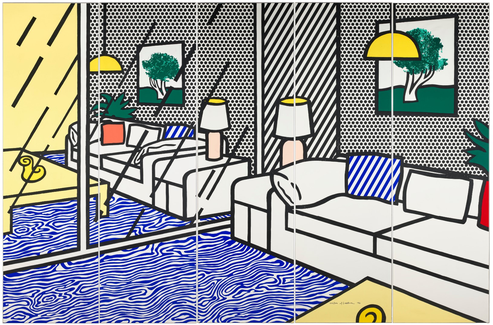 Wallpaper with Blue Floor Interior is the last in Lichtenstein’s Interiors series of the early 1990s, which presents modern, impersonal interior scenes reminiscent of motel rooms – anonymous and unlived in. The series was inspired by a billboard advertisement that Lichtenstein saw in Rome in 1989. Upon returning to New York, he began to experiment with similar motifs that he found in Yellow Pages catalogues. Alike the endless advertisements in the Yellow Pages, the style and furniture of Lichtenstein’s pictorial compositions are also varied throughout the series; something for everyone, as our consumer society mandates. The ease of access and choice of pick recalls the notion of the Yellow Pages slogan: “Let your fingers do the walking”, which Lichtenstein quite literally adopts. Appropriating advertisement clippings in the comic-strip spirit of Pop, Lichtenstein creates new composite forms served up as large-scale dreams, bringing to life the idyllic domestic fantasy sold in the Yellow Pages.