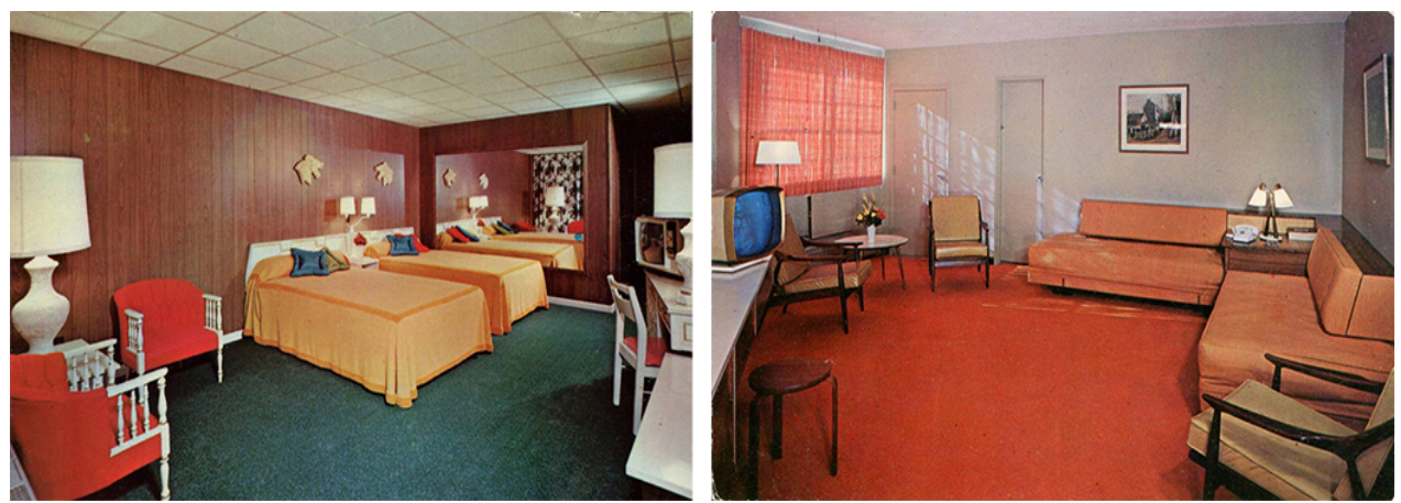 Mid-Century motel postcards from The Continental Inn, Lexington, Kentucky (left) and the Stadium Motor Lodge, 65 Deluxe Fireproof Rooms, New York (right).