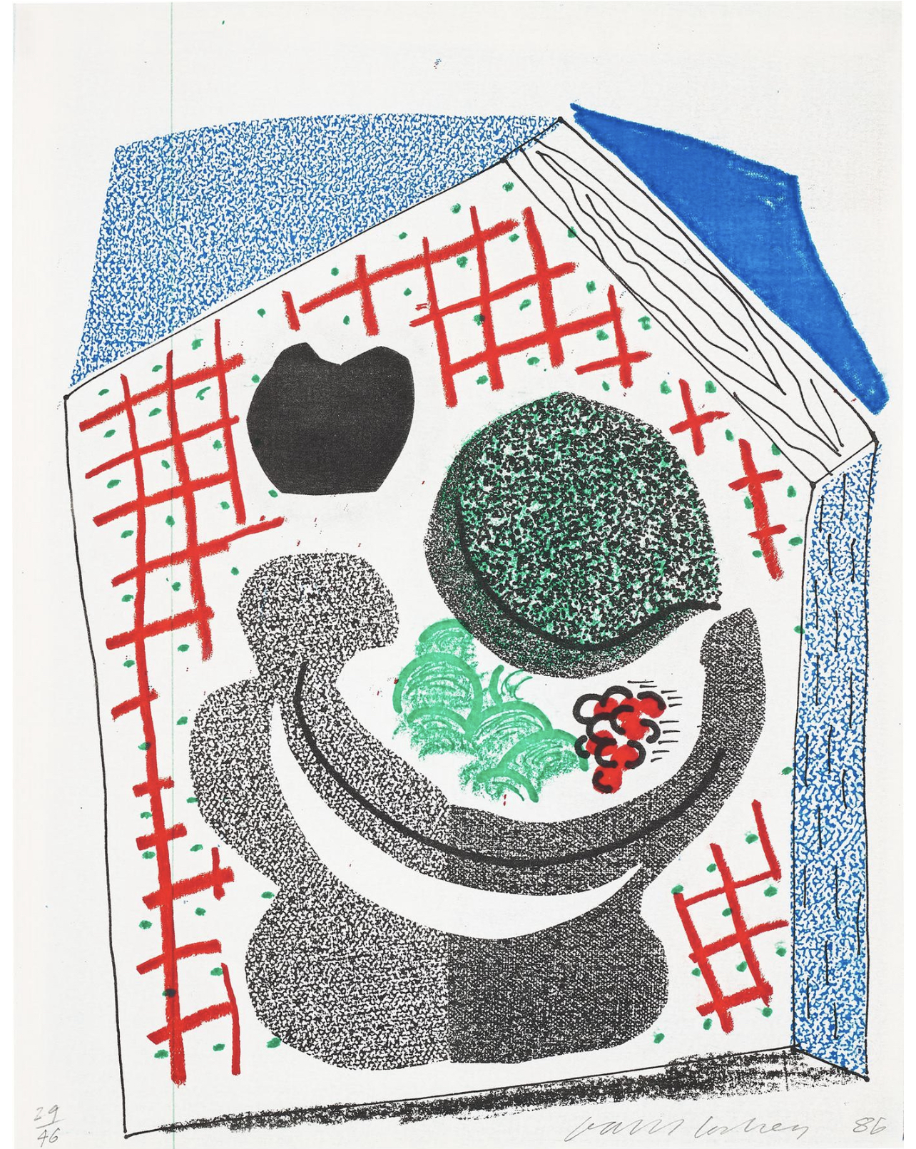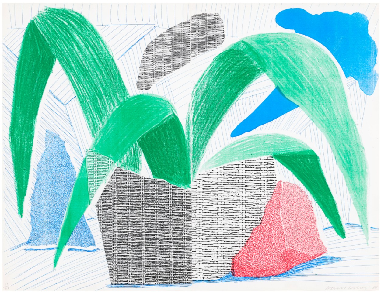 In 1986, Hockney began experimenting with the photocopier as a new medium for printmaking. This innovative process significantly shaped his creative output in the months that followed.