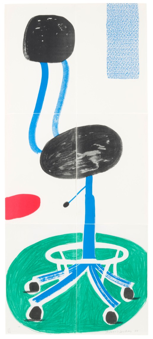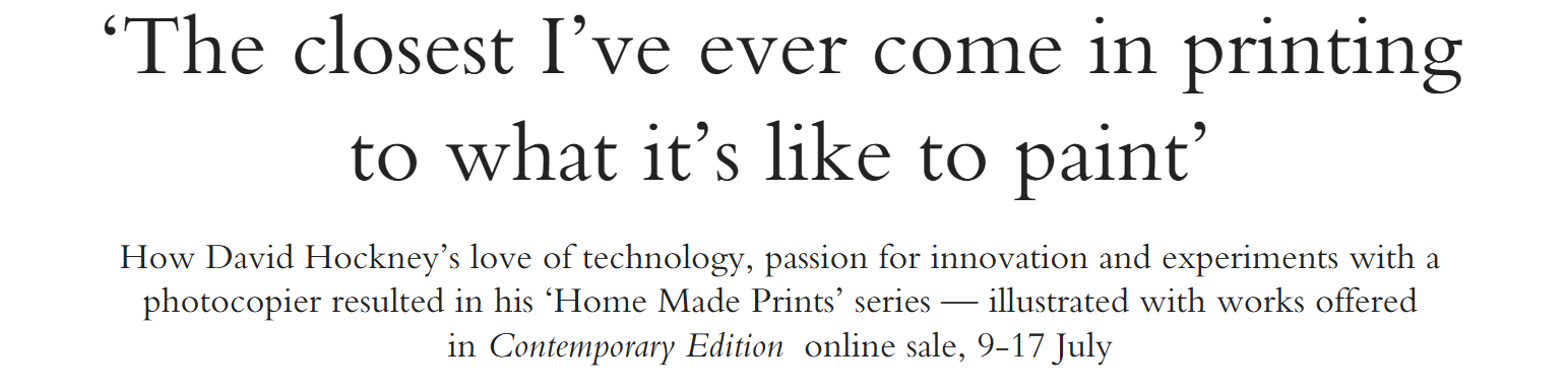 It occurs to Hockney to take an unconventional printmaking machine in the context of art, the office photocopier, in order to produce layered images much like lithographs. With speed and efficiency, he can switch different colored ink cartridges, reduce or enlarge the scanned image, repeat parts, and “photograph” objects on the scanning bed, all without needing an assistant. From his “Home Made Prints” he designs and publishes a catalogue available for sale at his gallery exhibitions.