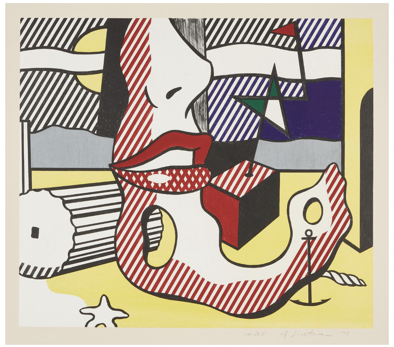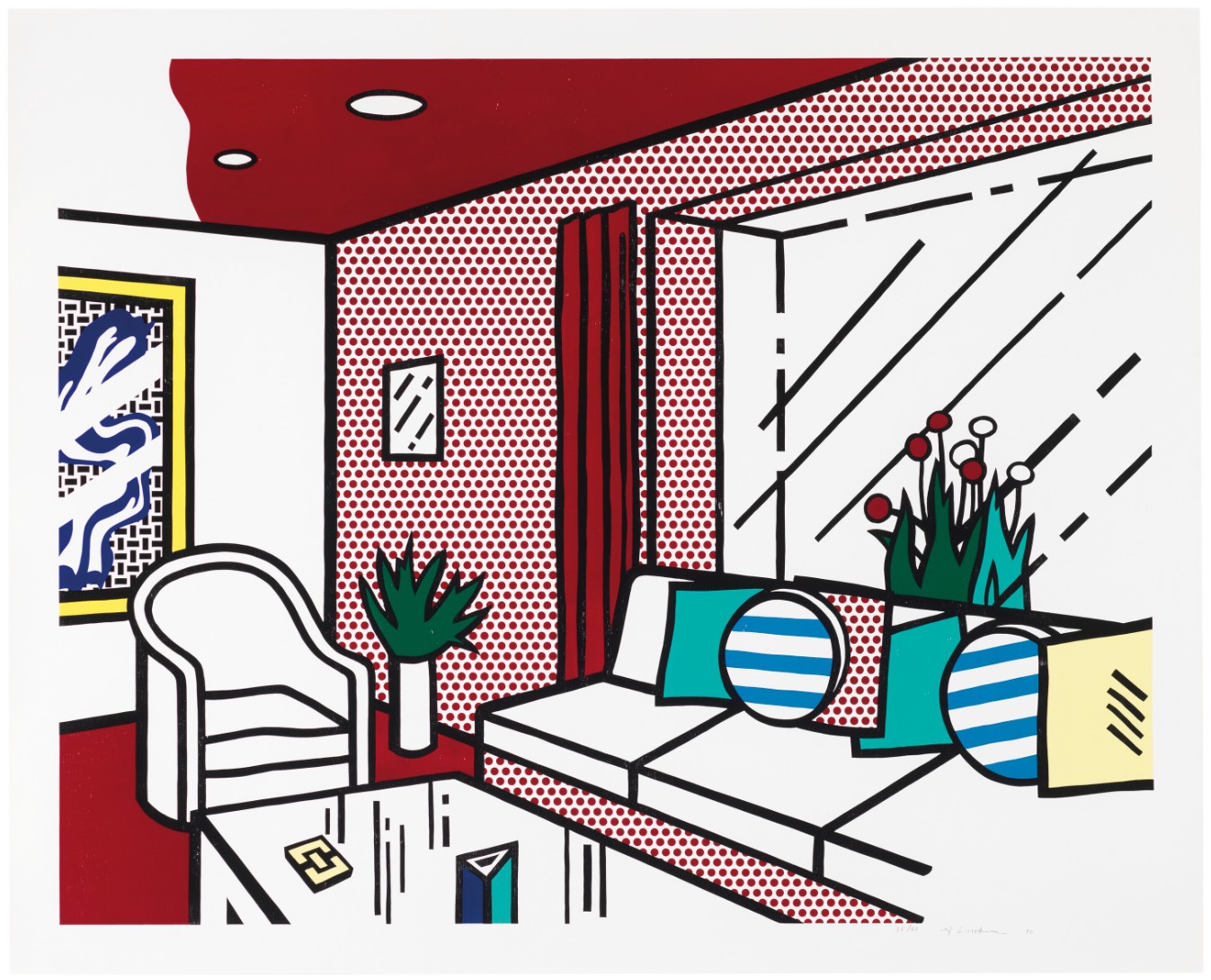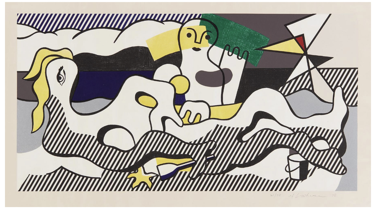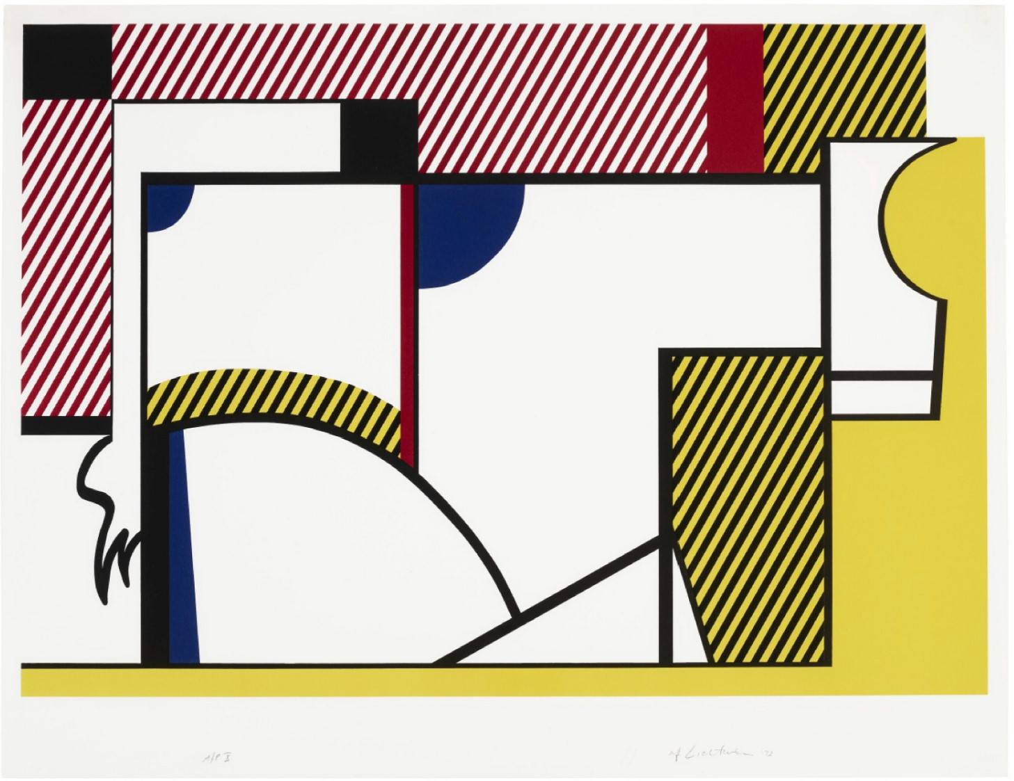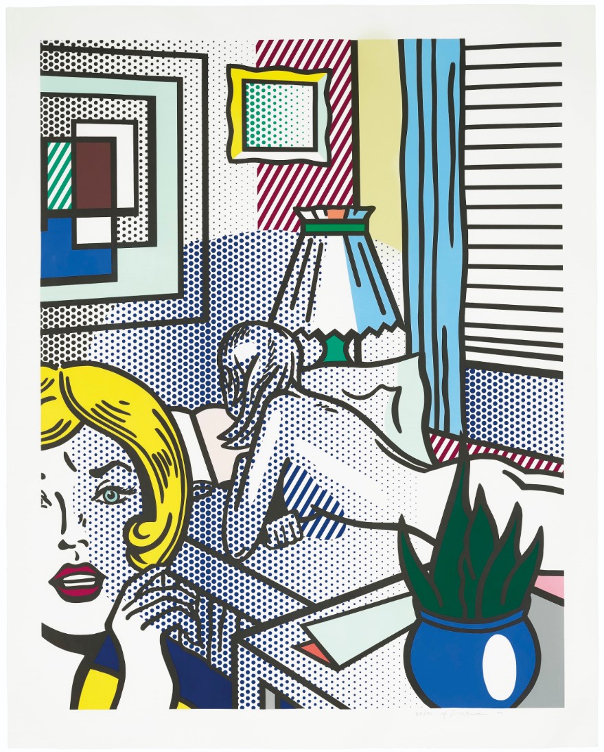 Roy Lichtenstein approached the distinguished artistic genre of the female nude late in his career, innovating on a classic subject with his Pop Art treatment. Developed from comic book figures which defined his early successful works, Lichtenstein’s Nudes series, comprised of nine prints, refined and expanded upon his distinctive dialect of bold patterns and bright colors. The use of Benday dots, generated by computer for the first time in Lichtenstein’s work, create a playful chiaroscuro. Expansion in palate, beyond the primary red, blues and yellows of his early style, mark Lichtenstein’s refinement of the Pop Art signature style. The final major series before his death in 1997, Lichtenstein’s Nudes exemplify his innovative spirit while remaining true to the bright, playful style he pioneered. Lichtenstein composed his nude figures from printed sources, taking comic book characters and removing their clothing. Removing the forms of his heroines from the confines of reality, Lichtenstein used the minimalistic detail of the nude figures as a foil to his more involved domestic interiors. The emphasis on background rather than human subject highlights his interest in in the genre of the nude as a space for further refining his color and pattern applications.