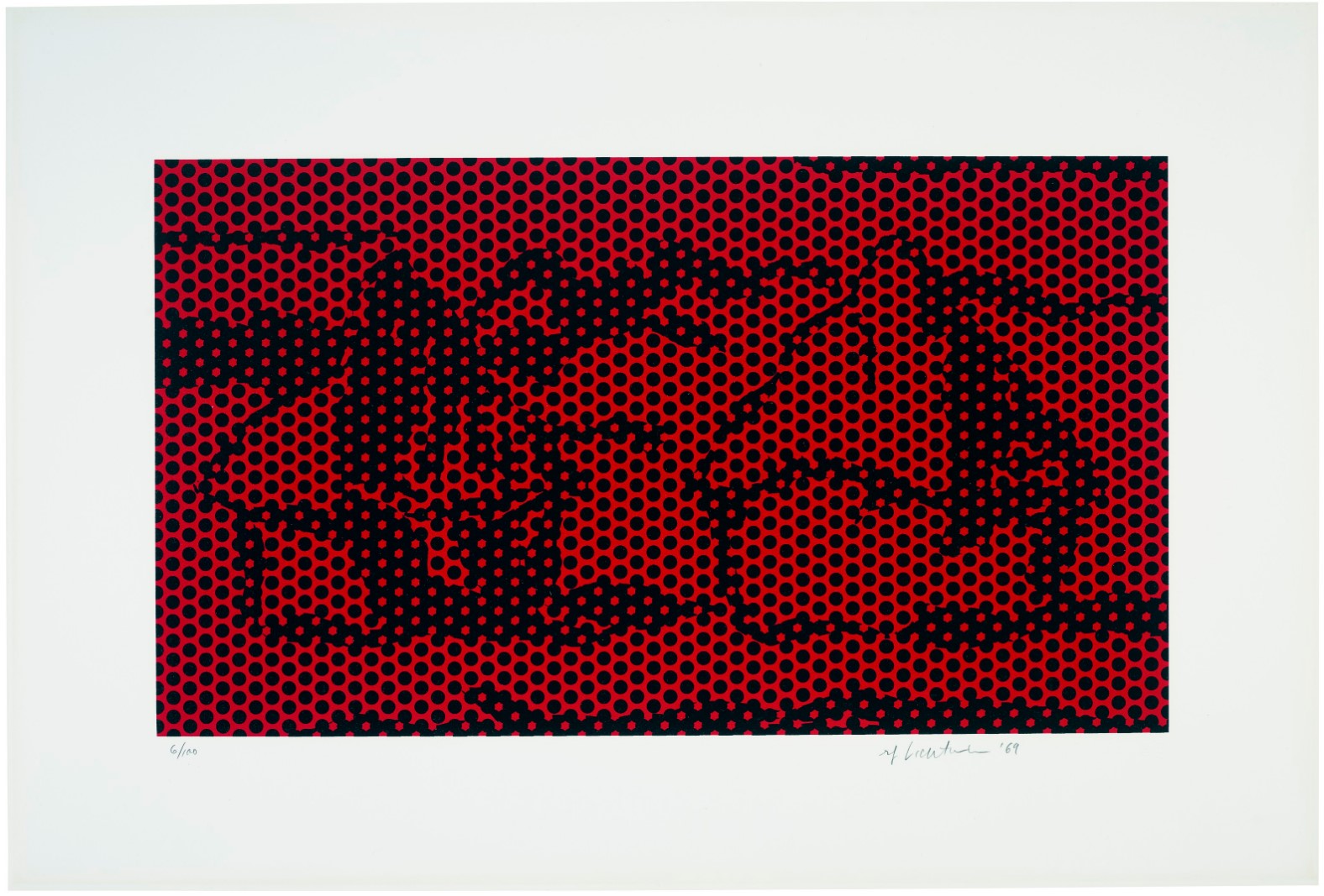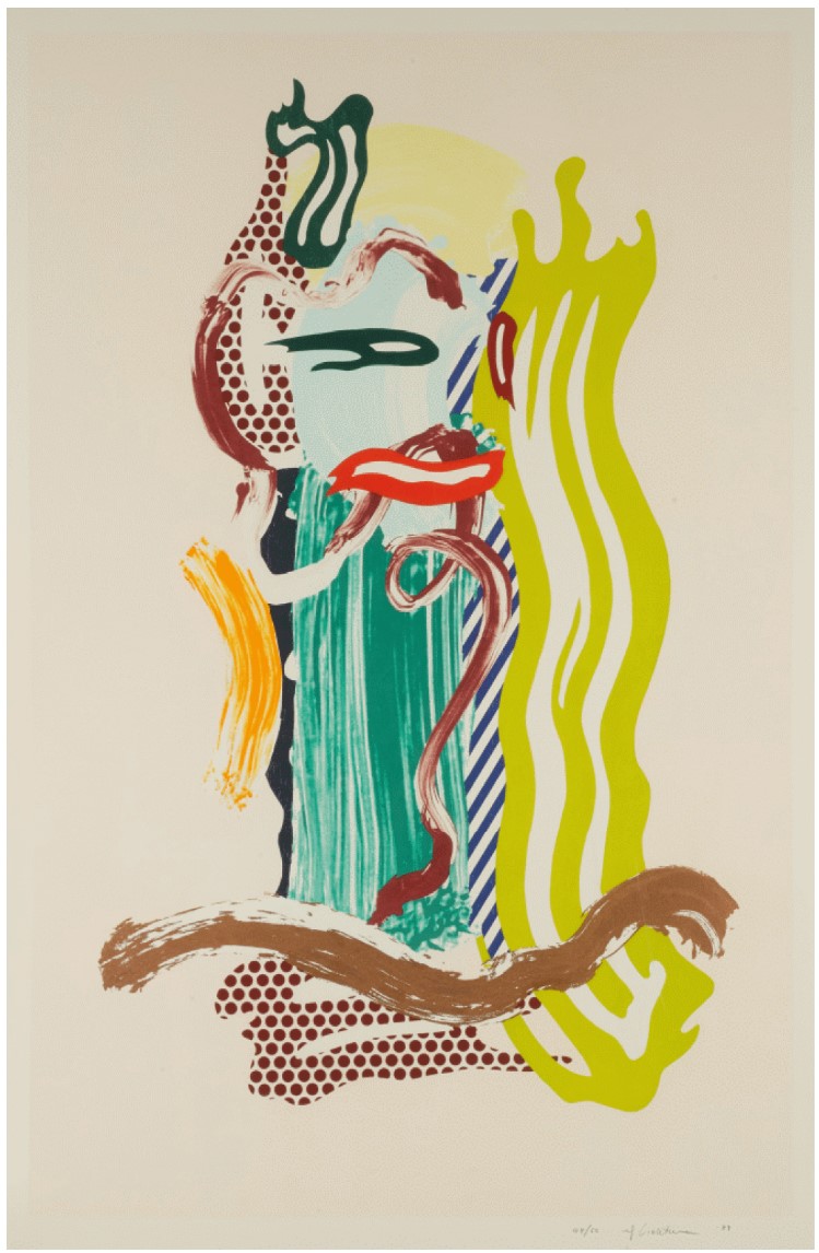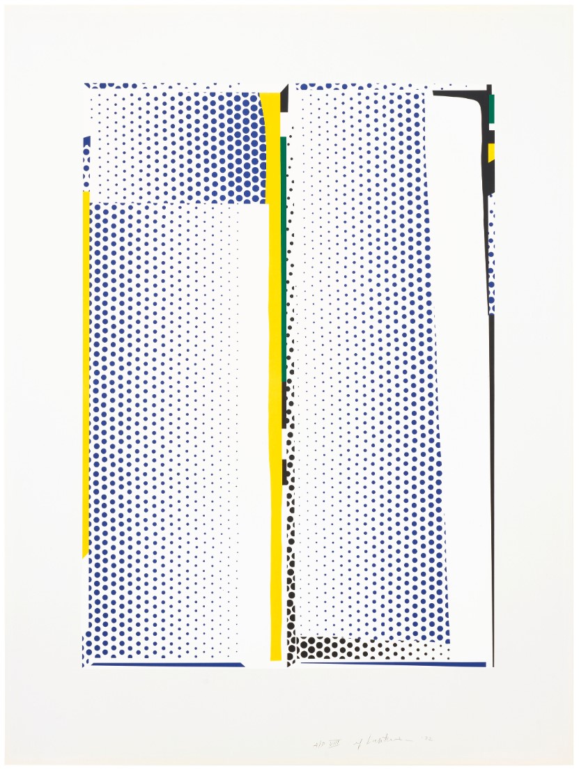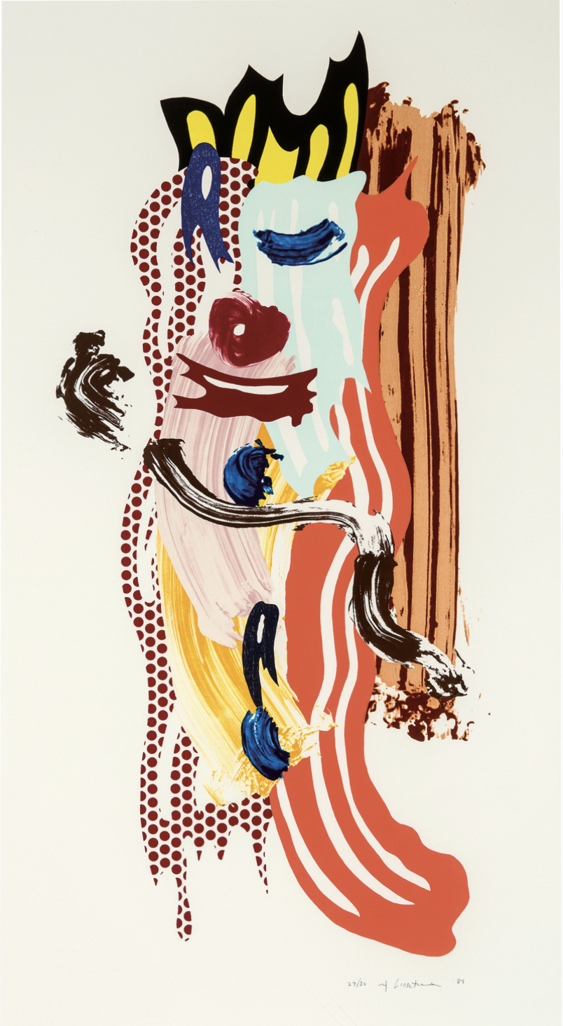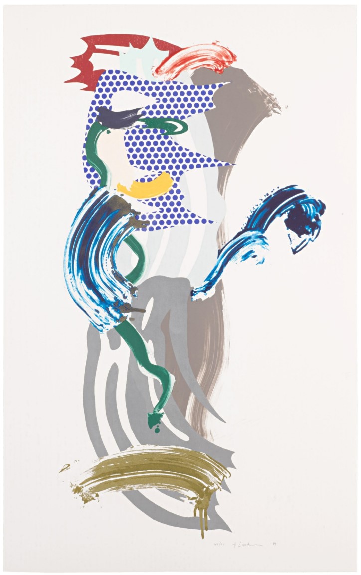Brushstrokes was created for Roy Lichtenstein’s 1967 exhibition at the Pasadena Art Museum. The artist created a series of brushstroke works as a satirical response to the emotion-laden gestural paintings of the dominant Abstract Expressionists. Lichtenstein was interested in creating an image of brushstrokes that looked as though they had been rendered by a commercial artist. The print’s composition is wonderfully formal, floating the reinterpreted painter’s brushstrokes on top of a blue Ben Day dot background. The artist now depersonalized the idea of painting as an action and took back the brushstroke as part of his own personal expression through printmaking.