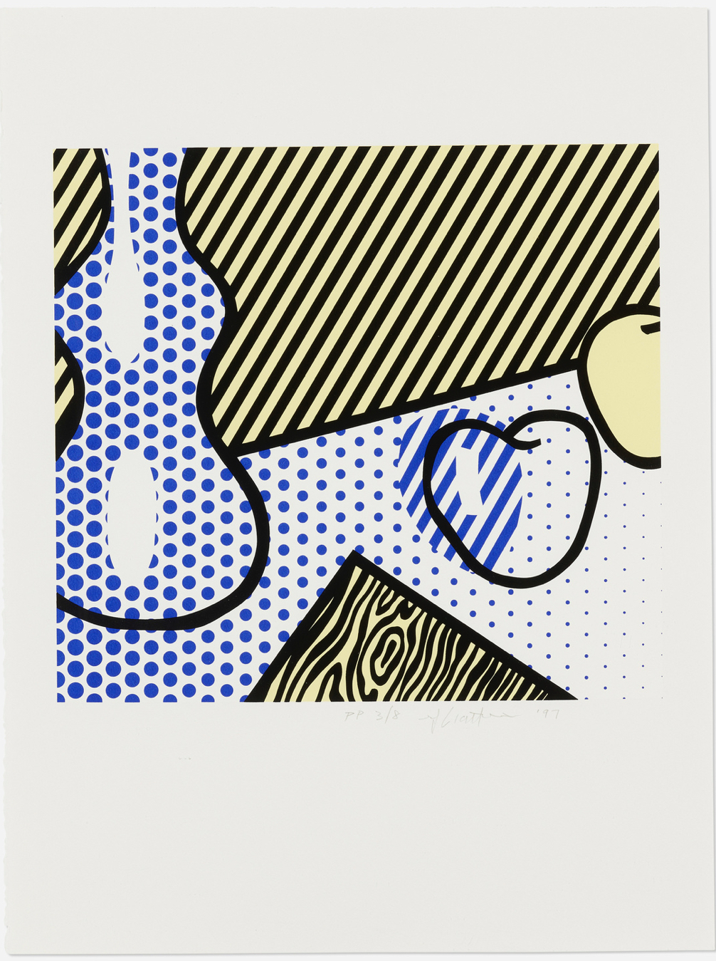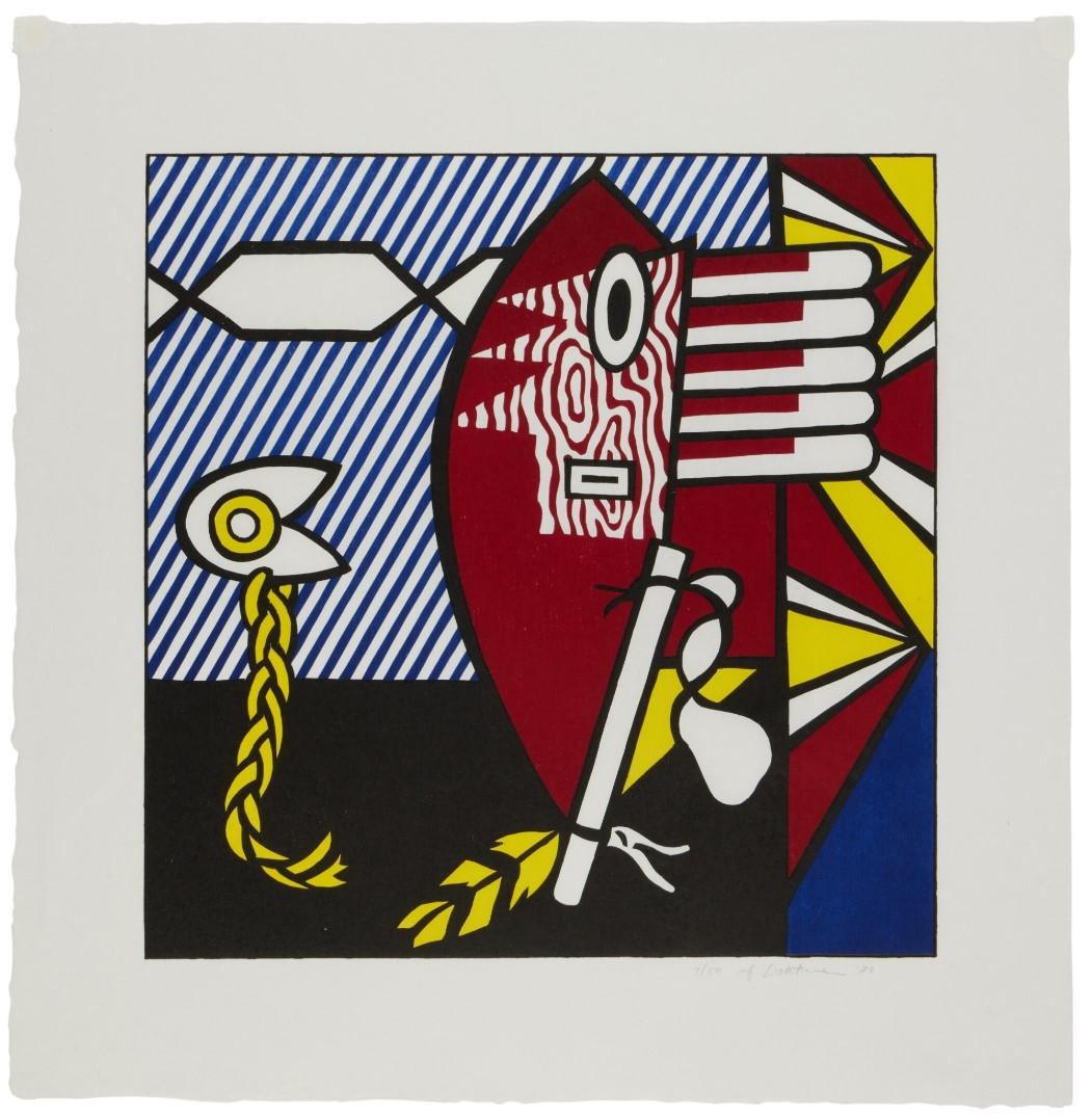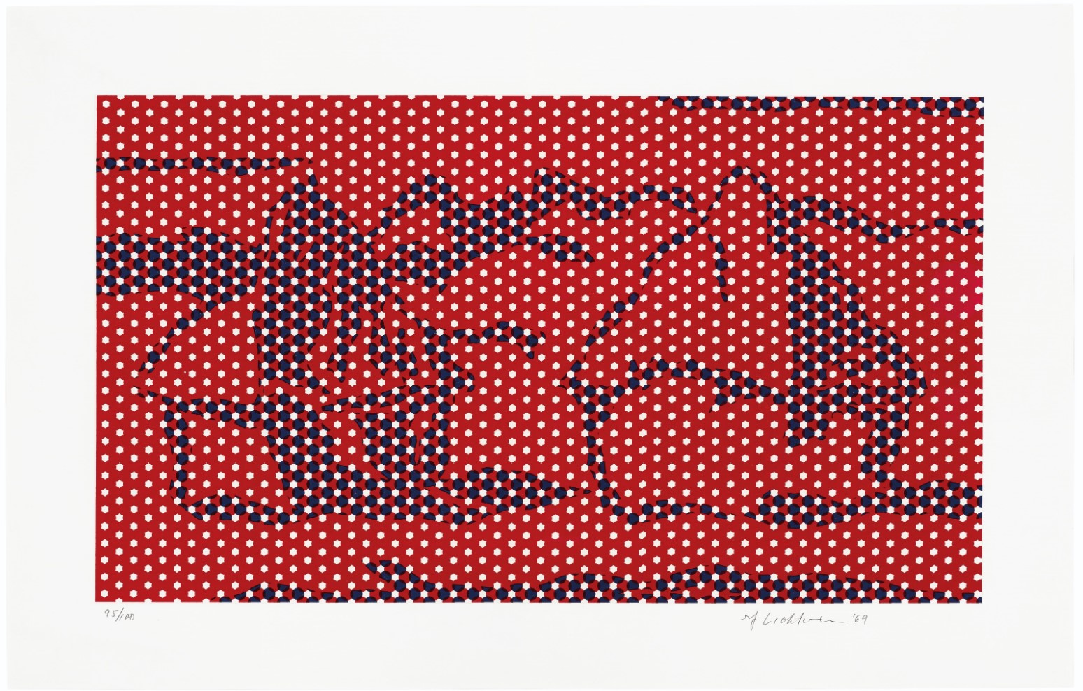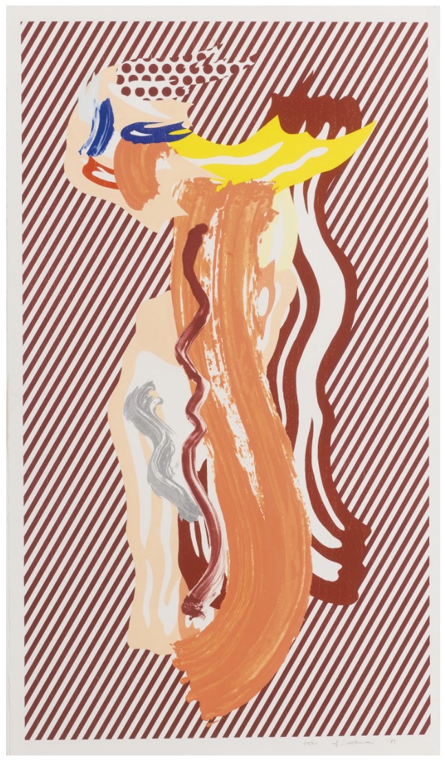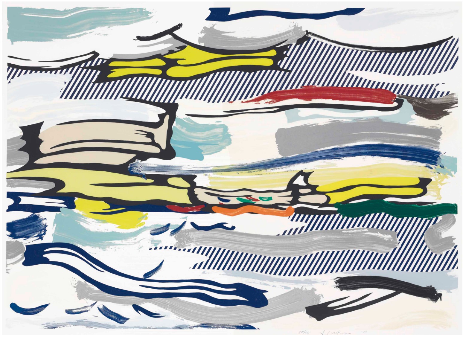 Brushstrokes was created for Roy Lichtenstein’s 1967 exhibition at the Pasadena Art Museum. The artist created a series of brushstroke works as a satirical response to the emotion-laden gestural paintings of the dominant Abstract Expressionists. Lichtenstein was interested in creating an image of brushstrokes that looked as though they had been rendered by a commercial artist. The print’s composition is wonderfully formal, floating the reinterpreted painter’s brushstrokes on top of a blue Ben Day dot background. The artist now depersonalized the idea of painting as an action and took back the brushstroke as part of his own personal expression through printmaking.