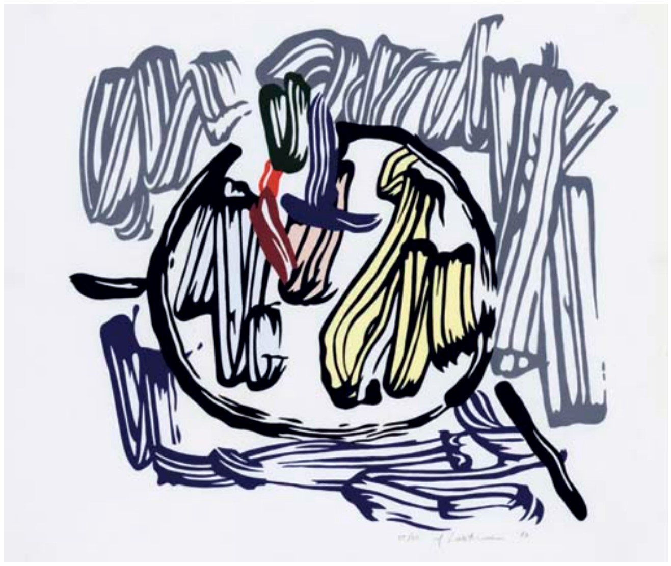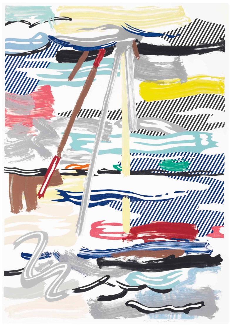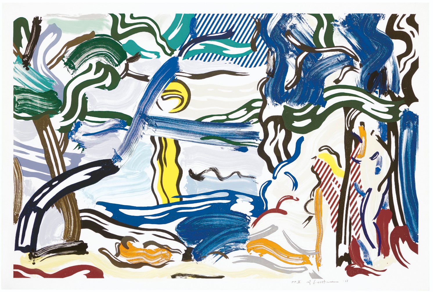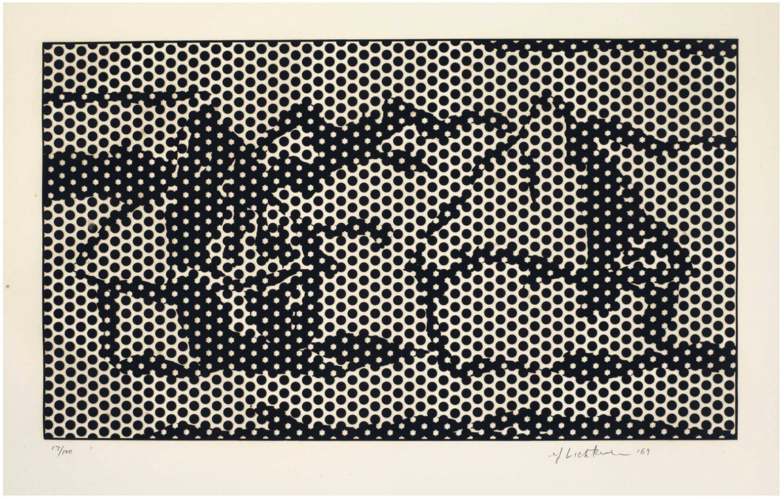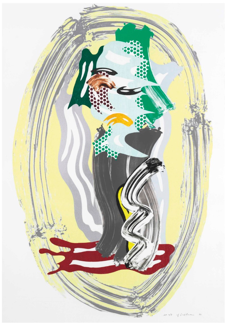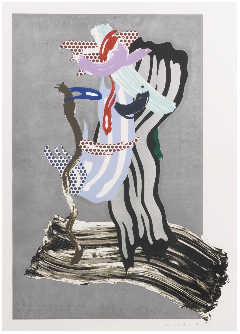 Brushstrokes was created for Roy Lichtenstein’s 1967 exhibition at the Pasadena Art Museum. The artist created a series of brushstroke works as a satirical response to the emotion-laden gestural paintings of the dominant Abstract Expressionists. Lichtenstein was interested in creating an image of brushstrokes that looked as though they had been rendered by a commercial artist. The print’s composition is wonderfully formal, floating the reinterpreted painter’s brushstrokes on top of a blue Ben Day dot background. The artist now depersonalized the idea of painting as an action and took back the brushstroke as part of his own personal expression through printmaking.