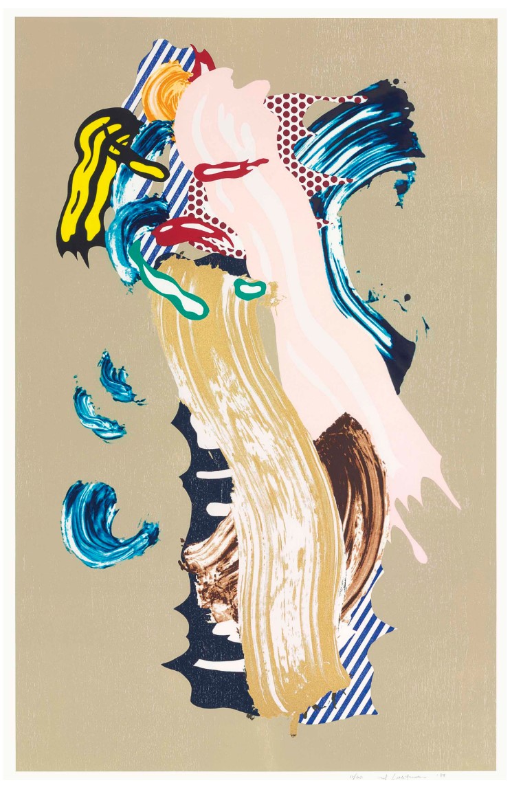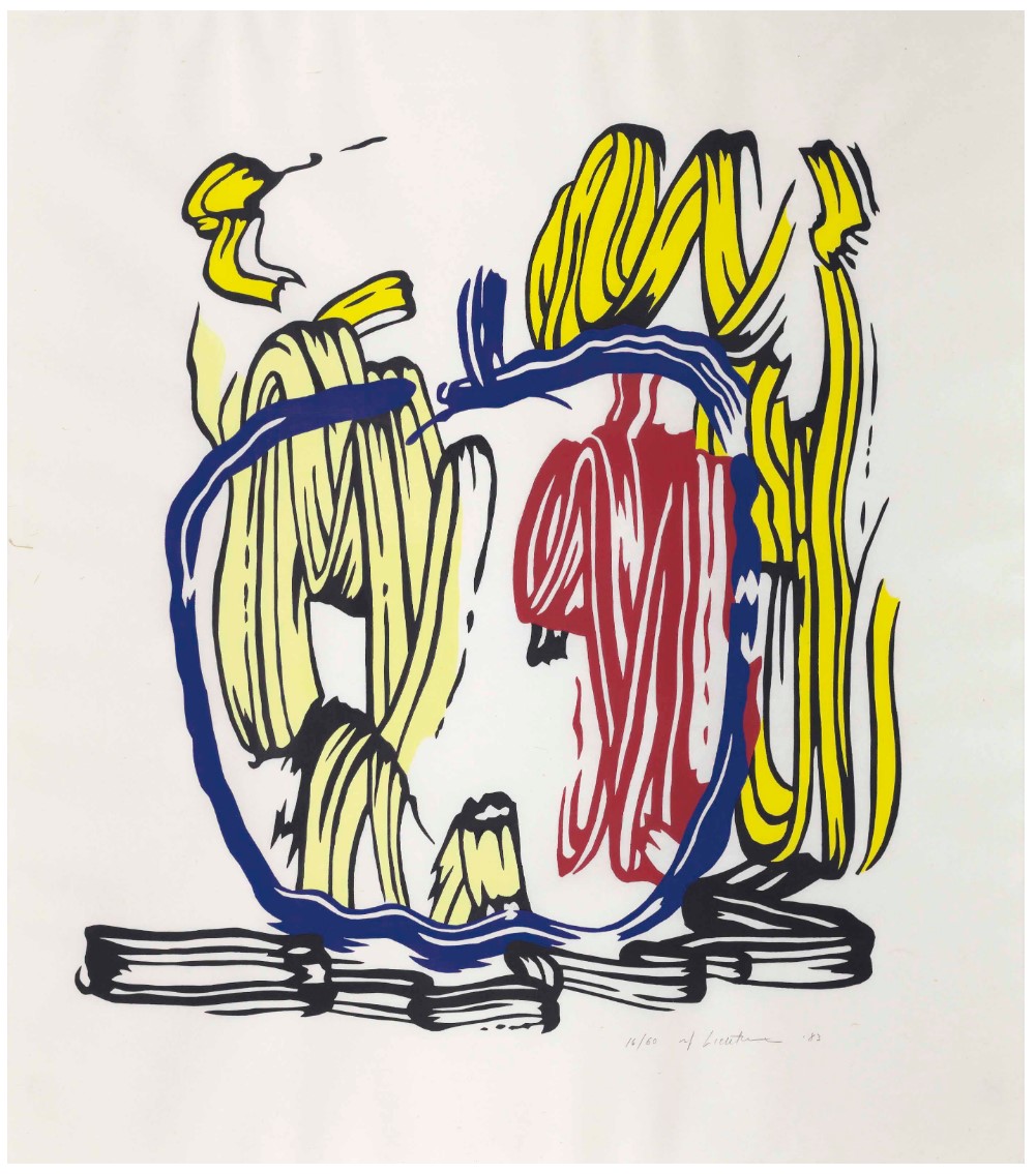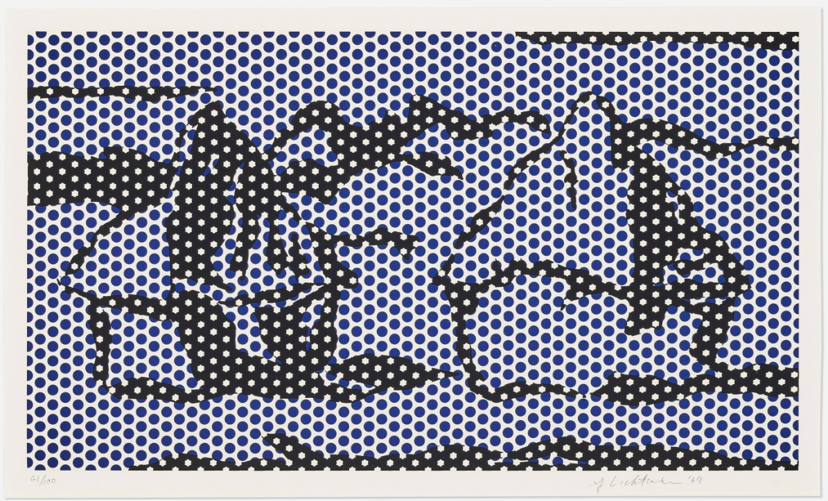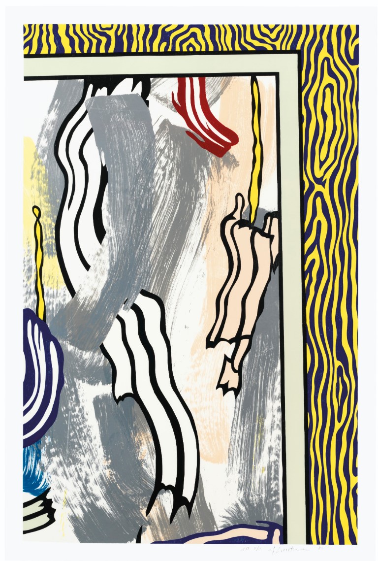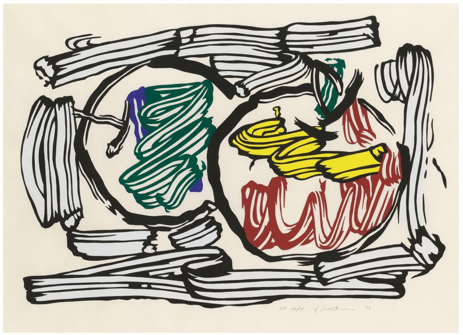 Brushstrokes was created for Roy Lichtenstein’s 1967 exhibition at the Pasadena Art Museum. The artist created a series of brushstroke works as a satirical response to the emotion-laden gestural paintings of the dominant Abstract Expressionists. Lichtenstein was interested in creating an image of brushstrokes that looked as though they had been rendered by a commercial artist. The print’s composition is wonderfully formal, floating the reinterpreted painter’s brushstrokes on top of a blue Ben Day dot background. The artist now depersonalized the idea of painting as an action and took back the brushstroke as part of his own personal expression through printmaking.