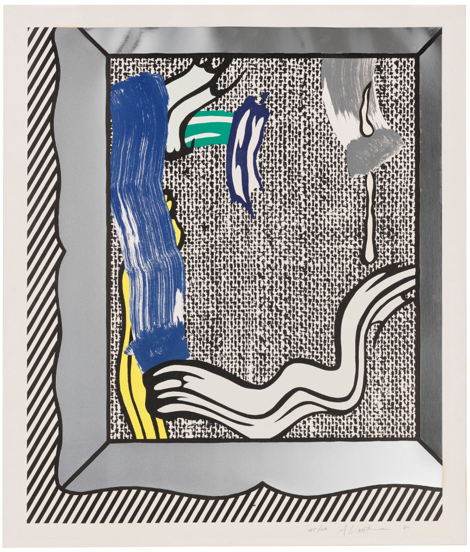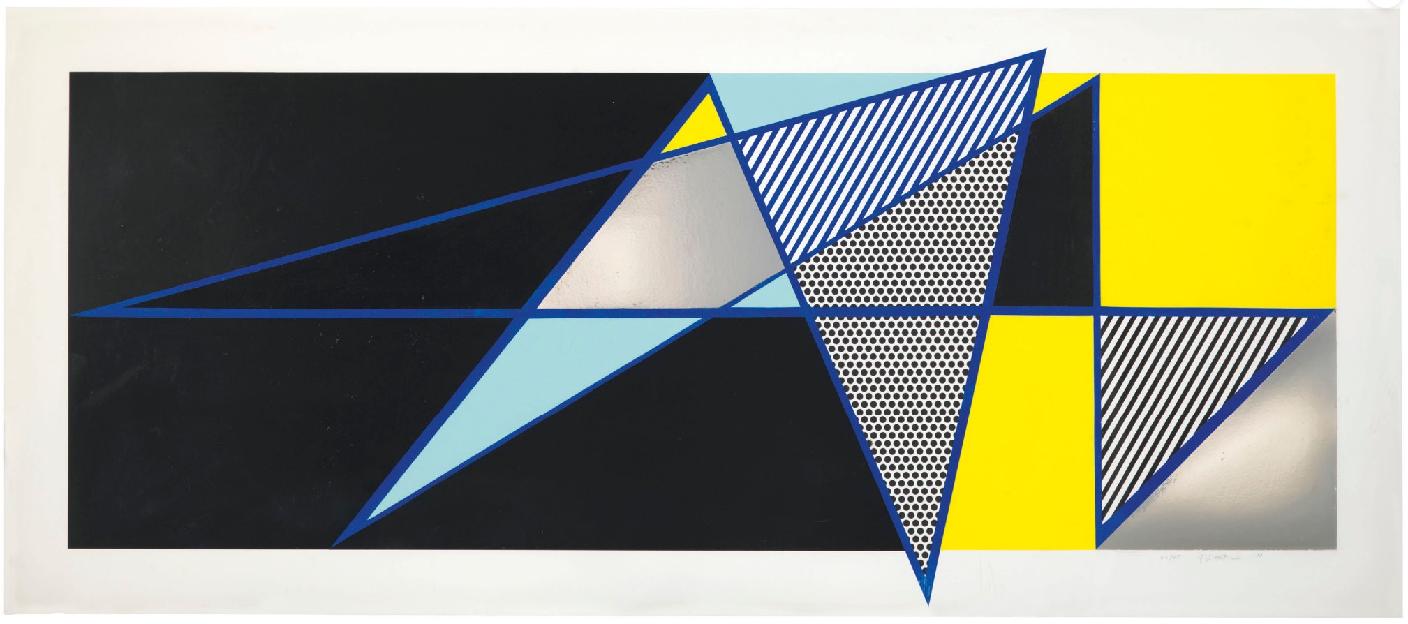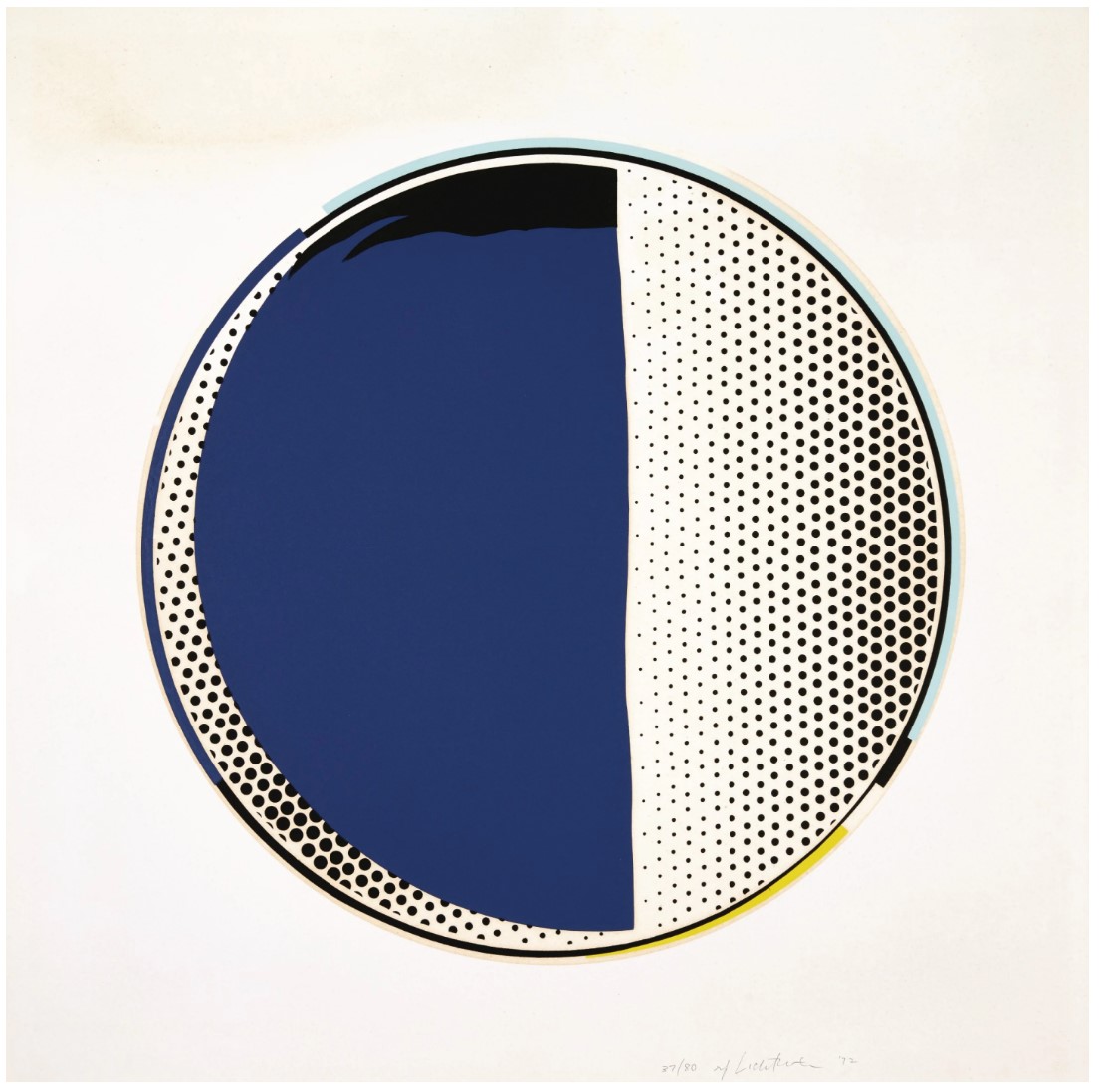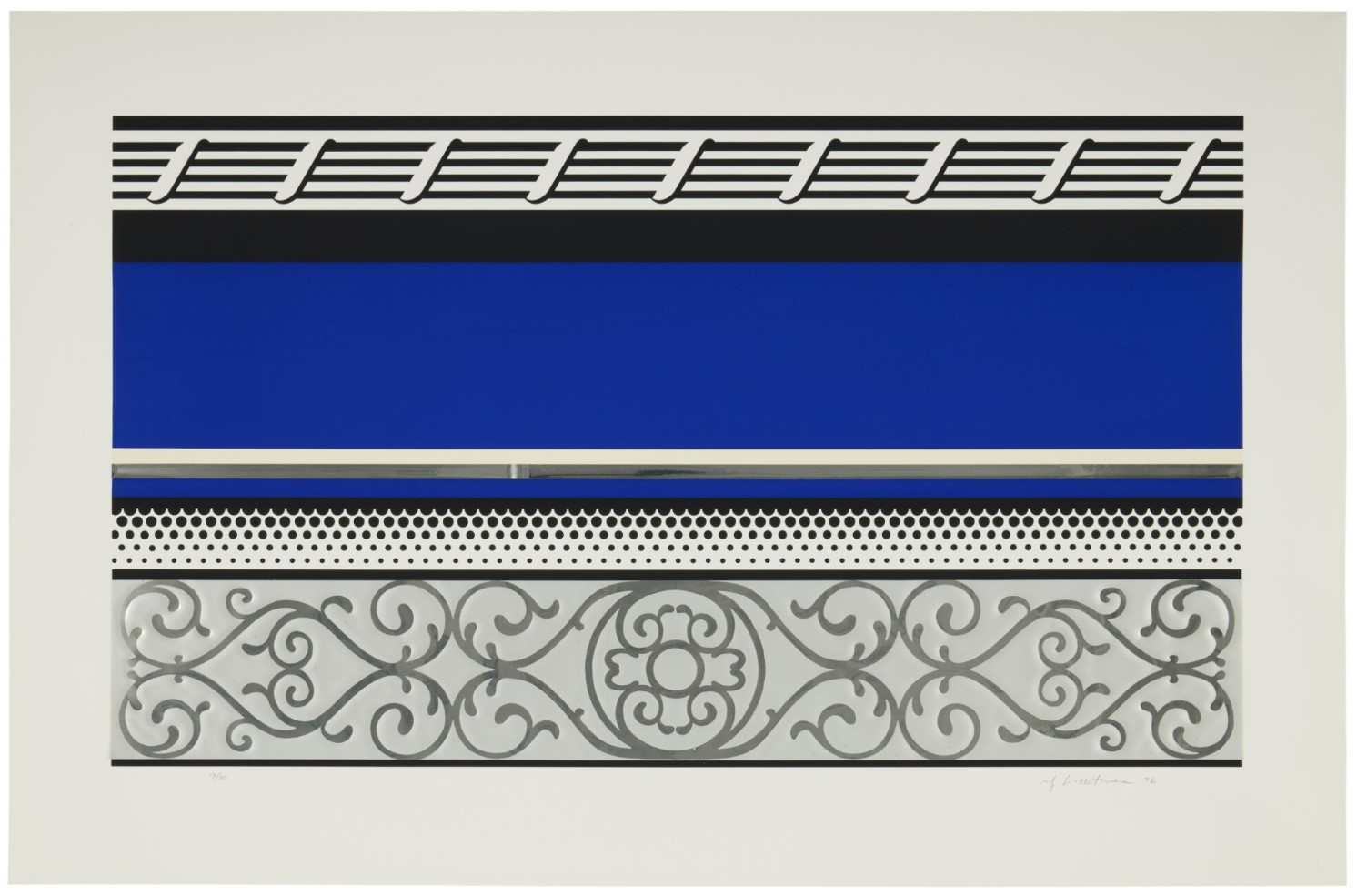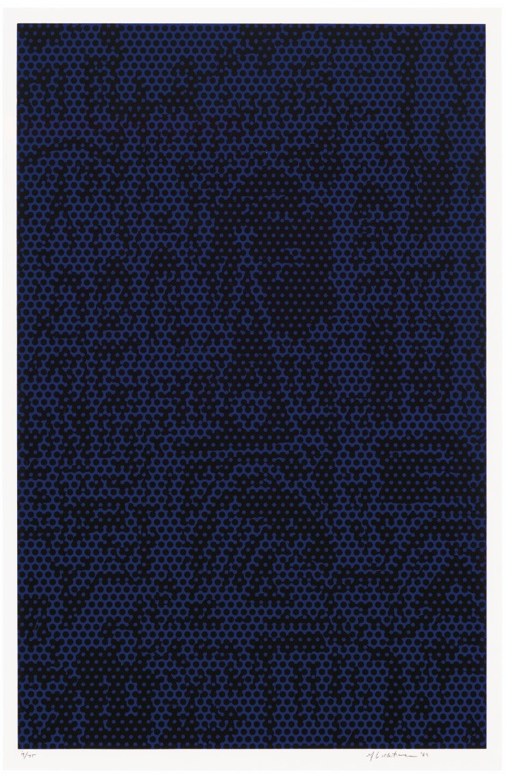 Brushstrokes was created for Roy Lichtenstein’s 1967 exhibition at the Pasadena Art Museum. The artist created a series of brushstroke works as a satirical response to the emotion-laden gestural paintings of the dominant Abstract Expressionists. Lichtenstein was interested in creating an image of brushstrokes that looked as though they had been rendered by a commercial artist. The print’s composition is wonderfully formal, floating the reinterpreted painter’s brushstrokes on top of a blue Ben Day dot background. The artist now depersonalized the idea of painting as an action and took back the brushstroke as part of his own personal expression through printmaking.