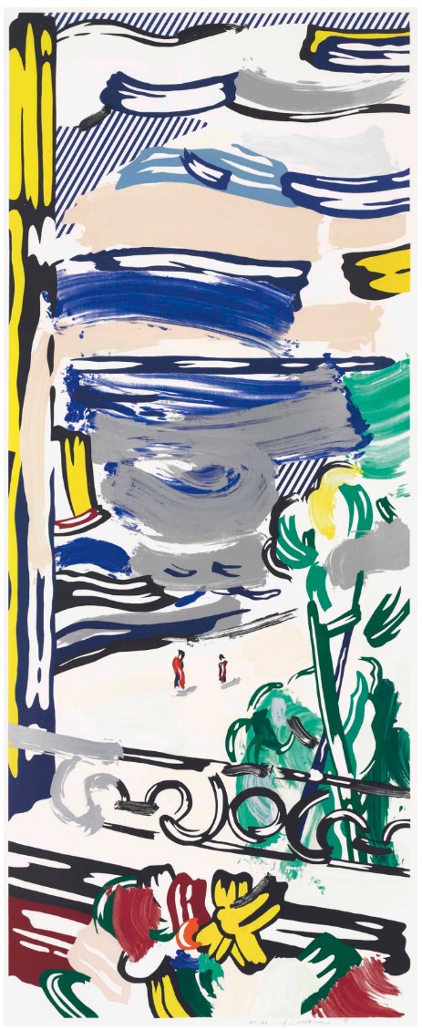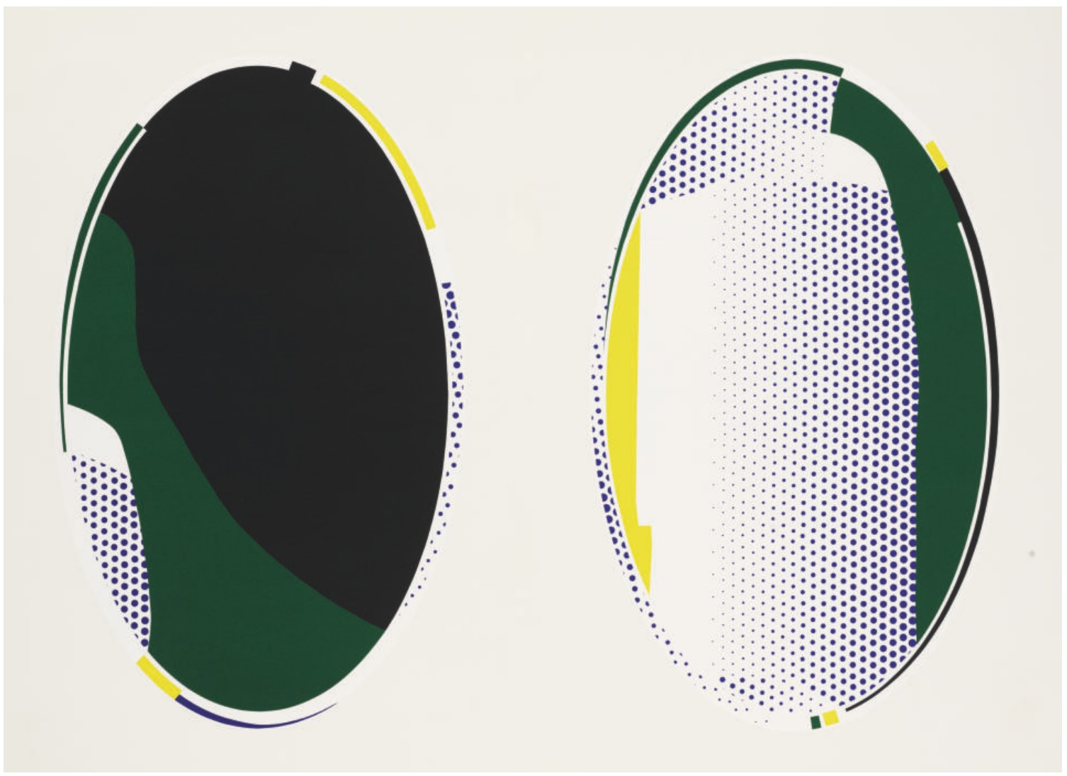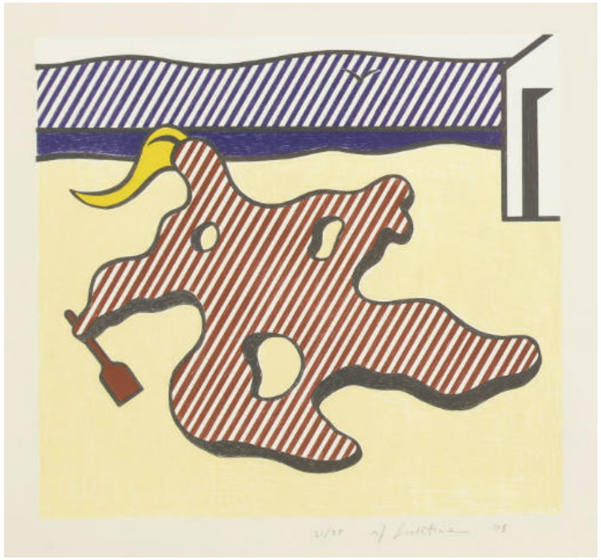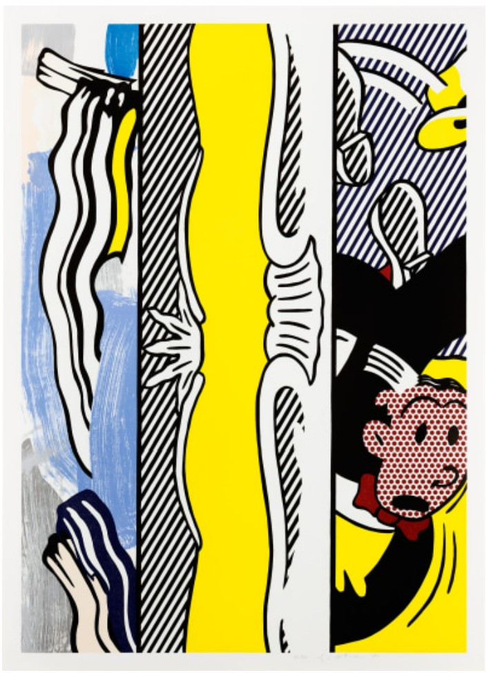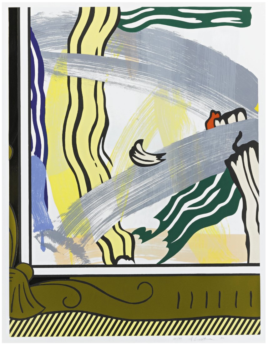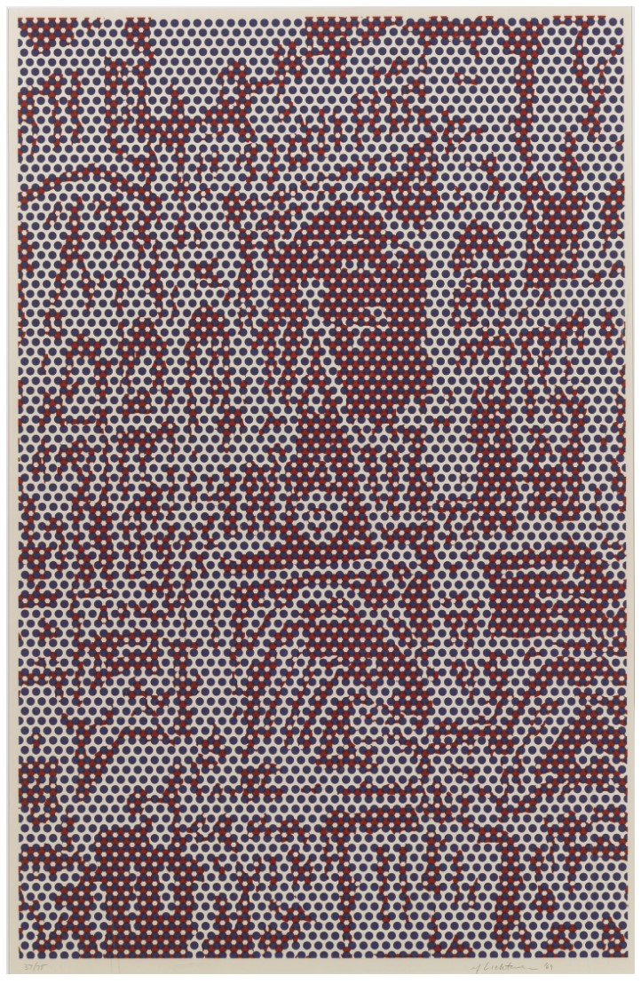 Brushstrokes was created for Roy Lichtenstein’s 1967 exhibition at the Pasadena Art Museum. The artist created a series of brushstroke works as a satirical response to the emotion-laden gestural paintings of the dominant Abstract Expressionists. Lichtenstein was interested in creating an image of brushstrokes that looked as though they had been rendered by a commercial artist. The print’s composition is wonderfully formal, floating the reinterpreted painter’s brushstrokes on top of a blue Ben Day dot background. The artist now depersonalized the idea of painting as an action and took back the brushstroke as part of his own personal expression through printmaking.