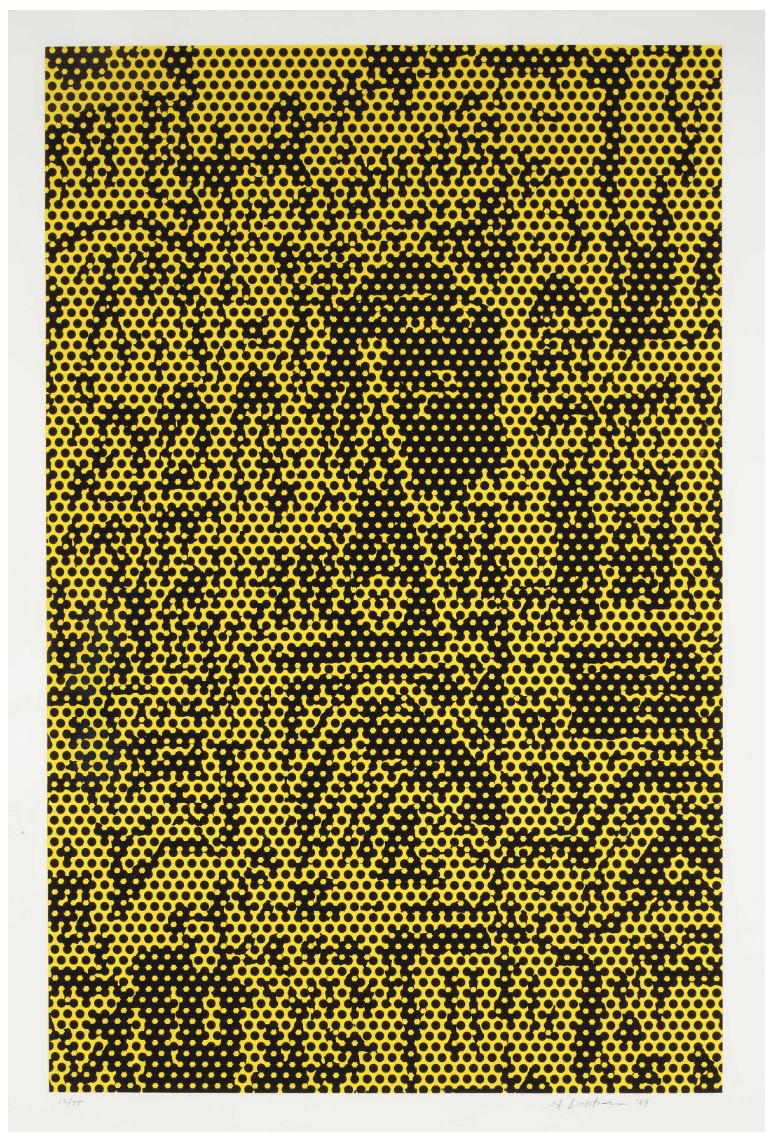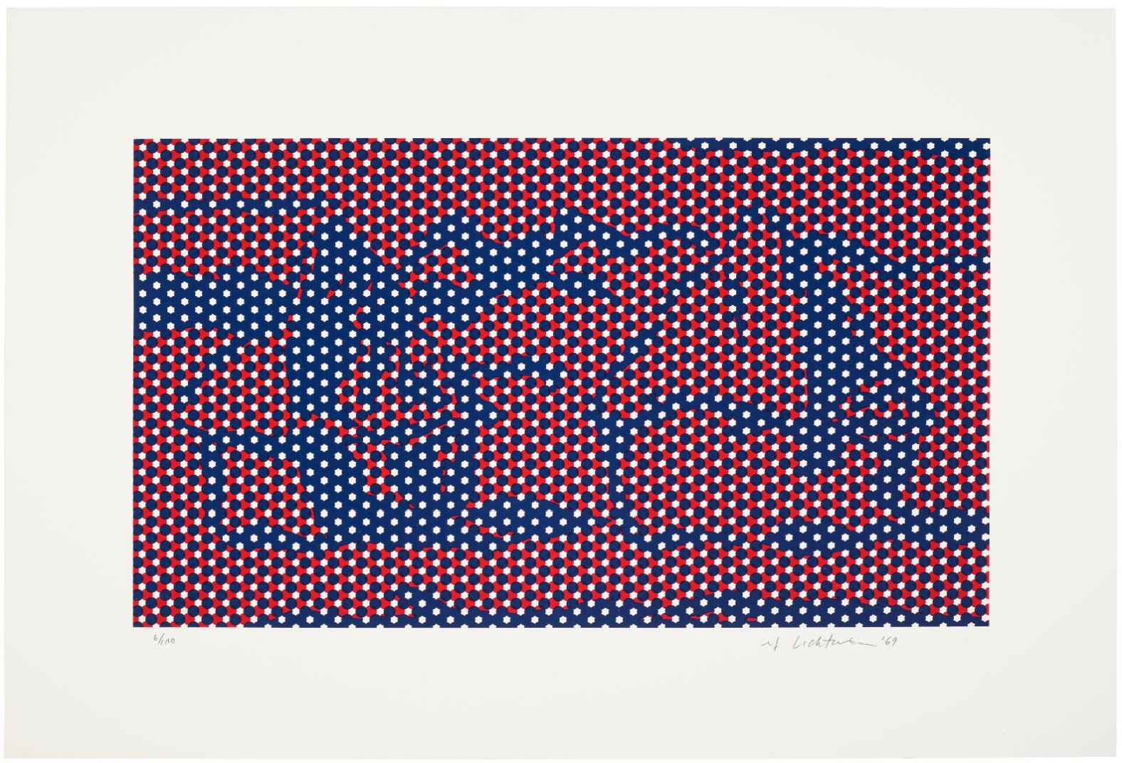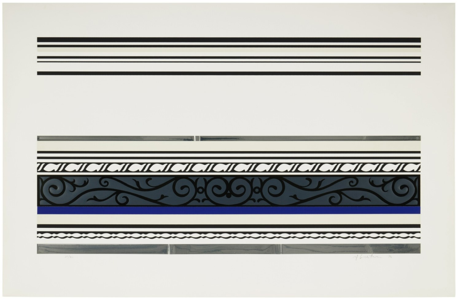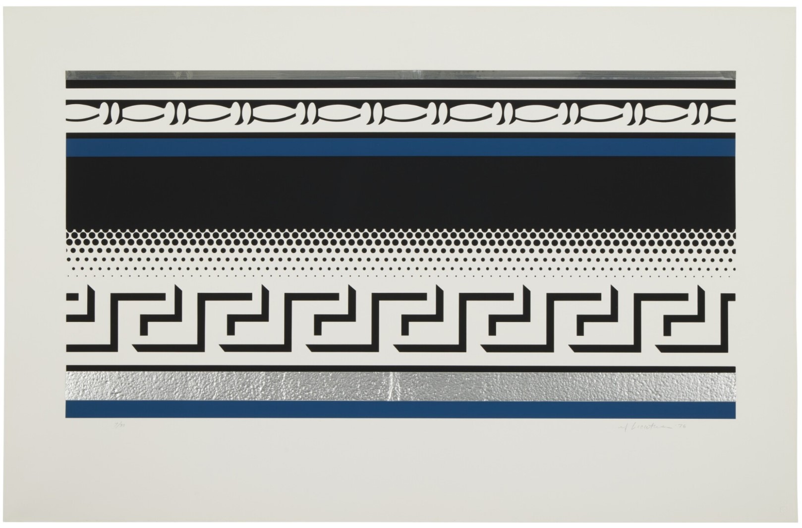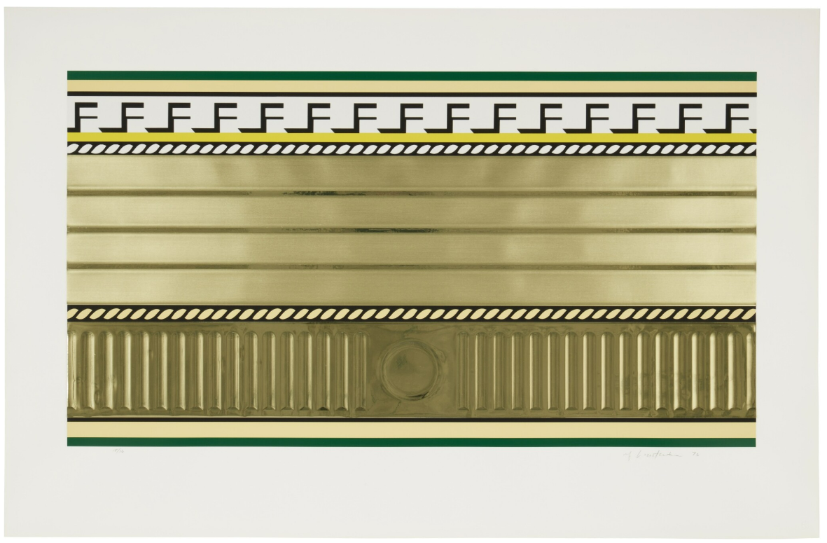 Brushstrokes was created for Roy Lichtenstein’s 1967 exhibition at the Pasadena Art Museum. The artist created a series of brushstroke works as a satirical response to the emotion-laden gestural paintings of the dominant Abstract Expressionists. Lichtenstein was interested in creating an image of brushstrokes that looked as though they had been rendered by a commercial artist. The print’s composition is wonderfully formal, floating the reinterpreted painter’s brushstrokes on top of a blue Ben Day dot background. The artist now depersonalized the idea of painting as an action and took back the brushstroke as part of his own personal expression through printmaking.