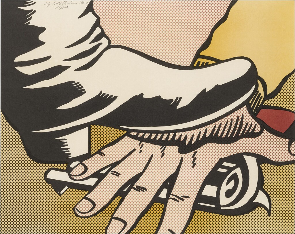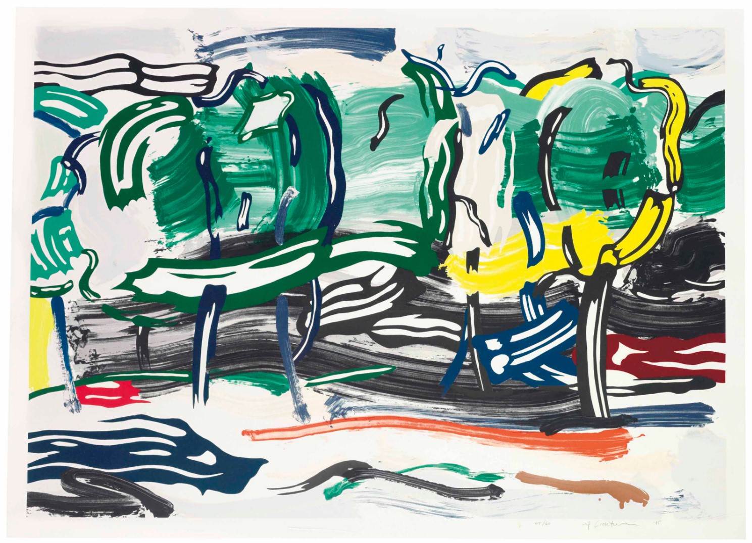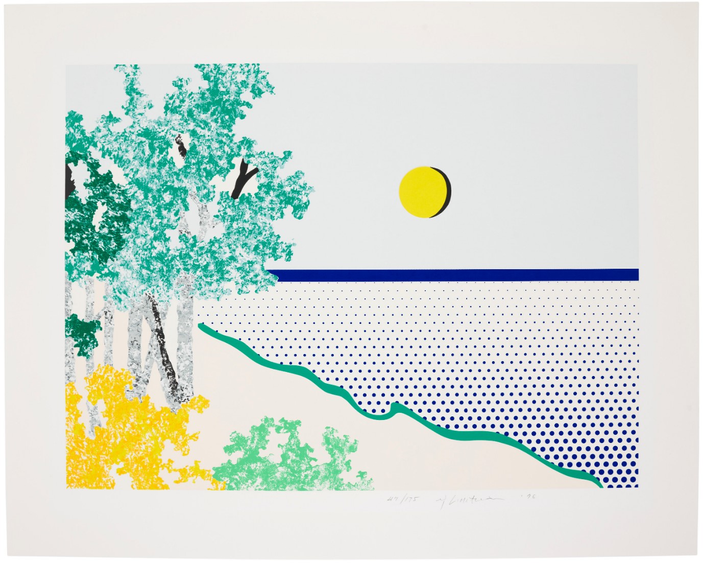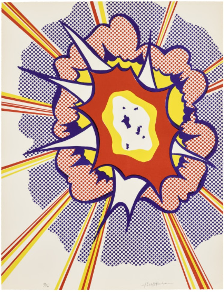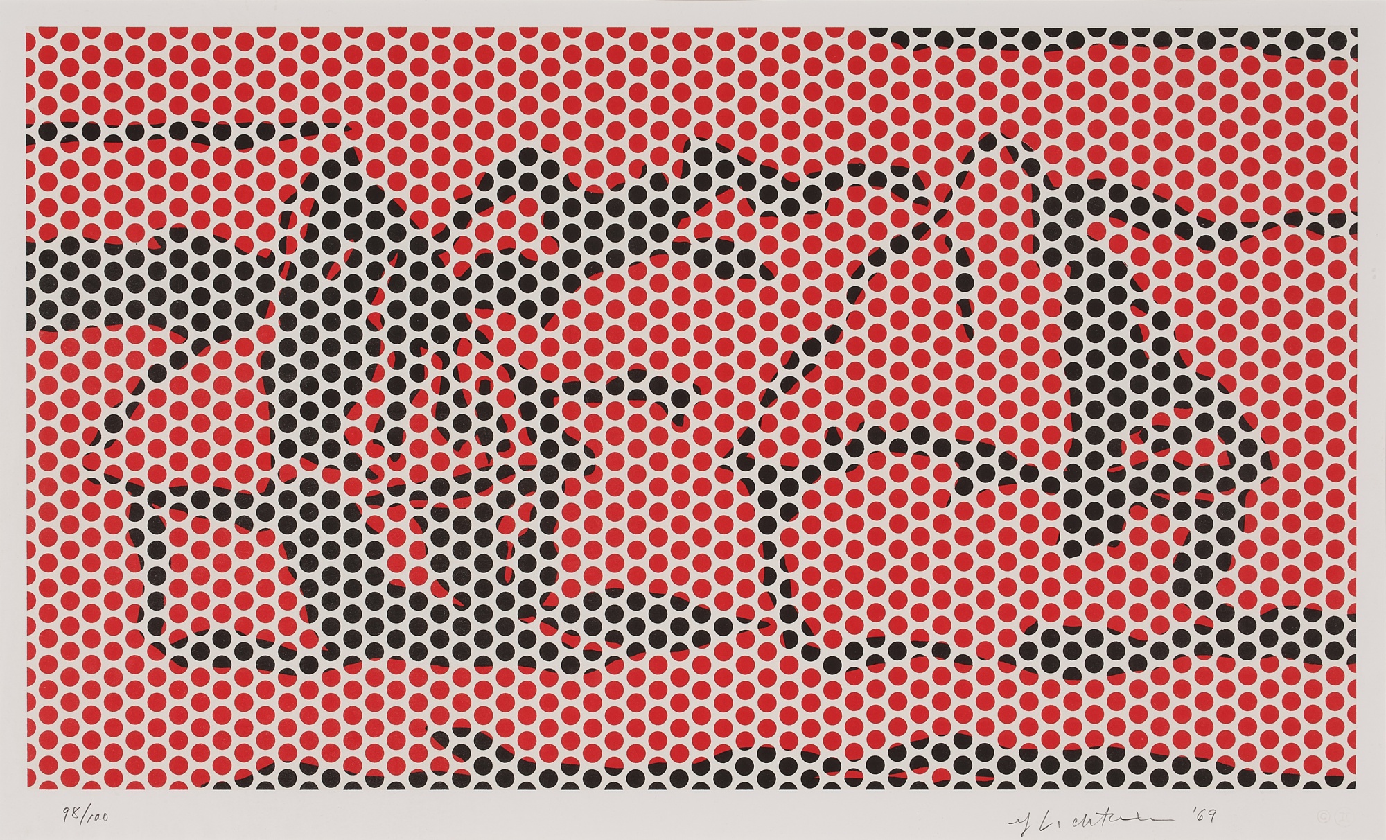Roy Lichtenstein is one of the originators of the Pop Art movement, famed for paintings that take kitsch and transform it into culture. Lichtenstein was born in New York City in 1923. Growing up, he took art classes at the Art Student League where he created realist paintings. Lichtenstein continued his study of art at Ohio State University but, with the advent of World War II, he enlisted in the army in 1943. Lichtenstein returned to Ohio State after the war to finish his master’s degree in studio art. While Lichtenstein was teaching art at Rutgers University, he became close with fellow artist Allan Kaprow, who introduced him to Claes Oldenburg. It was during the 1960s that Lichtenstein began experimenting with what would become his signature style of taking images from comic books and newspapers and reproducing them on a large scale, calling attention to the flatness of the imagery with his Ben-Day technique of painting dots. In 1962, Lichtenstein got his first break with a one-man show at the Leo Castelli Gallery, which sold out before it opened.