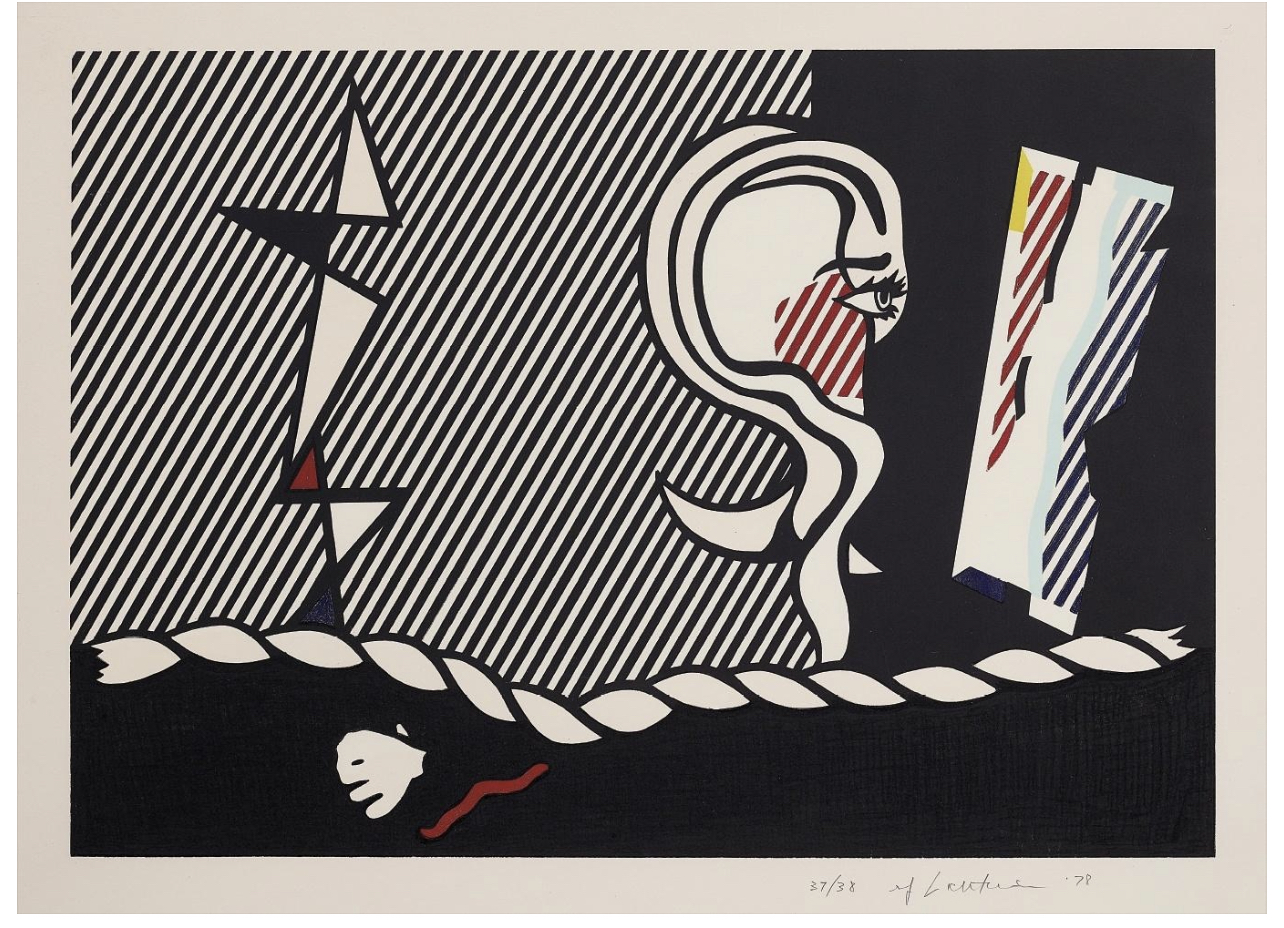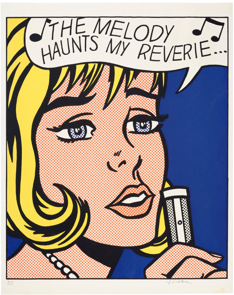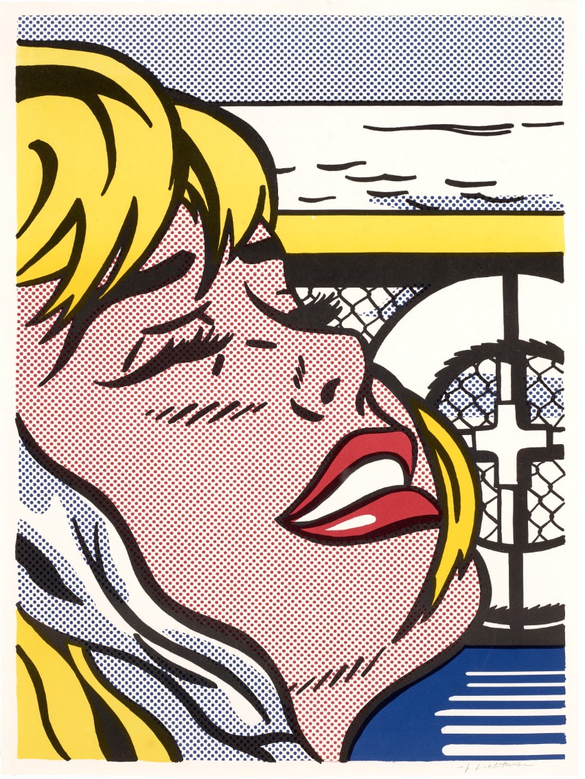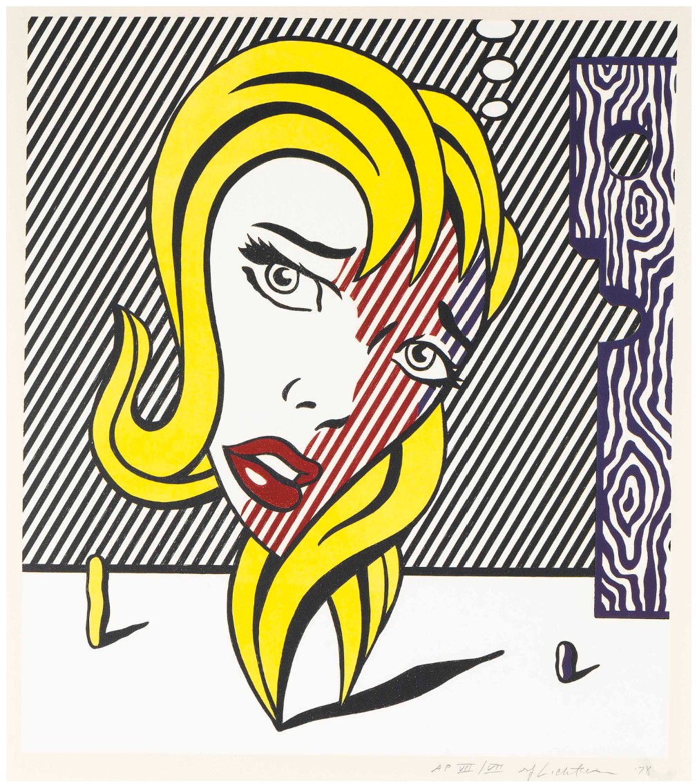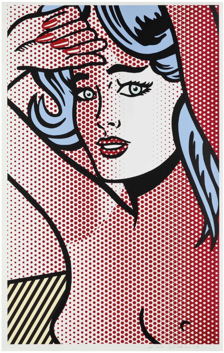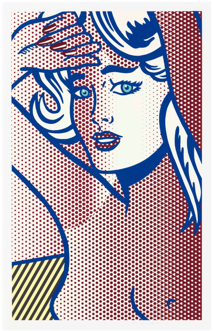 Crying Girl may be the most iconic print created by Roy Lichtenstein. It was originally made as an invitation to Roy Lichtenstein’s show in New York at the Leo Castelli Gallery. Aside from the invitations which was folded in four, Lichtenstein kept some and signed them. Crying Girl looks out of the corner of her eyes to the right and holds her hands to her mouth as if muffling a gasp. Tears bead out of the corner of her eyes, leading the viewer to wonder why…
